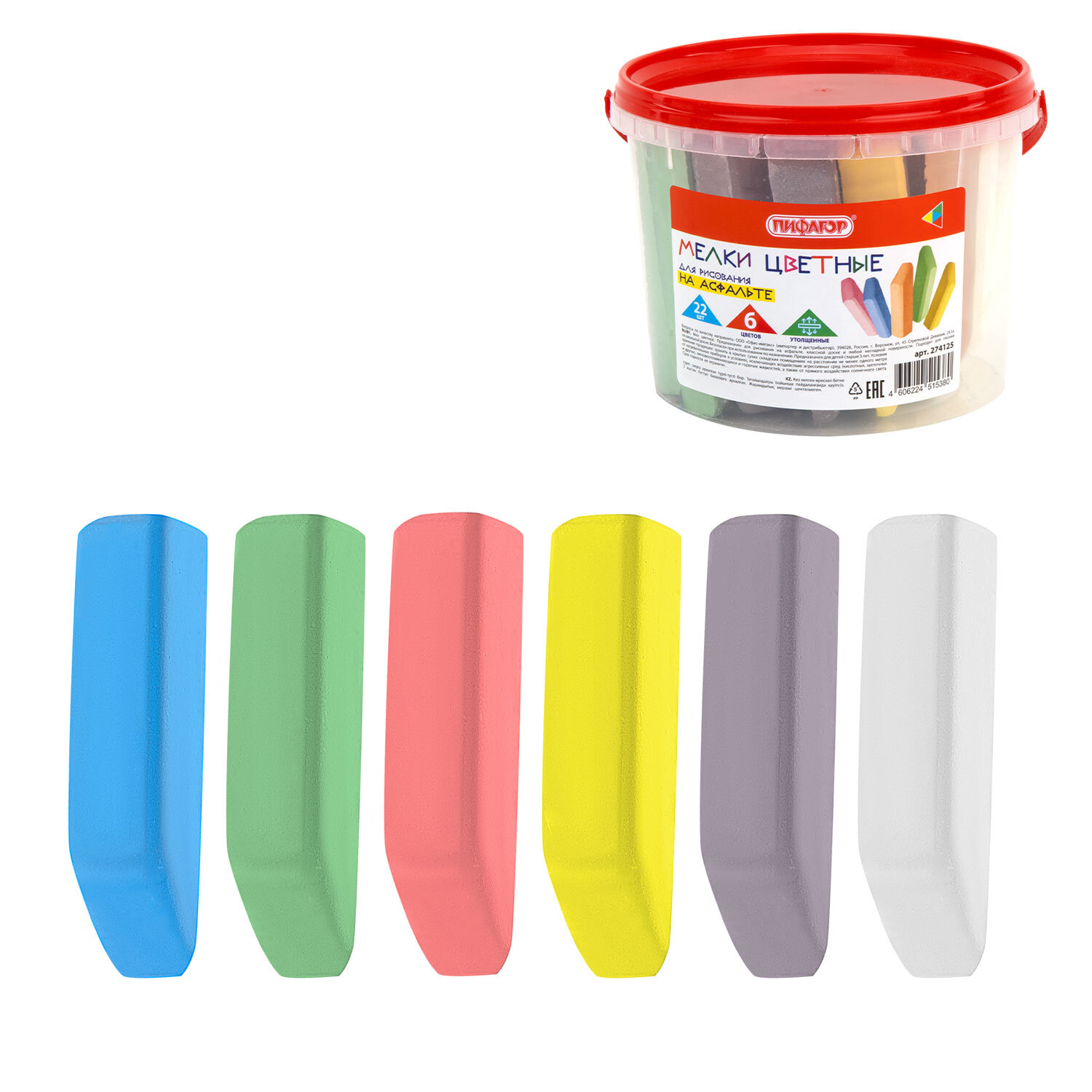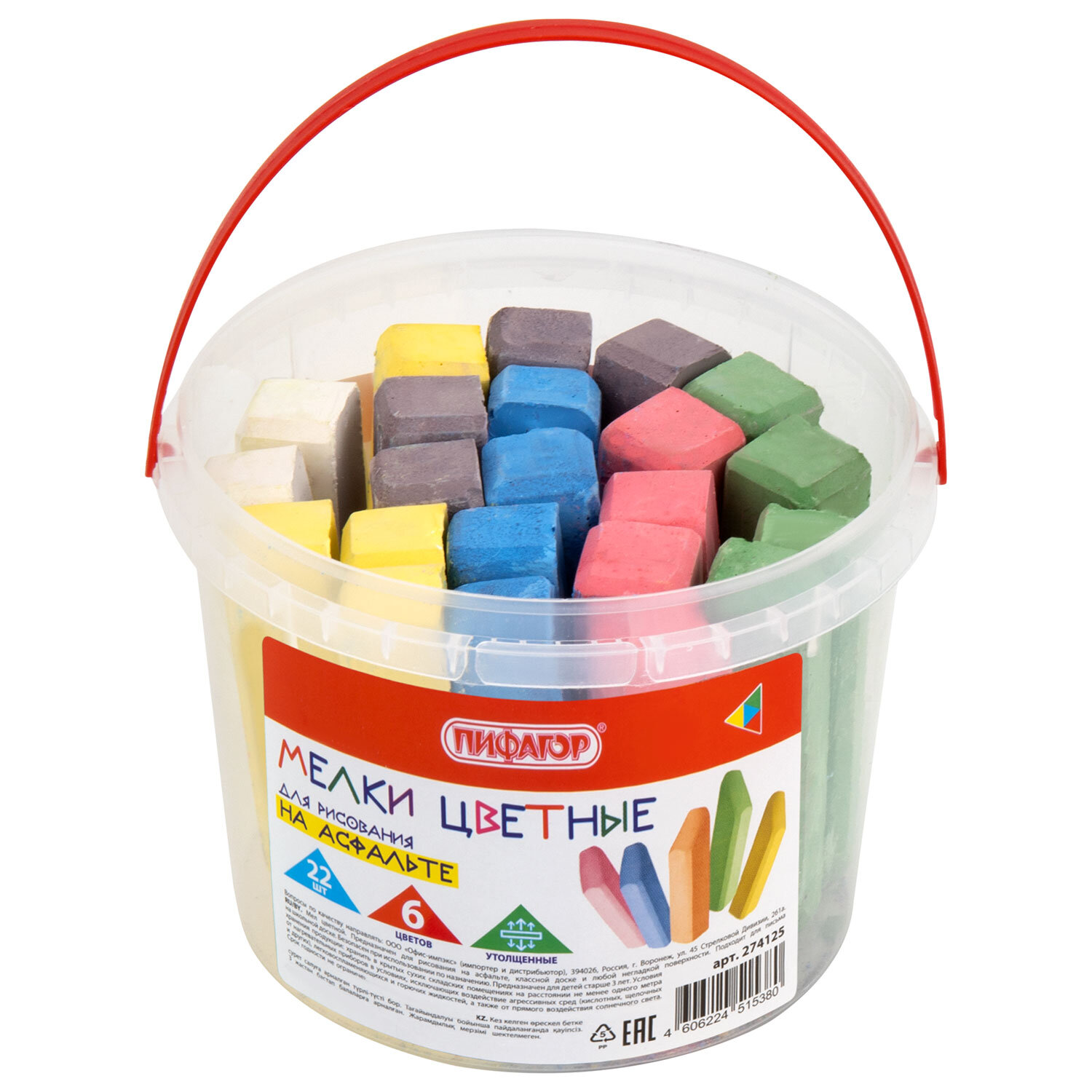 Мел в ведерке для рисования на асфальте 22 штуки, ПИФАГОР, цветной квадратный УТОЛЩЕННЫЙ Код товара: 274125 300,93 ₽ Купить Производитель:ПИФАГОР Цветной мел ПИФАГОР подходит для рисования на асфальте. В наборе 22 ярких мелка шести различных цветов: голубой, зеленый, желтый, красный, оранжевый, белый. Благодаря квадратной утолщенной форме с заостренным концом мел удобно ложится в руку и рисует на асфальте. Изготовлен из высококачественного природного сырья без добавления гипса, нетоксичен. Легко смывается с рук. Мел упакован в пластиковое ведерко – идеально, чтобы хранить мел или брать его с собой.Производство: РоссияЦвет: ассортиНазначение: для асфальтаКоличество в упаковке: 22 шт.Количество цветов: 6Форма корпуса: квадратнаяСерия: outdoorДлина: 7 ммДиаметр: 1.5 ммТвердость: твердыйУпаковка: пластиковое ведроВес: 514 грРазмер упаковки: 9.3 × 12.5 × 12.5 смОбъём: 0.0017 м3Промежуточная упаковка: 18 штТранспортная упаковка: 18 штШтрих-код: 4606224515380 Сертификат-1.jpg Сертификат-2.jpg Сертификат-3.jpg
