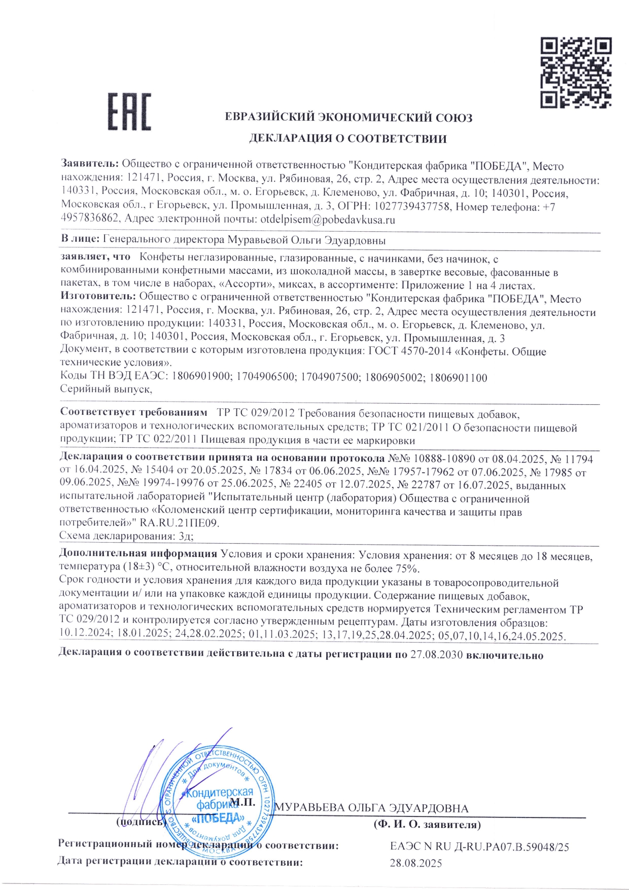 Конфеты ПОБЕДА ВКУСА "Трюфели шоколадные" БЕЗ САХАРА, посыпанные какао, 1000 г, пакет Код товара: 622664 2 090,41 ₽ Купить Производитель:ПОБЕДА ВКУСА Шоколадные трюфели ПОБЕДА ВКУСА без добавления сахара. В основе каждой конфеты — нежнейшее «сердце» из шоколада и сливок. Трюфели посыпаны ароматным темным какао. Сахар заменен на натуральный подсластитель — экстракт стевии, «медовой травы». Стевия по вкусу гораздо слаще сахара, при этом в ней нет сахара.Производство: РоссияВес нетто: 1000 гСерия: Трюфель без сахараУпаковка: мягкий пакетВесовые: даВкус: шоколадныйСрок годности: 12 мес.Фирма-производитель: КФ "ПОБЕДА"Срок годности: 12 месВес: 1,08 кгРазмер упаковки: 6 × 30.1 × 20 смОбъём: 0.0047 м3Промежуточная упаковка: 3 штТранспортная упаковка: 3 штШтрих-код: 4660013948285 Файлы Сертификат-1.jpg Сертификат-2.jpg Сертификат-3.jpg Сертификат-4.jpg Сертификат-5.jpg Сертификат-6.jpg Сертификат-7.jpg