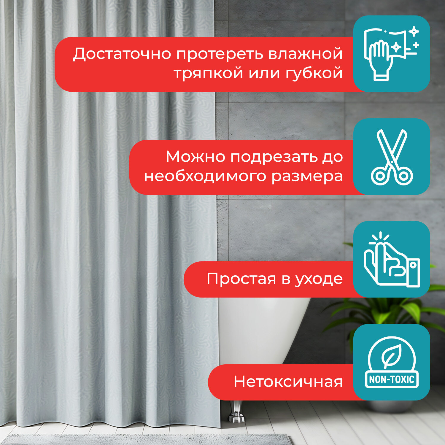 Шторка для ванной EVA, 180х180 см, кольца в комплекте, СЕРАЯ ГОЛОГРАФИЯ, PRIMILA (ПРИМИЛА) Код товара: 700104 349,37 ₽ Купить Производитель:PRIMILA Шторка для ванной комнаты PRIMILA – залог чистоты и уюта ванной комнаты. Используется для защиты пола, стен, мебели и зеркала от брызг. Эта шторка идеально впишется в любой интерьер. Шторка для ванной PRIMILA изготовлена из качественного, практичного, износостойкого, абсолютно нетоксичного материала EVA, что гарантирует отсутствие заломов и водонепроницаемость. Быстро сохнет, не шуршит, без запаха и приятная на ощупь. Шторка максимально проста в уходе – достаточно протереть ее влажной губкой. В комплекте со шторкой идут 12 прочных полипропиленовых колец, которые подойдут под любой тип карниза. • Основные характеристики: - Размер: 180х180 см. - Цвет: серый. - Материал: EVA. - Плотность шторки: 95 г/м2. • Основные преимущества: - Устойчива к плесени. - Легко вписывается в любой интерьер. - Не требует сложного ухода. - Долговечна и практична в использовании. - Безопасна для здоровья.Производство: КитайРазмер (ДхШ): 180х180 смНаличие колец в комплекте: даВид принта: ФактурныйДизайн: Серая голографияВодонепроницаемая: даВодоотталкивающая: даОсобенности: 3D эффект / 3D кольцаПлотность материала: 95 г/м2Материал: EVAЦвет: серыйВес: 404 грРазмер упаковки: 2.3 × 30.4 × 22.5 смОбъём: 0.0014 м3Промежуточная упаковка: 72 штТранспортная упаковка: 72 штШтрих-код: 4606224467146 Сертификат-1.jpg Сертификат-2.jpg Сертификат-3.jpg