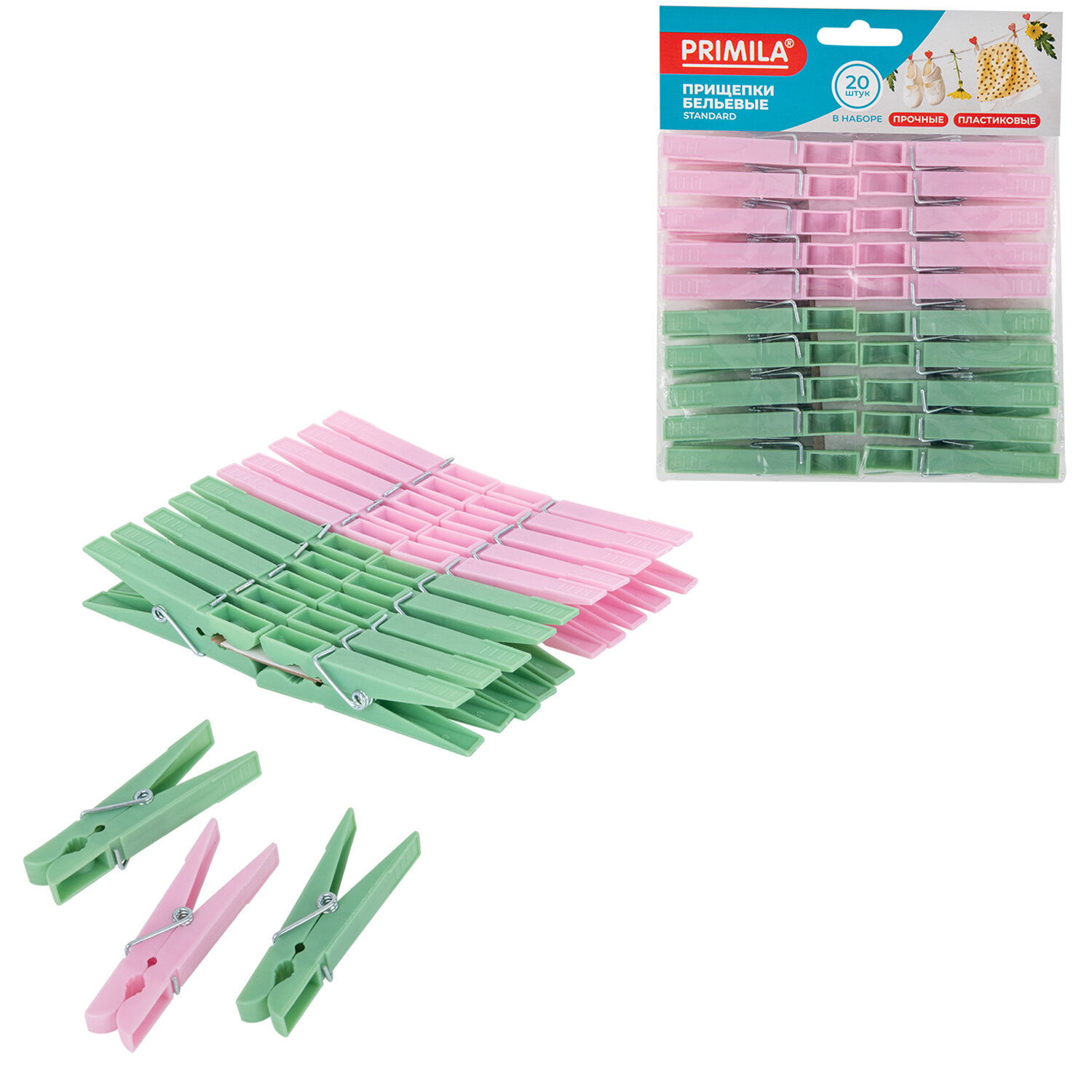 Прищепки бельевые 7,4 см, КОМПЛЕКТ 20 штук, пластик, ассорти, PRIMILA (ПРИМИЛА) STANDARD Код товара: 700517 115,79 ₽ Купить Производитель:PRIMILA Прищепки бельевые PRIMILA STANDARD – лучшее решение для максимально эффективной сушки белья. Универсальны в применении – подходят для улицы, дома, дачи, бассейна, саун и других помещений. Выбирайте комфорт и практичность с прищепками PRIMILA! Прищепки бельевые PRIMILA STANDARD – прочное и долговечное решение для сушки вашего белья. Изготовлены из высококачественного, устойчивого к ультрафиолету пластика, они не деформируются под воздействием солнечных лучей и не окрашивают ткани. Прищепки оснащены прочными пружинами для надежного крепления, обеспечивают равномерное распределение нагрузки и не оставляют следов на одежде. Легкие, удобные в использовании и подходящие для частой эксплуатации прищепки – ваш прекрасный выбор! Основные преимущества прищепок для белья PRIMILA: • Прищепки выполнены из прочного пластика, что позволит использовать изделие максимально долго. • Прочная оцинкованная пружина не заржавеет и обеспечит надежную фиксацию белья во время сушки. • Универсальны в своем применении – подходят не только для домашнего использования, но и для дачи, бассейна, сауны и других помещений, а также улицы. Основные характеристики: • Размер одной прищепки – 7,4х1 см. • Материал – полипропилен. • Пружина из оцинкованной стали. • Выполнены в нейтральных пастельных цветах.Производство: КитайТип товара: Прищепки для бельяКоличество в комплекте: 20 шт.Высота прищепки: 7.4 смМатериал: полипропиленЦвет: ассортиВид крепления: пружинныйВес 1 штуки: 4.3 гСерия: STANDARDУпаковка: пакет с европодвесомВес: 118 грРазмер упаковки: 2.2 × 15.6 × 13 смОбъём: 0.0005 м3Промежуточная упаковка: 60 штТранспортная упаковка: 60 штШтрих-код: 4606224486277 Сертификат-1.jpg Сертификат-2.jpg Сертификат-3.jpg
