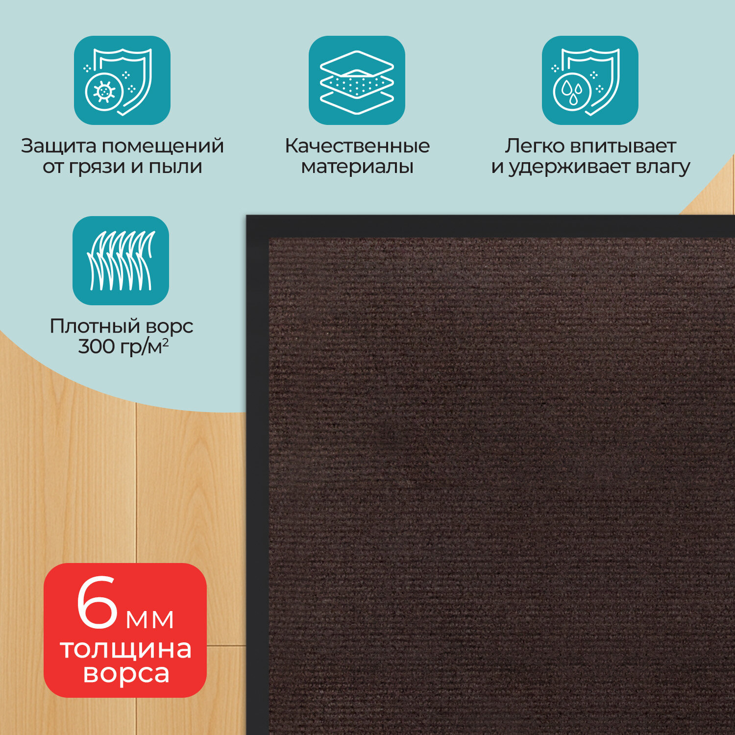 Коврик придверный 40х60 см, КОРИЧНЕВЫЙ, влаго-грязезащитный, 300 г/м2, рубчик, PRIMILA (ПРИМИЛА) STANDARD Код товара: 701014 308,19 ₽ Купить Производитель:PRIMILA Коврик входной влаго-грязезащитный PRIMILA STANDARD – надежное решение для поддержания чистоты и комфорта в помещении. Коврик станет надежным барьером между улицей и вашим уютным пространством. Коврик влаго-грязезащитный PRIMILA STANDARD – надежный барьер на пути грязи и влаги, предотвращает их попадание в ваш дом или офис. Изготовлен из высококачественного, износостойкого синтетического волокна. Коврик способен выдерживать интенсивную эксплуатацию, не теряя своих свойств. Идеально подходит для использования в прихожей, коридоре или на крыльце. С резиновыми бортиками и прочным нескользящим основанием этот коврик не только легко моется, но и надежно удерживается на полу, предотвращает скольжение и возможные травмы при падении. Основные преимущества: • Высокая впитывающая способность: коврик изготовлен из специальных материалов, которые эффективно поглощают влагу и грязь, предотвращая их распространение по вашему дому. • Антискользящее основание: благодаря прорезиненной основе коврик надежно фиксируется на поверхности, обеспечивая безопасность и комфорт при использовании. • Устойчивость к износу: изготовленный из прочных и долговечных материалов коврик сохраняет свой первоначальный вид даже при интенсивной эксплуатации. • Легкость в уходе: коврик легко чистится – достаточно пропылесосить или промыть под струей воды, чтобы вернуть ему первозданный вид. Основные характеристики: Размер – 40х60 см. Толщина – 6 мм. Ворс изготовлен из синтетического волокна. Коврик выполнен в коричневом цвете. Во избежание скольжения рекомендуется укладывать коврик на чистую увлажненную поверхность (пыль и песок повышают вероятность скольжения ковра). Рекомендации, которые на 100% исключат скольжение ковра на любых напольных покрытиях: 1. Применить противоскользящую ленту. Её наклеивают по периметру коврика с обратной (изнаночной) стороны. 2. Использовать силиконовые наклейки. Они крепятся с изнаночной стороны в углы коврика (обычно нужно 4 наклейки на один коврик). 3. Применить резиновый клей. Им промазывают всю поверхность коврика, при этом и коврик, и кафель в момент приклеивания должны быть сухими и чистыми. Или использовать любой двусторонний скотч. 4. Использовать фиксаторы для ковров. Это специально разработанные подушечки, которые можно поместить под углы коврика. Обычно они состоят из двух частей – липкой, которая приклеивается к подложке коврика, и рельефной, которая прижимается к полу. 5. Использовать липучки для ковров. Одну сторону липучки прикрепляют к изнанке ковра, а другую – к полу. При сжатии застёжки-липучки создают прочное соединение, препятствующее скольжению.Производство: РоссияНазначение: влаго-грязезащитныйДлина: 60 смШирина: 40 смТолщина: 6 ммМатериал: ворсМатериал ворса: синтетическое волокноМетод производства: иглопробивныеДизайн: мелкоребристыйАнтискользящее основание: даВорсовое покрытие с ребристой текстурой: даЦвет: коричневыйВес: 412 грРазмер упаковки: 5.6 × 40 × 6.2 смОбъём: 0.0016 м3Промежуточная упаковка: 40 штТранспортная упаковка: 40 штШтрих-код: 4606224505527 Сертификат-1.jpg Сертификат-2.jpg Сертификат-3.jpg
