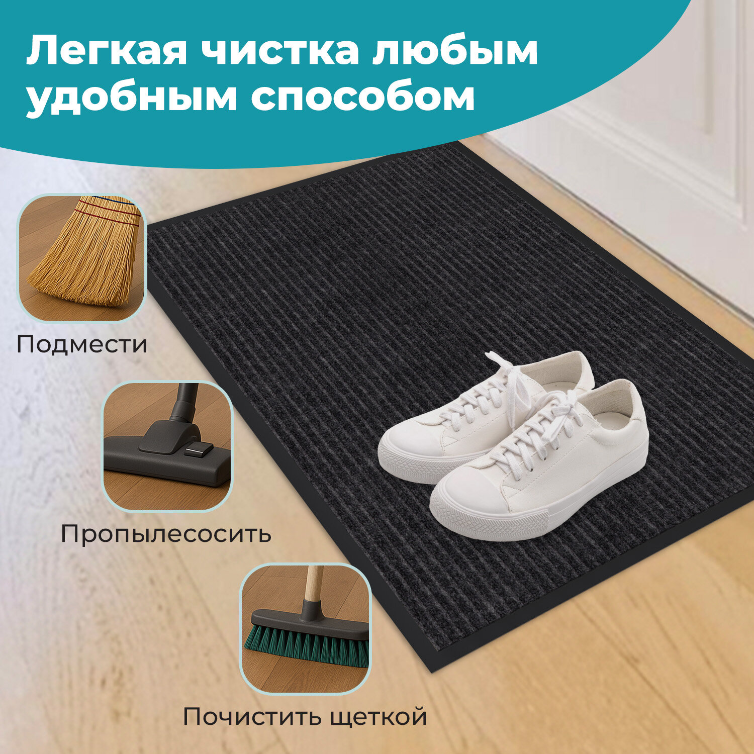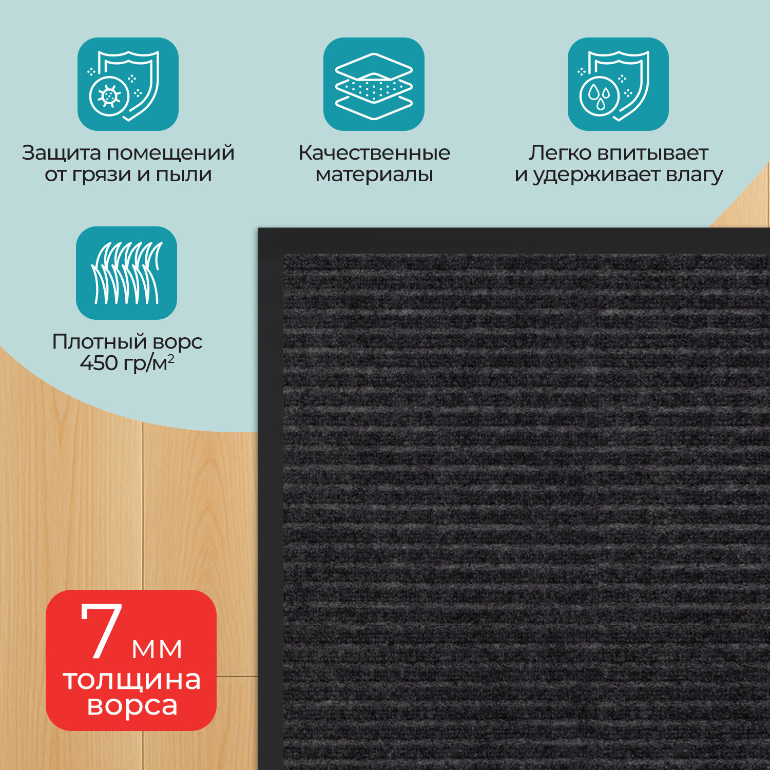 Коврик придверный 40х60 см, ЧЕРНЫЙ, влаго-грязезащитный, 450 г/м2, ребристый, PRIMILA (ПРИМИЛА) EXTRA Код товара: 701027 348,26 ₽ Купить Производитель:PRIMILA Коврик входной влаго-грязезащитный PRIMILA EXTRA – надежное решение для поддержания чистоты и комфорта в помещении. Коврик станет надежным барьером между улицей и вашим уютным пространством. Коврик влаго-грязезащитный PRIMILA EXTRA – надежный барьер на пути грязи и влаги, предотвращает их попадание в ваш дом или офис. Изготовлен из высококачественного, износостойкого синтетического волокна. Коврик способен выдерживать интенсивную эксплуатацию, не теряя своих свойств. Идеально подходит для использования в прихожей, коридоре или на крыльце. С резиновыми бортиками и прочным нескользящим основанием этот коврик не только легко моется, но и надежно удерживается на полу, предотвращает скольжение и возможные травмы при падении. Основные преимущества: • Высокая впитывающая способность: коврик изготовлен из специальных материалов, которые эффективно поглощают влагу и грязь, предотвращая их распространение по вашему дому. • Антискользящее основание: благодаря прорезиненной основе коврик надежно фиксируется на поверхности, обеспечивая безопасность и комфорт при использовании. • Устойчивость к износу: изготовленный из прочных и долговечных материалов коврик сохраняет свой первоначальный вид даже при интенсивной эксплуатации. • Легкость в уходе: коврик легко чистится – достаточно пропылесосить или промыть под струей воды, чтобы вернуть ему первозданный вид. Основные характеристики: Размер – 40х60 см. Толщина – 7 мм. Ворс изготовлен из синтетического волокна. Коврик выполнен в черном цвете. Во избежание скольжения рекомендуется укладывать коврик на чистую увлажненную поверхность (пыль и песок повышают вероятность скольжения ковра). Рекомендации, которые на 100% исключат скольжение ковра на любых напольных покрытиях: 1. Применить противоскользящую ленту. Её наклеивают по периметру коврика с обратной (изнаночной) стороны. 2. Использовать силиконовые наклейки. Они крепятся с изнаночной стороны в углы коврика (обычно нужно 4 наклейки на один коврик). 3. Применить резиновый клей. Им промазывают всю поверхность коврика, при этом и коврик, и кафель в момент приклеивания должны быть сухими и чистыми. Или использовать любой двусторонний скотч. 4. Использовать фиксаторы для ковров. Это специально разработанные подушечки, которые можно поместить под углы коврика. Обычно они состоят из двух частей – липкой, которая приклеивается к подложке коврика, и рельефной, которая прижимается к полу. 5. Использовать липучки для ковров. Одну сторону липучки прикрепляют к изнанке ковра, а другую – к полу. При сжатии застёжки-липучки создают прочное соединение, препятствующее скольжению.Производство: РоссияНазначение: влаго-грязезащитныйДлина: 60 смШирина: 40 смТолщина: 7 ммМатериал: ворсМатериал ворса: синтетическое волокноМетод производства: иглопробивныеДизайн: ребристыйАнтискользящее основание: даВорсовое покрытие с ребристой текстурой: даЦвет: черныйВес: 507 грРазмер упаковки: 7.3 × 40.1 × 8.2 смОбъём: 0.0026 м3Промежуточная упаковка: 24 штТранспортная упаковка: 24 штШтрих-код: 4606224505657 Сертификат-1.jpg Сертификат-2.jpg Сертификат-3.jpg
