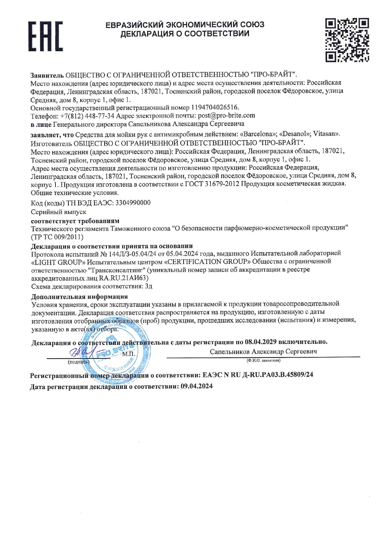 Состав: вода, увлажнители, ЧАС (алкилбензилдиметиламмоний хлорид до 5%, дидецилдиметиламмониум хлорид до 5%),.