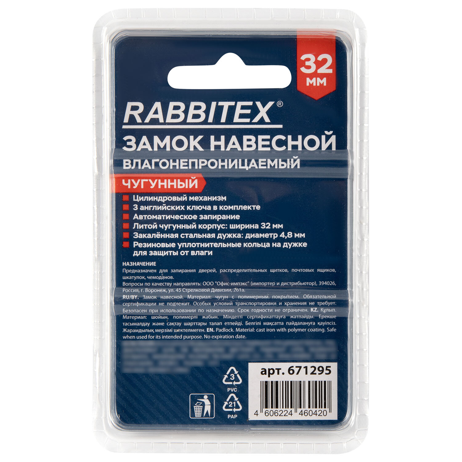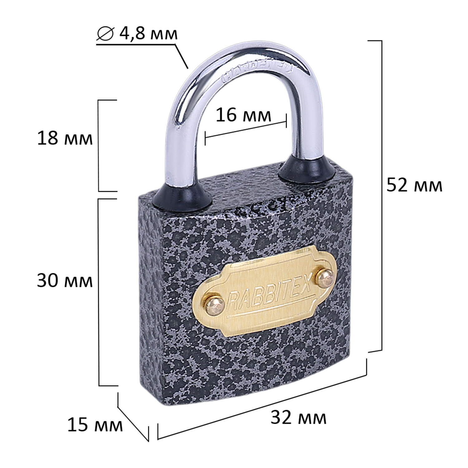 Замок навесной чугунный "Влагонепроницаемый", ширина 32 мм, полимерное покрытие, английский, 3 ключа, RABBITEX (РАББИТЕКС) Код товара: 671295 163,46 ₽ Купить Производитель:RABBITEX Замок навесной RABBITEX с цилиндровым механизмом секретности предназначен для запирания дверей, распределительных щитков, почтовых ящиков, шкатулок, чемоданов. Достаточно прост по конструкции и надёжен в повседневной эксплуатации. Замок навесной имеет литой чугунный корпус и оснащен полукруглой дужкой из закаленной стали, что делает его прочным и увеличивает сопротивляемость к взлому. Тип механизма секретности – цилиндровый. Три английских ключа в комплекте. Замок запирается автоматически (без использования ключа) при нажатии на дужку сверху, что облегчает его эксплуатацию. Небольшие размеры замка и толщина дужки позволяют использовать его в качестве замка для чемоданов, дорожных сумок, ящиков, шкафов, почтовых ящиков и распределительных щитков. Резиновые уплотнительные кольца на концах дужки защищают от попадания влаги внутрь, что препятствует коррозии. Благодаря им замок можно использовать на улице, не опасаясь влаги, дождя и снега. Размеры замка: ширина 32 мм, высота 52 мм, толщина 15 мм. Диаметр дужки: 4,8 мм. Внутреннее расстояние между дужками: 16 мм. Внутренняя высота дужки (в закрытом виде): 18 мм. Количество ключей: 3. Размер ключей: 38x17x1,4 мм. Упаковка: двойной блистер с европодвесом.Производство: КитайТип ключа: английскийКоличество ключей в комплекте: 3 шт.Материал корпуса: чугунОсобенности: автоматическая система запирания, всепогодныйДиаметр дужки: 4.8 ммШирина замка: 32 ммСерия: ВсепогодныйТип замка: навеснойВысота замка: 52 ммГлубина замка: 15 ммВес: 80 гТип упаковки: блистерРазмер упаковки: 2.3 × 11.5 × 6.9 смОбъём: 0.0002 м3Промежуточная упаковка: 12 штТранспортная упаковка: 120 штШтрих-код: 4606224460420 Файлы Сертификат-1.jpg Сертификат-2.jpg Сертификат-3.jpg Сертификат-4.jpg Сертификат-5.jpg Сертификат-6.jpg Сертификат-7.jpg Сертификат-8.jpg Сертификат-9.jpg Сертификат-10.jpg Сертификат-11.jpg Сертификат-12.jpg Сертификат-13.jpg Сертификат-14.jpg Сертификат-15.jpg Сертификат-16.jpg Сертификат-17.jpg Сертификат-18.jpg Сертификат-19.jpg Сертификат-20.jpg Сертификат-21.jpg Сертификат-22.jpg Сертификат-23.jpg Сертификат-24.jpg Сертификат-25.jpg Сертификат-26.jpg