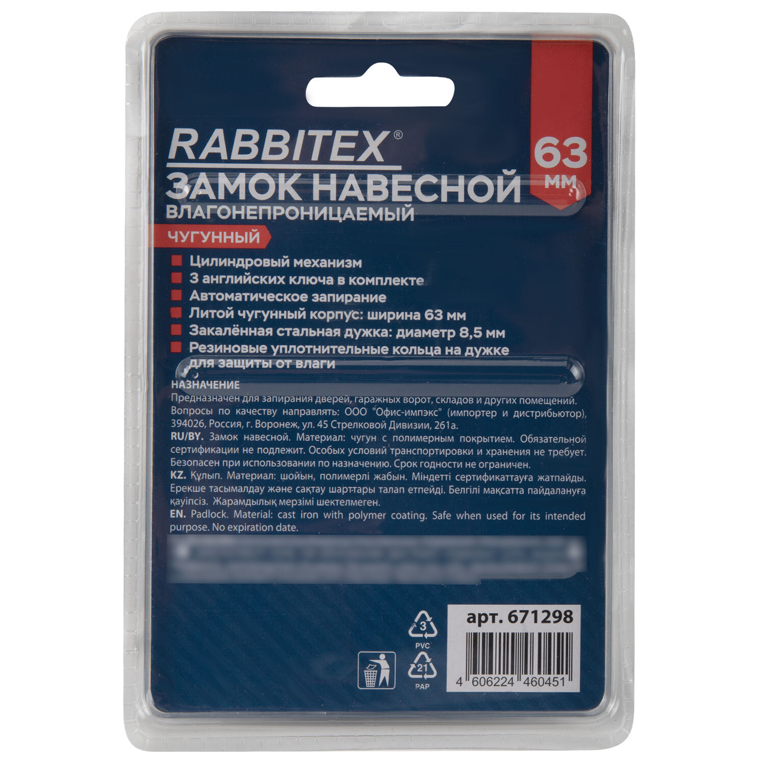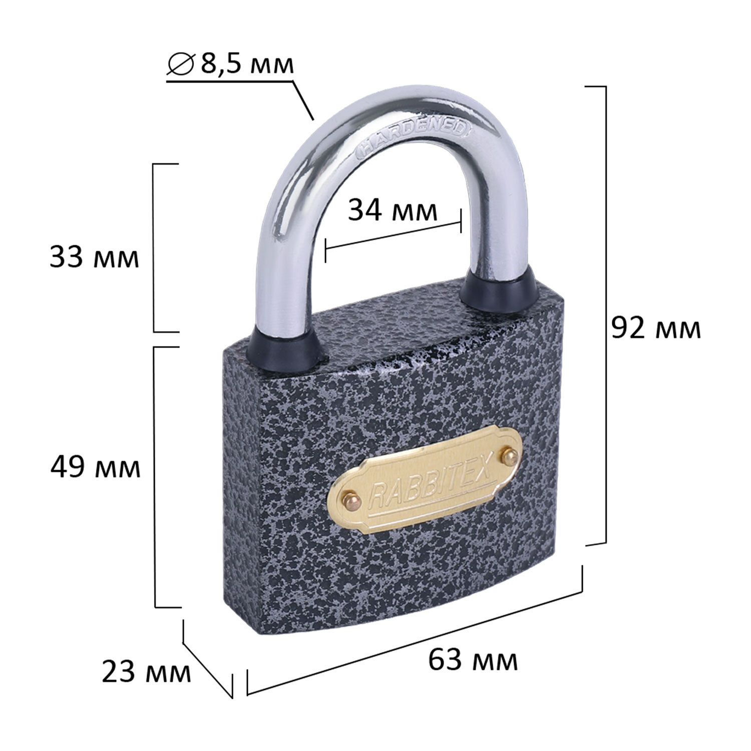 Замок навесной чугунный "Влагонепроницаемый", ширина 63 мм, полимерное покрытие, английский, 3 ключа, RABBITEX (РАББИТЕКС) Код товара: 671298 323,64 ₽ Купить Производитель:RABBITEX Замок навесной RABBITEX с цилиндровым механизмом секретности предназначен для запирания дверей, гаражных ворот, складов и других помещений. Достаточно прост по конструкции и надёжен в повседневной эксплуатации. Замок навесной имеет литой чугунный корпус и оснащен полукруглой дужкой из закаленной стали, что делает его прочным и увеличивает сопротивляемость к взлому. Тип механизма секретности – цилиндровый. Три английских ключа в комплекте. Замок запирается автоматически (без использования ключа) при нажатии на дужку сверху, что облегчает его эксплуатацию. Средние размеры замка и толщина дужки позволяют использовать его для запирания дверей, гаражных ворот, складов и других помещений. Резиновые уплотнительные кольца на концах дужки защищают от попадания влаги внутрь, что препятствует коррозии. Благодаря им замок можно использовать на улице, не опасаясь влаги, дождя и снега. Размеры замка: ширина 63 мм, высота 92 мм, толщина 23 мм. Диаметр дужки: 8,5 мм. Внутреннее расстояние между дужками: 34 мм. Внутренняя высота дужки (в закрытом виде): 33 мм. Количество ключей: 3. Размер ключей: 51x23x1,7 мм. Упаковка: двойной блистер с европодвесом.Производство: КитайТип ключа: английскийКоличество ключей в комплекте: 3 шт.Материал корпуса: чугунОсобенности: автоматическая система запирания, всепогодныйДиаметр дужки: 8.5 ммШирина замка: 63 ммСерия: ВсепогодныйТип замка: навеснойВысота замка: 92 ммГлубина замка: 23 ммВес: 420 гТип упаковки: блистерРазмер упаковки: 3 × 16 × 11 смОбъём: 0.0006 м3Промежуточная упаковка: 6 штТранспортная упаковка: 48 штШтрих-код: 4606224460451 Файлы Сертификат-1.jpg Сертификат-2.jpg Сертификат-3.jpg Сертификат-4.jpg Сертификат-5.jpg Сертификат-6.jpg Сертификат-7.jpg Сертификат-8.jpg Сертификат-9.jpg Сертификат-10.jpg Сертификат-11.jpg Сертификат-12.jpg Сертификат-13.jpg Сертификат-14.jpg Сертификат-15.jpg Сертификат-16.jpg Сертификат-17.jpg Сертификат-18.jpg Сертификат-19.jpg Сертификат-20.jpg Сертификат-21.jpg Сертификат-22.jpg Сертификат-23.jpg Сертификат-24.jpg Сертификат-25.jpg Сертификат-26.jpg