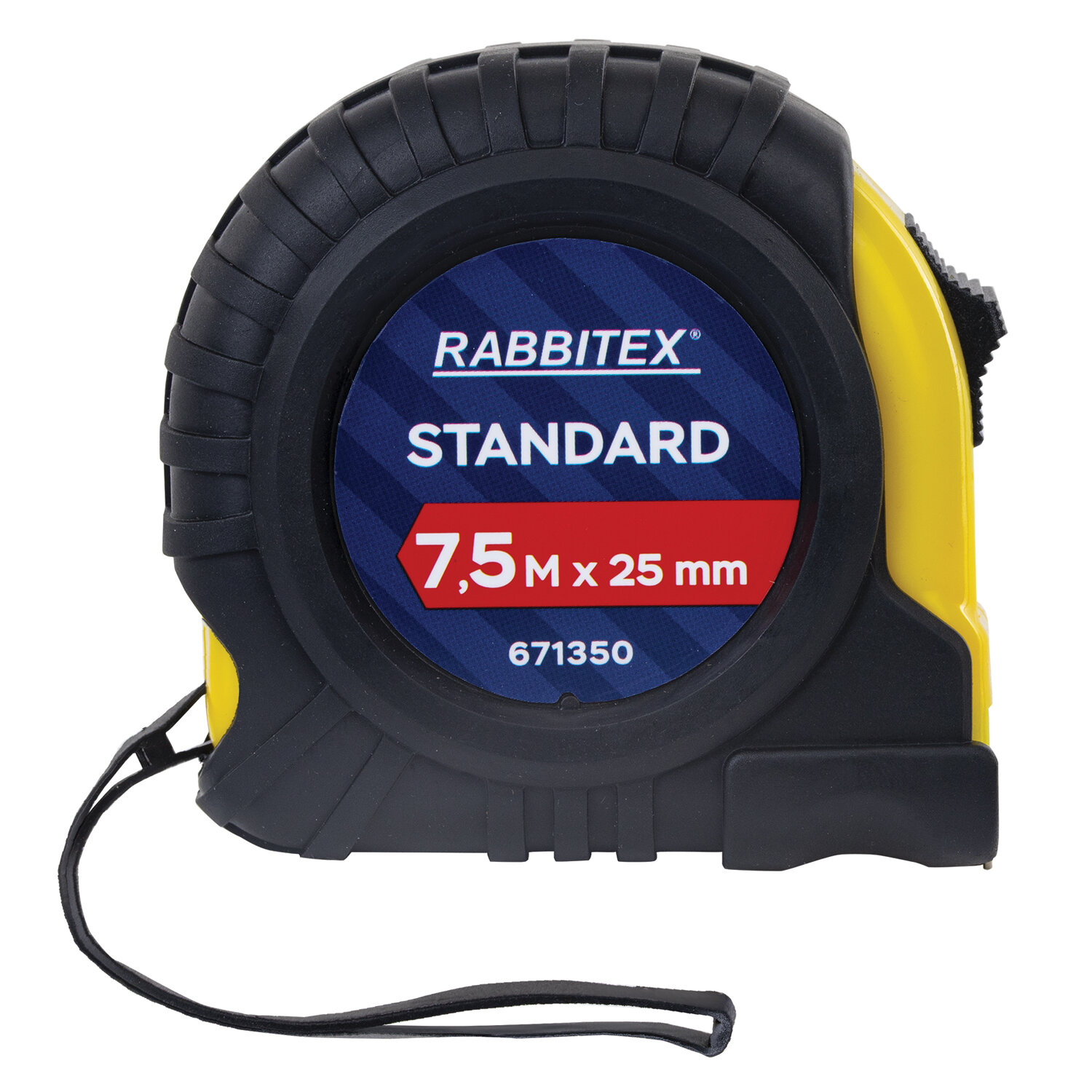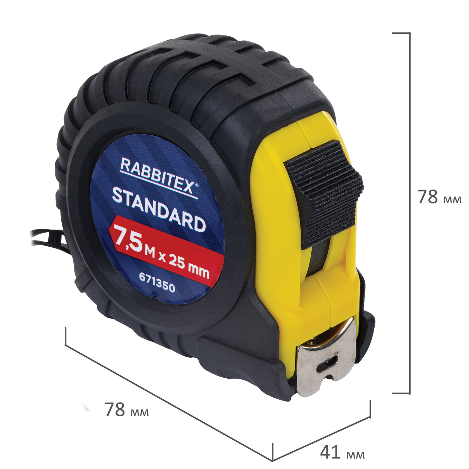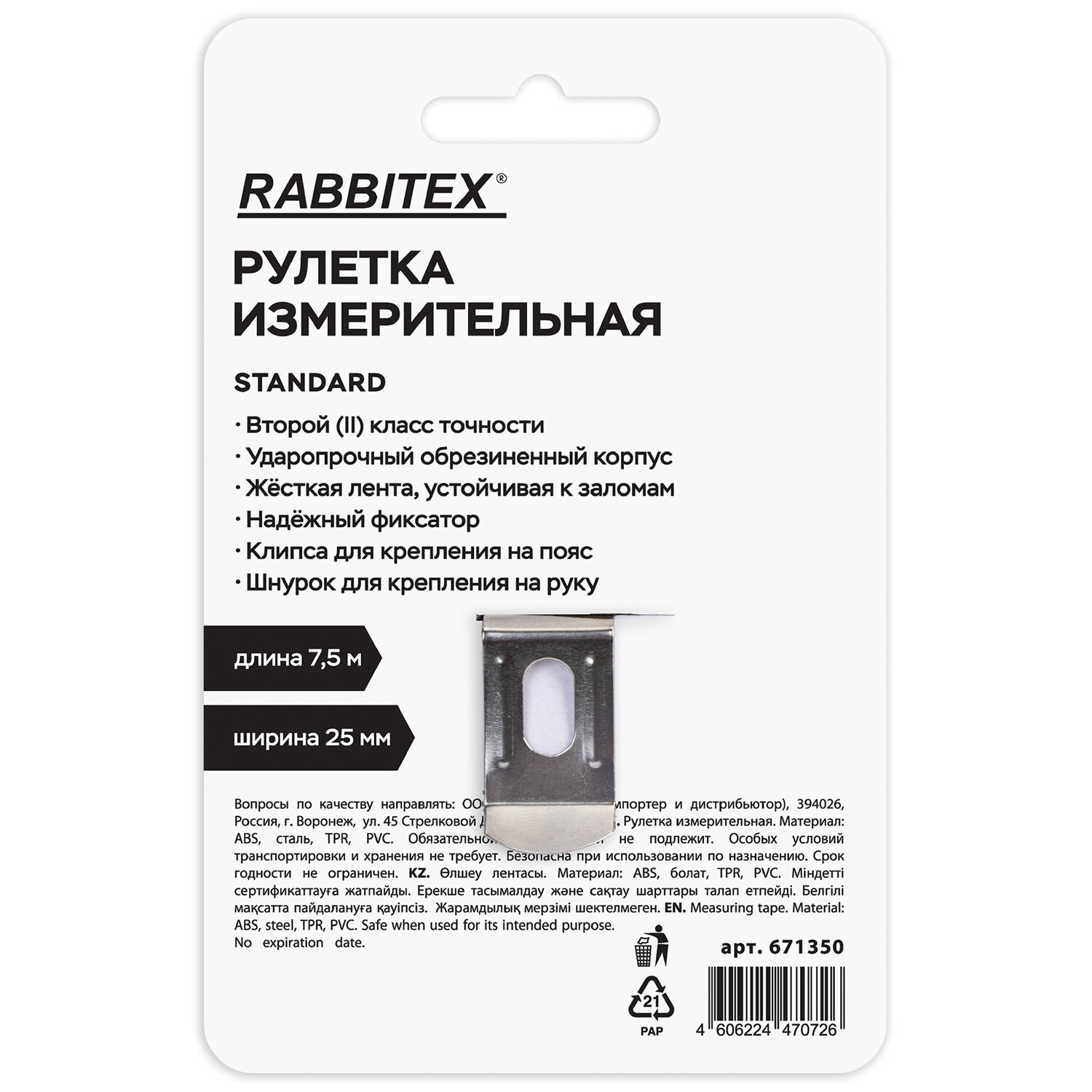 Рулетка измерительная 7,5 м х 25 мм, обрезиненный корпус, с фиксатором, RABBITEX (РАББИТЕКС) Standard Код товара: 671350 215,96 ₽ Купить Производитель:RABBITEX Рулетка RABBITEX применяется для измерения размеров поверхностей и расстояний. Благодаря эргономичному дизайну и высокому классу точности измерений рулетка станет незаменимым помощником в быту и профессиональной деятельности. Рулетка RABBITEX проста в обращении, обладает повышенной износостойкостью и долгим сроком службы. Корпус рулетки из прочного пластика с прорезиненным покрытием обеспечит защиту инструмента от повреждений при случайном падении. Измерительная лента с метрической шкалой II класса точности изготовлена из прочной углеродистой стали, устойчивой к заломам, и оснащена зацепом для удобства измерений. Рулетка оснащена ремешком для ношения на запястье, а также металлической клипсой для крепления на поясе. Эргономичный дизайн с вертикальным фиксатором измерительной ленты позволят использовать рулетку даже одной рукой. Материал корпуса: ABS-пластик с ПВХ-покрытием. Цвет корпуса: жёлтый с чёрным покрытием. Материал измерительной ленты: углеродистая сталь (S50C). Размеры измерительной ленты: длина 7,5 метров, ширина 25 миллиметров. Система измерения: метрическая. Цвет ленты: жёлтый. Фиксатор: вертикальный. Упаковка: бумажная карта с европодвесом.Производство: КитайВид рулетки: строительныйШирина ленты: 25 ммДлина ленты: 7.5 мСерия: StandardМатериал ленты: стальКоличество режимов фиксации: 1Цена деления: 1 ммКласс точности: 2Тип корпуса: закрытыйМатериал корпуса: пластикОбрезиненный корпус: даВес: 365 грРазмер упаковки: 4.5 × 14 × 8.9 смОбъём: 0.0005 м3Промежуточная упаковка: 6 штТранспортная упаковка: 60 штШтрих-код: 4606224470726 Файлы Сертификат-1.jpg Сертификат-2.jpg Сертификат-3.jpg Сертификат-4.jpg Сертификат-5.jpg Сертификат-6.jpg Сертификат-7.jpg Сертификат-8.jpg Сертификат-9.jpg Сертификат-10.jpg Сертификат-11.jpg Сертификат-12.jpg Сертификат-13.jpg Сертификат-14.jpg Сертификат-15.jpg Сертификат-16.jpg Сертификат-17.jpg Сертификат-18.jpg Сертификат-19.jpg Сертификат-20.jpg Сертификат-21.jpg Сертификат-22.jpg Сертификат-23.jpg Сертификат-24.jpg Сертификат-25.jpg Сертификат-26.jpg