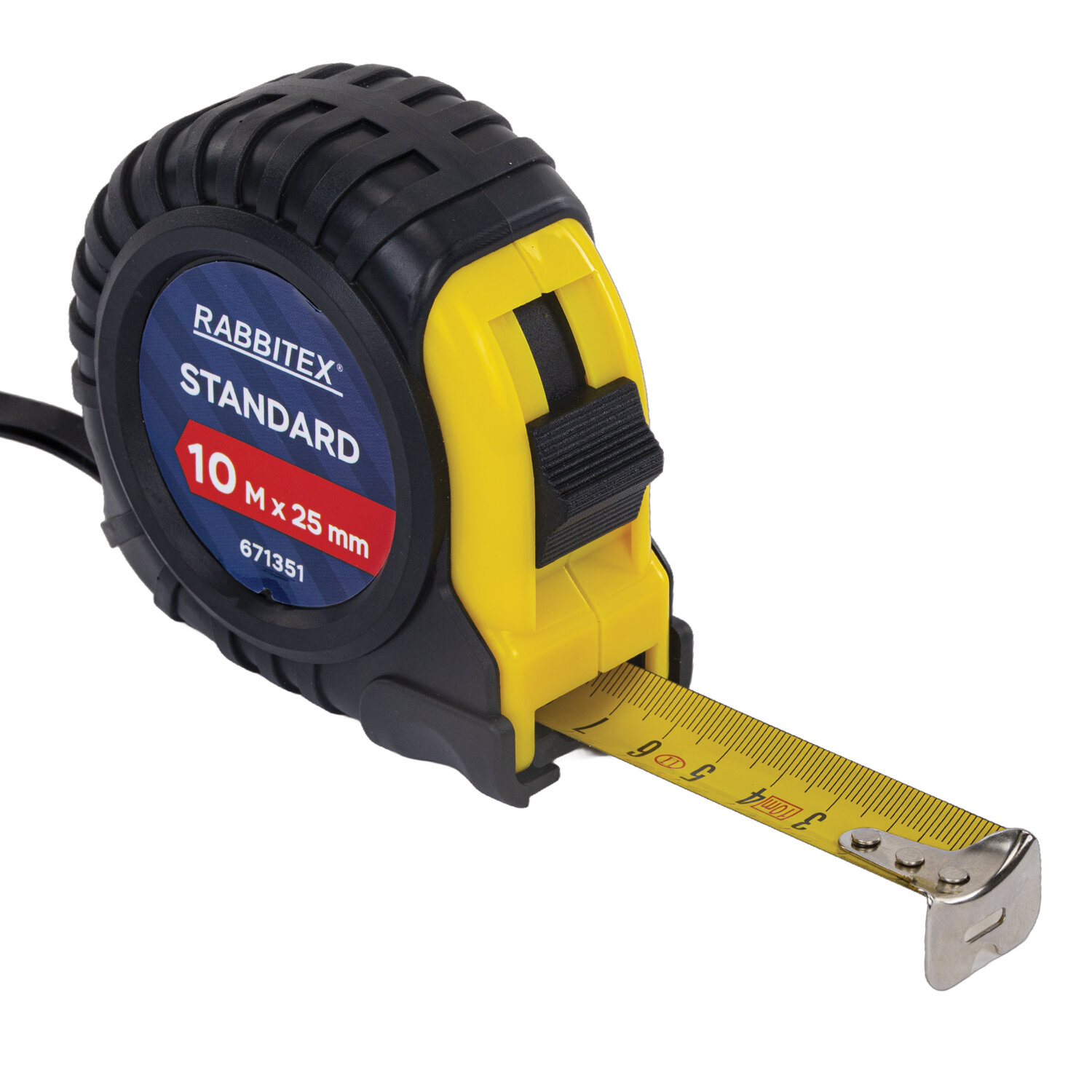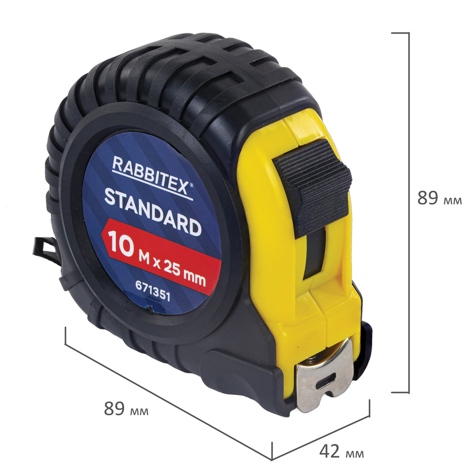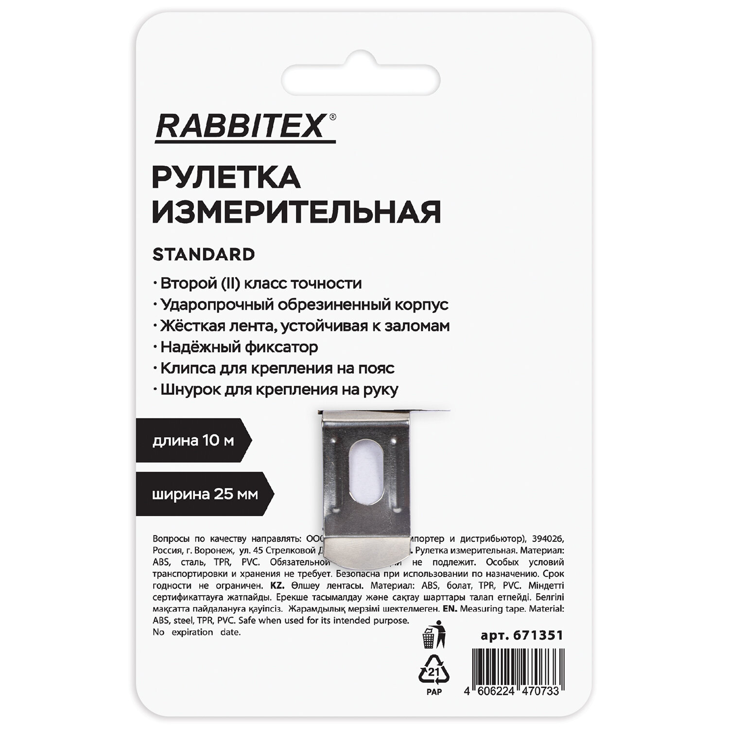 Рулетка измерительная 10 м х 25 мм, обрезиненный корпус, с фиксатором, RABBITEX (РАББИТЕКС) Standard Код товара: 671351 355,34 ₽ Купить Производитель:RABBITEX Рулетка RABBITEX применяется для измерения размеров поверхностей и расстояний. Благодаря эргономичному дизайну и высокому классу точности измерений рулетка станет незаменимым помощником в быту и профессиональной деятельности. Рулетка RABBITEX проста в обращении, обладает повышенной износостойкостью и долгим сроком службы. Корпус рулетки из прочного пластика с прорезиненным покрытием обеспечит защиту инструмента от повреждений при случайном падении. Измерительная лента с метрической шкалой II класса точности изготовлена из прочной углеродистой стали, устойчивой к заломам, и оснащена зацепом для удобства измерений. Рулетка оснащена ремешком для ношения на запястье, а также металлической клипсой для крепления на поясе. Эргономичный дизайн с вертикальным фиксатором измерительной ленты позволят использовать рулетку даже одной рукой. Материал корпуса: ABS-пластик с ПВХ-покрытием. Цвет корпуса: жёлтый с чёрным покрытием. Материал измерительной ленты: углеродистая сталь (S50C). Размеры измерительной ленты: длина 10 метров, ширина 25 миллиметров. Система измерения: метрическая. Цвет ленты: жёлтый. Фиксатор: вертикальный. Упаковка: бумажная карта с европодвесом.Производство: КитайВид рулетки: строительныйШирина ленты: 25 ммДлина ленты: 10 мСерия: StandardМатериал ленты: стальКоличество режимов фиксации: 1Цена деления: 1 ммКласс точности: 2Тип корпуса: закрытыйМатериал корпуса: пластикОбрезиненный корпус: даВес: 519 грРазмер упаковки: 4.7 × 14 × 9.3 смОбъём: 0.0006 м3Промежуточная упаковка: 6 штТранспортная упаковка: 60 штШтрих-код: 4606224470733 Файлы Сертификат-1.jpg Сертификат-2.jpg Сертификат-3.jpg Сертификат-4.jpg Сертификат-5.jpg Сертификат-6.jpg Сертификат-7.jpg Сертификат-8.jpg Сертификат-9.jpg Сертификат-10.jpg Сертификат-11.jpg Сертификат-12.jpg Сертификат-13.jpg Сертификат-14.jpg Сертификат-15.jpg Сертификат-16.jpg Сертификат-17.jpg Сертификат-18.jpg Сертификат-19.jpg Сертификат-20.jpg Сертификат-21.jpg Сертификат-22.jpg Сертификат-23.jpg Сертификат-24.jpg Сертификат-25.jpg Сертификат-26.jpg