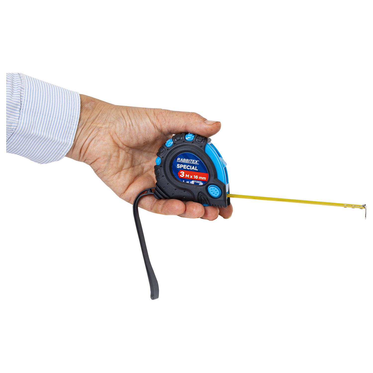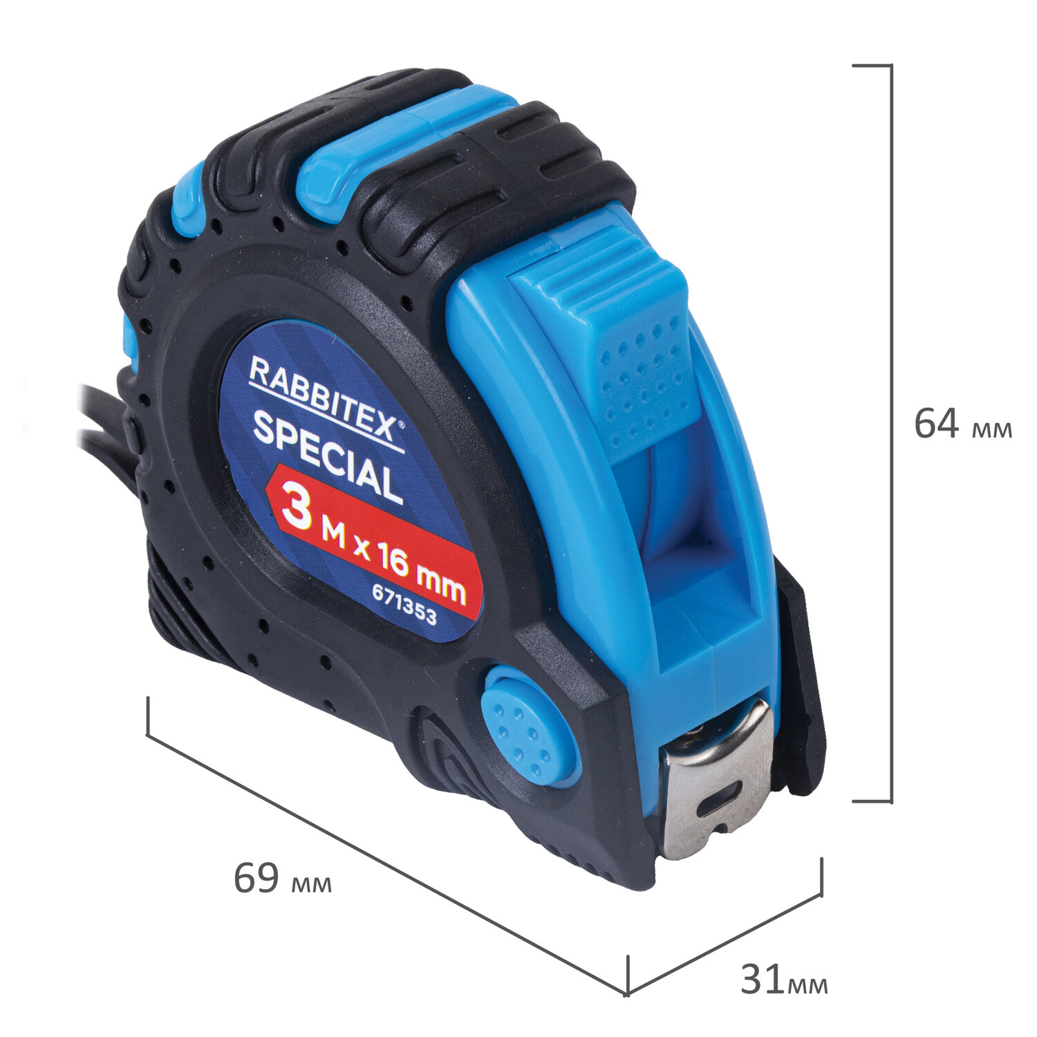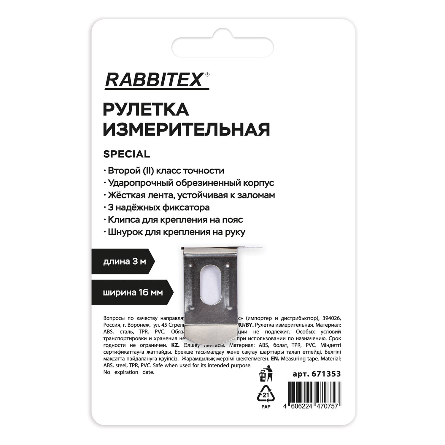 Рулетка измерительная 3 м х 16 мм, обрезиненный корпус, 3 фиксатора, RABBITEX (РАББИТЕКС) Special Код товара: 671353 81,11 ₽ Купить Производитель:RABBITEX Рулетка RABBITEX применяется для измерения размеров поверхностей и расстояний. Благодаря эргономичному дизайну и высокому классу точности измерений рулетка станет незаменимым помощником в быту и профессиональной деятельности. Рулетка RABBITEX проста в обращении, обладает повышенной износостойкостью и долгим сроком службы. Корпус рулетки из прочного пластика с прорезиненным покрытием обеспечит защиту инструмента от повреждений при случайном падении. Измерительная лента с метрической шкалой II класса точности изготовлена из прочной углеродистой стали, устойчивой к заломам, и оснащена зацепом для удобства измерений. Рулетка оснащена ремешком для ношения на запястье, а также металлической клипсой для крепления на поясе. Эргономичный дизайн с тремя фиксаторами измерительной ленты позволят использовать рулетку даже одной рукой. Материал корпуса: ABS-пластик с ПВХ-покрытием. Цвет корпуса: синий с чёрным покрытием. Материал измерительной ленты: углеродистая сталь (S50C). Размеры измерительной ленты: длина 3 метра, ширина 16 миллиметров. Система измерения: метрическая. Цвет ленты: жёлтый. Фиксаторы: вертикальный, боковой, нижний. Упаковка: бумажная карта с европодвесом.Производство: КитайВид рулетки: строительныйШирина ленты: 16 ммДлина ленты: 3 мСерия: SpecialМатериал ленты: стальКоличество режимов фиксации: 3Цена деления: 1 ммКласс точности: 2Тип корпуса: закрытыйМатериал корпуса: пластикОбрезиненный корпус: даВес: 150 грРазмер упаковки: 3.8 × 13.9 × 8.8 смОбъём: 0.0004 м3Промежуточная упаковка: 12 штТранспортная упаковка: 120 штШтрих-код: 4606224470757 Файлы Сертификат-1.jpg Сертификат-2.jpg Сертификат-3.jpg Сертификат-4.jpg Сертификат-5.jpg Сертификат-6.jpg Сертификат-7.jpg Сертификат-8.jpg Сертификат-9.jpg Сертификат-10.jpg Сертификат-11.jpg Сертификат-12.jpg Сертификат-13.jpg Сертификат-14.jpg Сертификат-15.jpg Сертификат-16.jpg Сертификат-17.jpg Сертификат-18.jpg Сертификат-19.jpg Сертификат-20.jpg Сертификат-21.jpg Сертификат-22.jpg Сертификат-23.jpg Сертификат-24.jpg Сертификат-25.jpg Сертификат-26.jpg