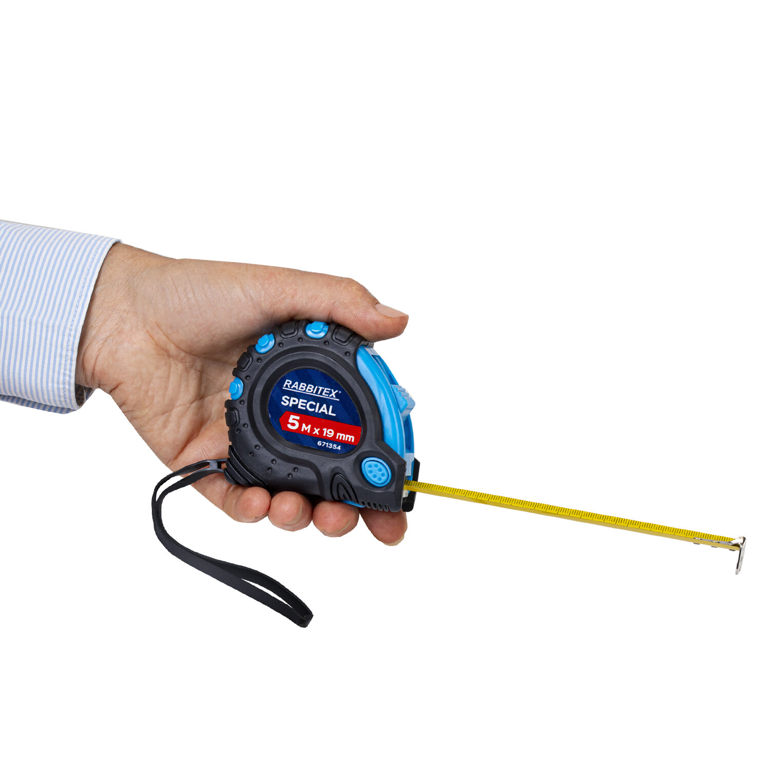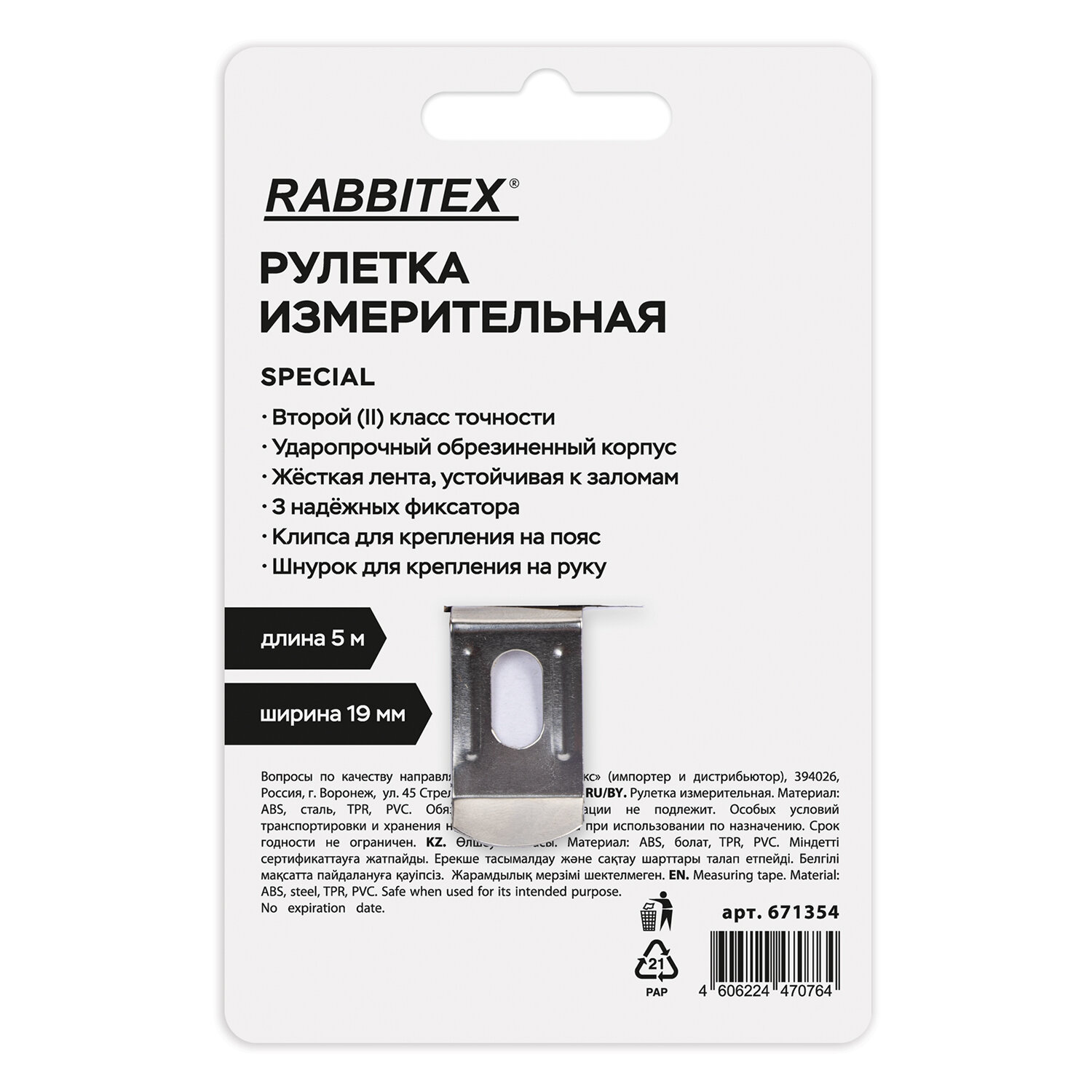 Рулетка измерительная 5 м х 19 мм, обрезиненный корпус, 3 фиксатора, RABBITEX (РАББИТЕКС) Special Код товара: 671354 161,11 ₽ Купить Производитель:RABBITEX Рулетка RABBITEX применяется для измерения размеров поверхностей и расстояний. Благодаря эргономичному дизайну и высокому классу точности измерений рулетка станет незаменимым помощником в быту и профессиональной деятельности. Рулетка RABBITEX проста в обращении, обладает повышенной износостойкостью и долгим сроком службы. Корпус рулетки из прочного пластика с прорезиненным покрытием обеспечит защиту инструмента от повреждений при случайном падении. Измерительная лента с метрической шкалой II класса точности изготовлена из прочной углеродистой стали, устойчивой к заломам, и оснащена зацепом для удобства измерений. Рулетка оснащена ремешком для ношения на запястье, а также металлической клипсой для крепления на поясе. Эргономичный дизайн с тремя фиксаторами измерительной ленты позволят использовать рулетку даже одной рукой. Материал корпуса: ABS-пластик с ПВХ-покрытием. Цвет корпуса: синий с чёрным покрытием. Материал измерительной ленты: углеродистая сталь (S50C). Размеры измерительной ленты: длина 5 метров, ширина 19 миллиметров. Система измерения: метрическая. Цвет ленты: жёлтый. Фиксаторы: вертикальный, боковой, нижний. Упаковка: бумажная карта с европодвесом.Производство: КитайВид рулетки: строительныйШирина ленты: 19 ммДлина ленты: 5 мСерия: SpecialМатериал ленты: стальКоличество режимов фиксации: 3Цена деления: 1 ммКласс точности: 2Тип корпуса: закрытыйМатериал корпуса: пластикОбрезиненный корпус: даВес: 226 грРазмер упаковки: 3.8 × 14 × 8.9 смОбъём: 0.0004 м3Промежуточная упаковка: 12 штТранспортная упаковка: 120 штШтрих-код: 4606224470764 Файлы Сертификат-1.jpg Сертификат-2.jpg Сертификат-3.jpg Сертификат-4.jpg Сертификат-5.jpg Сертификат-6.jpg Сертификат-7.jpg Сертификат-8.jpg Сертификат-9.jpg Сертификат-10.jpg Сертификат-11.jpg Сертификат-12.jpg Сертификат-13.jpg Сертификат-14.jpg Сертификат-15.jpg Сертификат-16.jpg Сертификат-17.jpg Сертификат-18.jpg Сертификат-19.jpg Сертификат-20.jpg Сертификат-21.jpg Сертификат-22.jpg Сертификат-23.jpg Сертификат-24.jpg Сертификат-25.jpg Сертификат-26.jpg