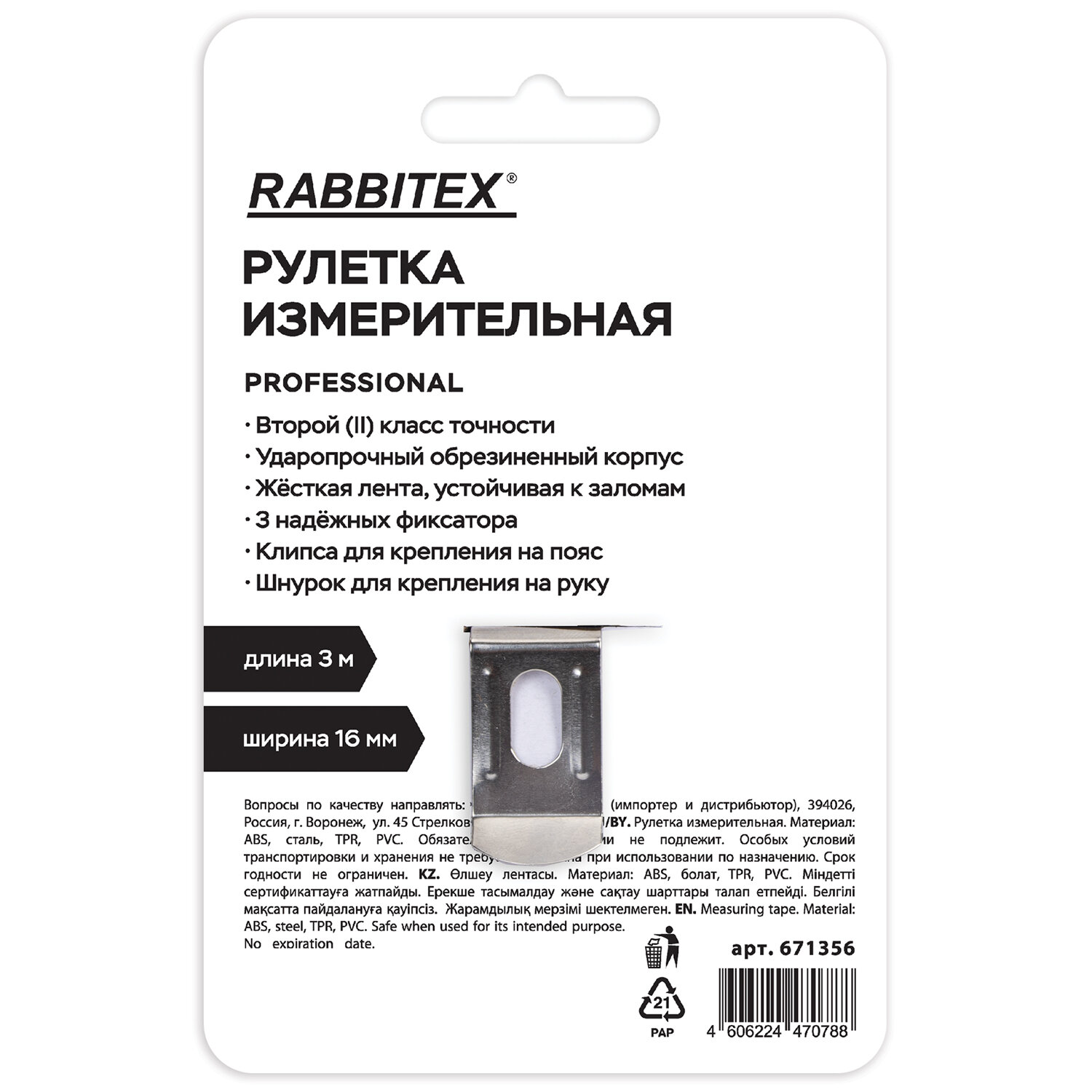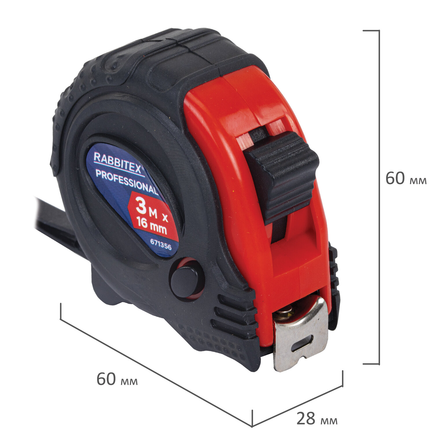 Рулетка измерительная 3 м х 16 мм, обрезиненный корпус, 3 фиксатора, RABBITEX (РАББИТЕКС) Professional Код товара: 671356 81,11 ₽ Купить Производитель:RABBITEX Рулетка RABBITEX применяется для измерения размеров поверхностей и расстояний. Благодаря эргономичному дизайну и высокому классу точности измерений рулетка станет незаменимым помощником в быту и профессиональной деятельности. Рулетка RABBITEX проста в обращении, обладает повышенной износостойкостью и долгим сроком службы. Корпус рулетки из прочного пластика с прорезиненным покрытием обеспечит защиту инструмента от повреждений при случайном падении. Измерительная лента с метрической шкалой II класса точности изготовлена из прочной углеродистой стали, устойчивой к заломам, и оснащена зацепом для удобства измерений. Рулетка оснащена ремешком для ношения на запястье, а также металлической клипсой для крепления на поясе. Эргономичный дизайн с тремя фиксаторами измерительной ленты позволят использовать рулетку даже одной рукой. Материал корпуса: ABS-пластик с ПВХ-покрытием. Цвет корпуса: красный с чёрным покрытием. Материал измерительной ленты: углеродистая сталь (S50C). Размеры измерительной ленты: длина 3 метра, ширина 16 миллиметров. Система измерения: метрическая. Цвет ленты: жёлтый. Фиксаторы: вертикальный, боковой, нижний. Упаковка: бумажная карта с европодвесом.Производство: КитайВид рулетки: строительныйШирина ленты: 16 ммДлина ленты: 3 мСерия: ProfessionalМатериал ленты: стальКоличество режимов фиксации: 3Цена деления: 1 ммКласс точности: 2Тип корпуса: закрытыйМатериал корпуса: пластикОбрезиненный корпус: даВес: 133 грРазмер упаковки: 3.6 × 13.9 × 8.8 смОбъём: 0.0004 м3Промежуточная упаковка: 12 штТранспортная упаковка: 120 штШтрих-код: 4606224470788 Файлы Сертификат-1.jpg Сертификат-2.jpg Сертификат-3.jpg Сертификат-4.jpg Сертификат-5.jpg Сертификат-6.jpg Сертификат-7.jpg Сертификат-8.jpg Сертификат-9.jpg Сертификат-10.jpg Сертификат-11.jpg Сертификат-12.jpg Сертификат-13.jpg Сертификат-14.jpg Сертификат-15.jpg Сертификат-16.jpg Сертификат-17.jpg Сертификат-18.jpg Сертификат-19.jpg Сертификат-20.jpg Сертификат-21.jpg Сертификат-22.jpg Сертификат-23.jpg Сертификат-24.jpg Сертификат-25.jpg Сертификат-26.jpg
