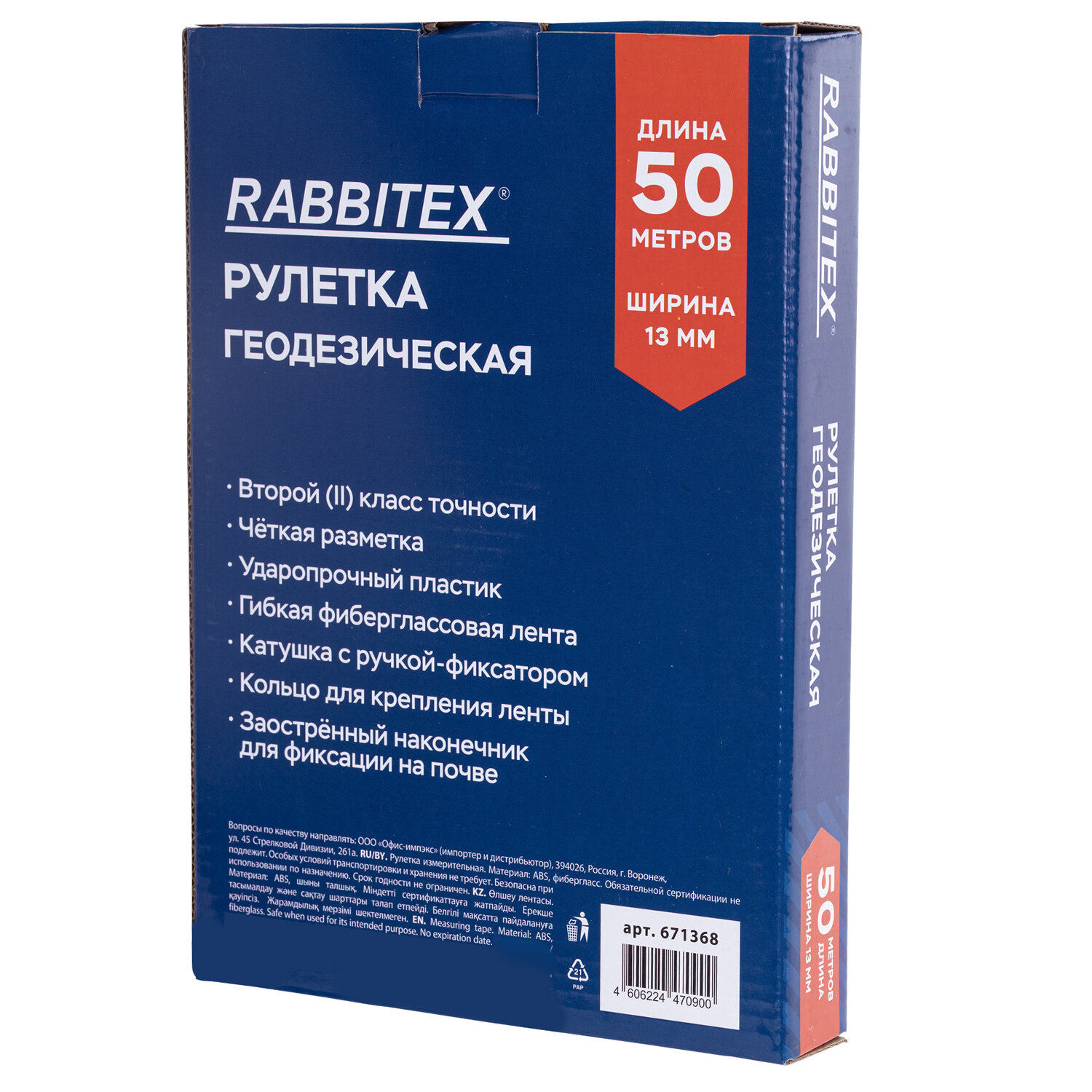 Рулетка геодезическая 50 м х 13 мм, лента фибергласс, открытый корпус, RABBITEX (РАББИТЕКС) Код товара: 671368 287,57 ₽ Купить Производитель:RABBITEX Рулетка геодезическая RABBITEX применяется для измерения больших объектов и расстояний при проведении строительных, геодезических и ландшафтных работ. Незаменима в быту и профессиональной деятельности. Геодезическая рулетка RABBITEX проста в обращении, обладает повышенной износостойкостью и долгим сроком службы. Корпус рулетки открытого типа изготовлен из ударопрочного пластика, устойчивого к повреждениям. Рулетка оснащена удобной рукояткой, заостренным наконечником и кольцом-зацепом, позволяющими проводить измерения даже в одиночку. Гибкая фиберглассовая измерительная лента с метрической шкалой II класса точности устойчива к заломам, не подвержена коррозии и может использоваться для замеров даже на неровной местности. Благодаря специальной ручке с возвратным механизмом лента фиксируется при достижении нужной длины, а также быстро сматывается обратно. Материал корпуса: ABS-пластик. Цвет корпуса: оранжевый. Материал измерительной ленты: фибергласс. Размеры измерительной ленты: длина 50 метров, ширина 13 миллиметров. Система измерения: метрическая. Цвет ленты: белый. Фиксатор: складная рукоятка. Упаковка: цветной колорбокс.Производство: КитайВид рулетки: геодезическийШирина ленты: 13 ммДлина ленты: 50 мСерия: геодезическиеМатериал ленты: фиберглассКоличество режимов фиксации: 1Цена деления: 1 ммКласс точности: 2Тип корпуса: открытыйМатериал корпуса: пластикВес: 604 грРазмер упаковки: 3.9 × 25.8 × 18.2 смОбъём: 0.0021 м3Промежуточная упаковка: 24 штТранспортная упаковка: 24 штШтрих-код: 4606224470900 Файлы Сертификат-1.jpg Сертификат-2.jpg Сертификат-3.jpg Сертификат-4.jpg Сертификат-5.jpg Сертификат-6.jpg Сертификат-7.jpg Сертификат-8.jpg Сертификат-9.jpg Сертификат-10.jpg Сертификат-11.jpg Сертификат-12.jpg Сертификат-13.jpg Сертификат-14.jpg Сертификат-15.jpg Сертификат-16.jpg Сертификат-17.jpg Сертификат-18.jpg Сертификат-19.jpg Сертификат-20.jpg Сертификат-21.jpg Сертификат-22.jpg Сертификат-23.jpg Сертификат-24.jpg Сертификат-25.jpg Сертификат-26.jpg