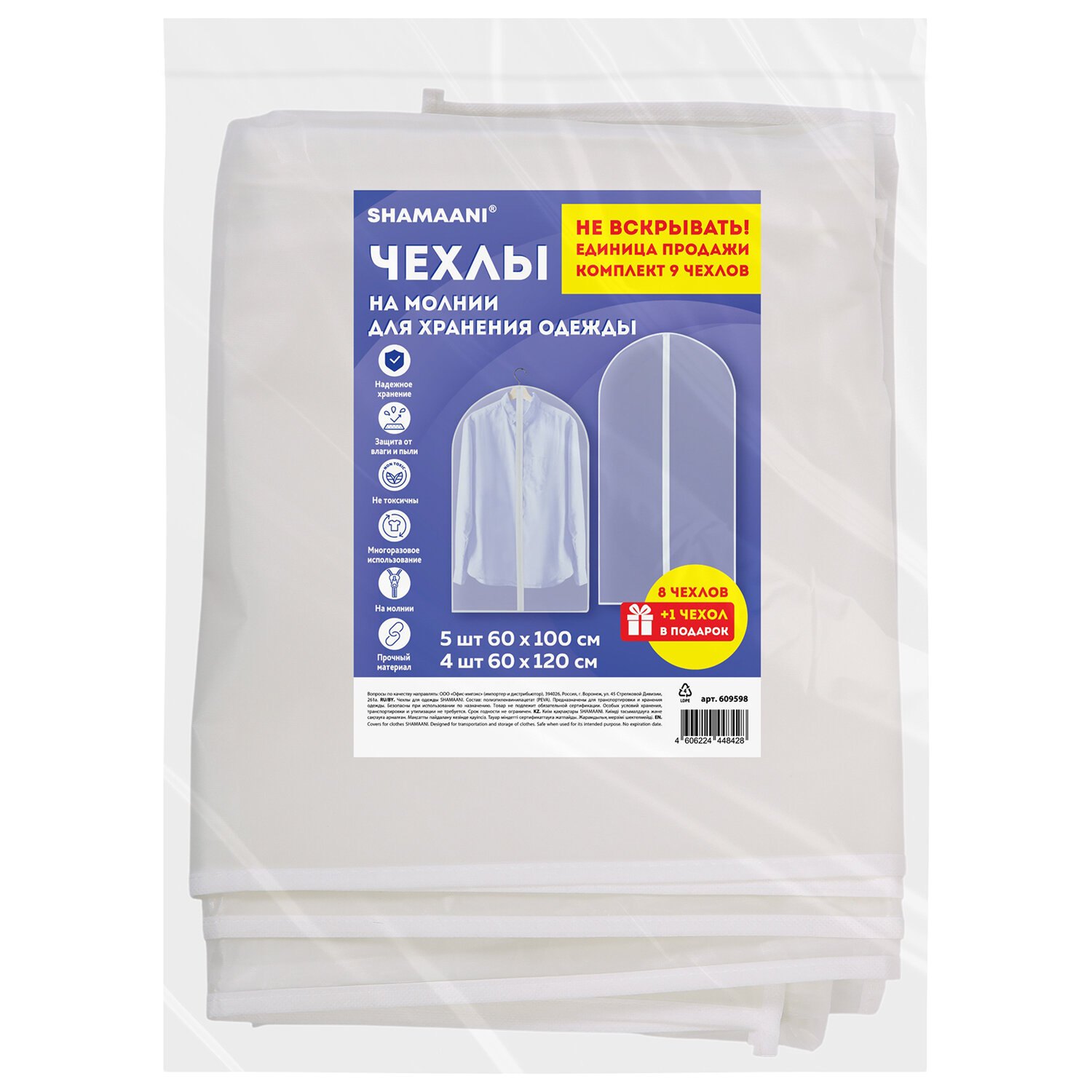 Чехлы для хранения одежды на молнии, КОМПЛЕКТ 8 шт. + 1 в подарок, SHAMAANI (ШАМААНИ) Код товара: 609598 525,82 ₽ Купить Производитель:SHAMAANI Чехлы для одежды SHAMAANI – это надежная защита для одежды от пыли, влаги и насекомых. Чехлы обеспечивают сохранность вещей при хранении и транспортировке. Комплект из чехлов для одежды SHAMAANI позволяет сохранить вещи в чистоте. Чехлы предназначены для защиты вещей от пыли, воды, солнечных лучей, загрязнений различного рода и насекомых. Чехлы также будут незаменимы при транспортировке вещей во время переездов, путешествий и других длительных поездок. В состав комплекта входят: 5 чехлов 60х100 см, 4 чехла 60х120 см. Чехлы для одежды выполнены из высокопрочного полупрозрачного гипоаллергенного материала – полиэтиленвинилацетата (PEVA). Такой материал надежно защищает одежду и дает возможность легко найти нужные вещи. Полупрозрачный белый цвет идеально подойдет для любого гардероба и сделает его более эстетичным. Одежду следует надеть на вешалку-плечики и поместить внутрь чехла, продев крючок в отверстие сверху чехла. Далее с помощью застежки-молнии необходимо закрыть чехол. В комплекте представлены чехлы одинаковой ширины (60 см), но разной длины (100 и 120 см). Такой размер чехлов позволяет использовать его для любого типа одежды.Производство: КитайТип : -Размер: 60х100 см, 60х120 см смКоличество в комплекте: 9 шт.Материал: полиэтиленвинилацетатТолщина: 42 мкрСерия: COVERSЗастежка: молнияЦвет: прозрачно-белыйВес: 618 грРазмер упаковки: 6.2 × 34.5 × 26.2 смОбъём: 0.0043 м3Промежуточная упаковка: 32 штТранспортная упаковка: 32 штШтрих-код: 4606224448428 Файлы Сертификат-1.jpg Сертификат-2.jpg Сертификат-3.jpg Сертификат-4.jpg