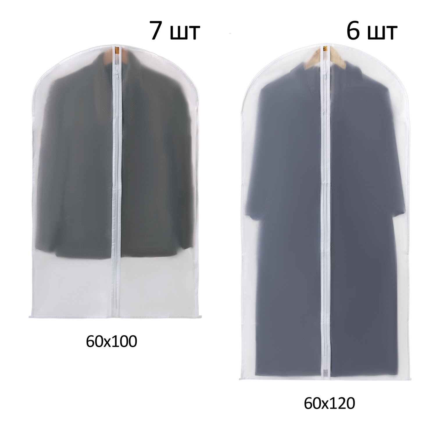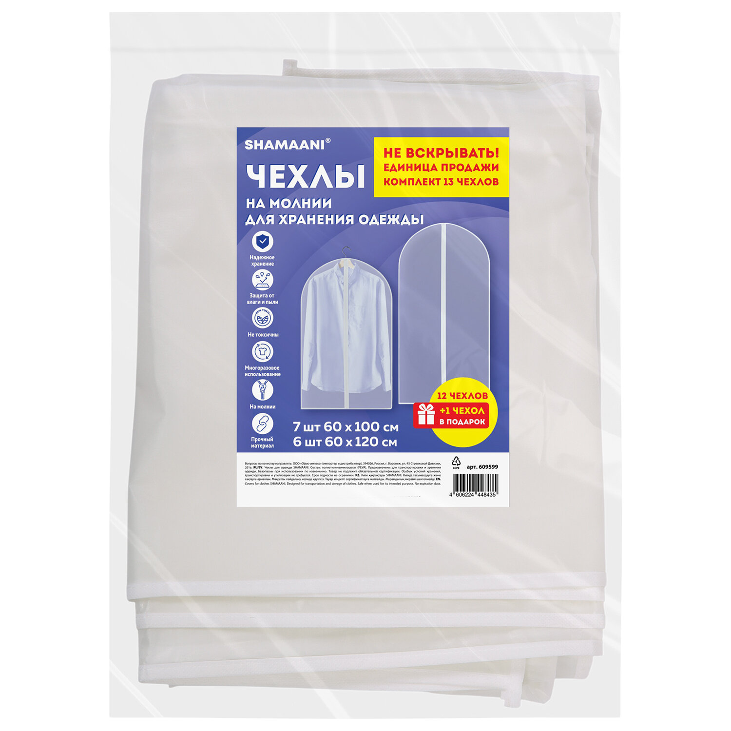 Чехлы для хранения одежды на молнии, КОМПЛЕКТ 12 шт. + 1 в подарок, SHAMAANI (ШАМААНИ) Код товара: 609599 742,91 ₽ Купить Производитель:SHAMAANI Чехлы для одежды SHAMAANI – это надежная защита для одежды от пыли, влаги и насекомых. Чехлы обеспечивают сохранность вещей при хранении и транспортировке. Комплект из чехлов для одежды SHAMAANI позволяет сохранить вещи в чистоте. Чехлы предназначены для защиты вещей от пыли, воды, солнечных лучей, загрязнений различного рода и насекомых. Чехлы также будут незаменимы при транспортировке вещей во время переездов, путешествий и других длительных поездок. В состав комплекта входят: 7 чехлов 60х100 см, 6 чехлов 60х120 см. Чехлы для одежды выполнены из высокопрочного полупрозрачного гипоаллергенного материала – полиэтиленвинилацетата (PEVA). Такой материал надежно защищает одежду и дает возможность легко найти нужные вещи. Полупрозрачный белый цвет идеально подойдет для любого гардероба и сделает его более эстетичным. Одежду следует надеть на вешалку-плечики и поместить внутрь чехла, продев крючок в отверстие сверху чехла. Далее с помощью застежки-молнии необходимо закрыть чехол. В комплекте представлены чехлы одинаковой ширины (60 см), но разной длины (100 и 120 см). Такой размер чехлов позволяет использовать его для любого типа одежды.Производство: КитайТип : -Размер: 60х100 см, 60х120 см смКоличество в комплекте: 13 шт.Материал: полиэтиленвинилацетатТолщина: 42 мкрСерия: COVERSЗастежка: молнияЦвет: прозрачно-белыйВес: 943 грРазмер упаковки: 8.1 × 35.3 × 28.3 смОбъём: 0.0067 м3Промежуточная упаковка: 24 штТранспортная упаковка: 24 штШтрих-код: 4606224448435 Сертификат-1.jpg Сертификат-2.jpg