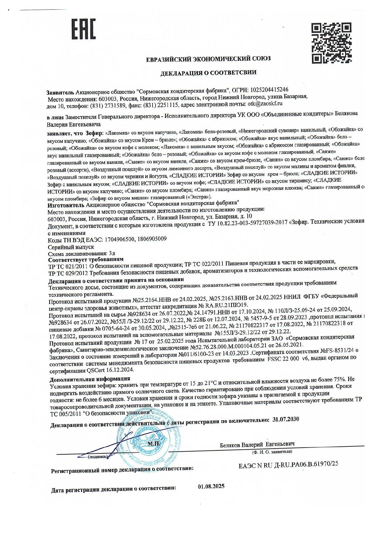 Зефир СЛАДКИЕ ИСТОРИИ, крем-брюле, 250 г, пакет Код товара: 620592 134,26 ₽ Купить Производитель:СЛАДКИЕ ИСТОРИИ Зефир со вкусом крем-брюле, не содержит искусственных красителей. Отличный десерт к чаю или кофе. Производство: РоссияТип товара: зефирВес нетто: 250 гВкус: крем-брюлеСоответствует требованиям ГОСТа: нетТип упаковки: пакетСрок годности: 6 мес.Фирма-производитель: РотФронтСрок годности: 6 месВес: 331 грРазмер упаковки: 5.1 × 23.6 × 13.6 смОбъём: 0.0025 м3Промежуточная упаковка: 8 штТранспортная упаковка: 8 штШтрих-код: 4607144733526 Сертификат-1.jpg Сертификат-2.jpg Сертификат-3.jpg