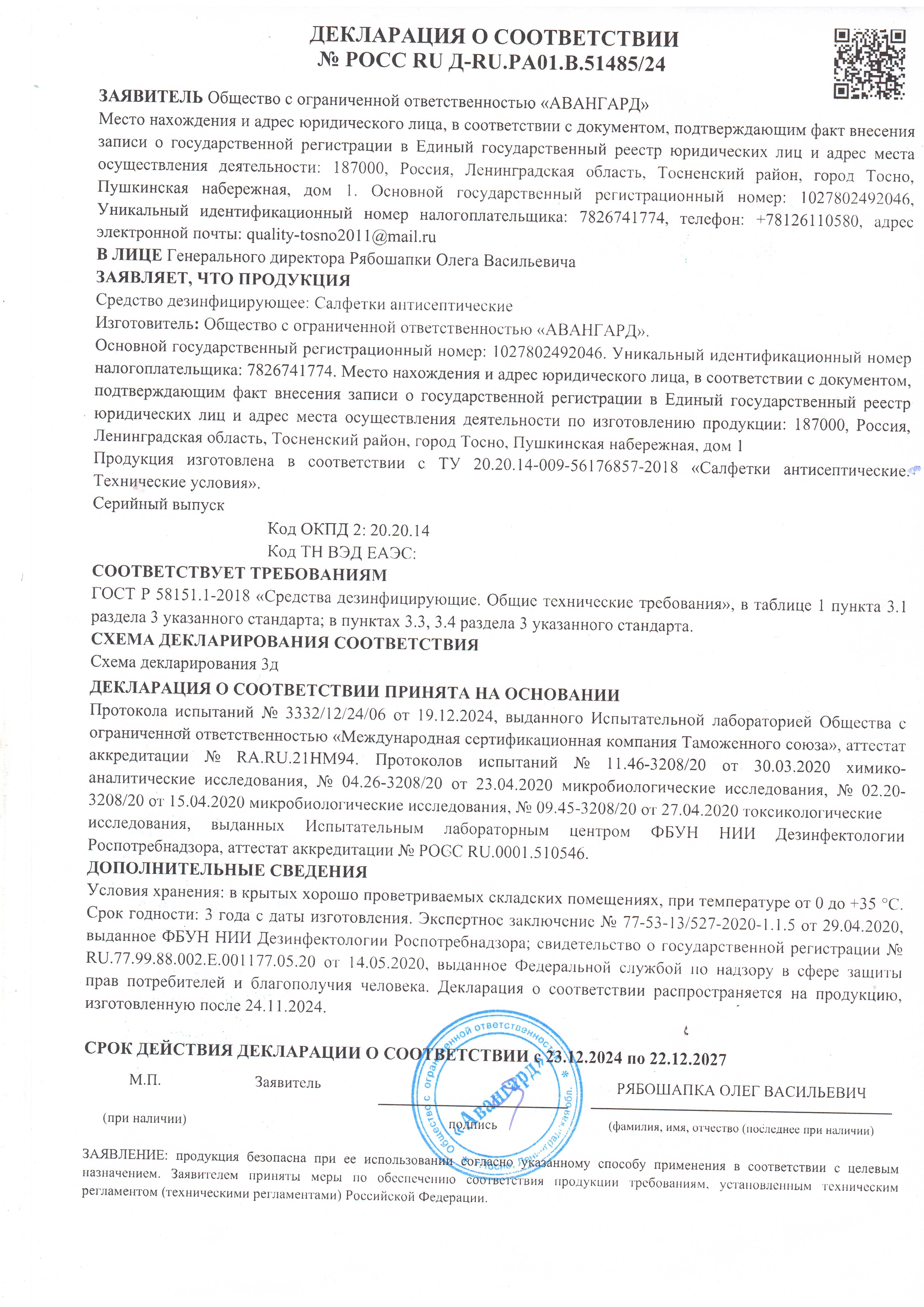 Антисептические салфетки влажные 50 штук SMART MEDICAL, без спирта, крышка-клапан Код товара: 630751 136,28 ₽ Купить Производитель:SMART MEDICAL Антисептические салфетки с антибактериальными свойствами для использования в целях личной гигиены, а также для применения в учреждениях (в том числе и медицинских). Обладают антимикробными действиями в отношении возбудителей острых респираторных заболеваний, бактериальных кишечных инфекций, грибковых заболеваний.Предназначены для: - личной гигиены; - антибактериальной обработки поверхностей в специализированных учреждениях (профилактические учреждения, салоны, фитнес центры, мед учреждения); - антибактериальной обработки предметов бытового назначения ( от оргтехники, до детских игрушек).Производство: РоссияРежимы дезинфекции: дезинфекция кожных покровов, дезинфекция поверхностейОбласть применения: дезинфекция мест и средств общественного пользования (вокзалы, аэропорты и т.п.), обработка рук и поверхностей, парикмахерские, косметические салоны и т.п., применение в быту, учреждения культуры, отдыха (кинотеатры, музеи, театры), учреждения соцобеспеченияТип активности: бактерии, вирусы, патогенные грибыДействующие вещества: ЧАСКоличество в комплекте: 50 шт.Соответствует требованиям ГОСТа: ГОСТ 12.1.007-76 п.1.2, 1.3, ГОСТ Р 56990-2016, ГОСТ Р 58151.1-2018 Упаковка: пакет с клапаномСерия: SMART MEDICAL асептикСрок годности: 36 месВес: 342 грРазмер упаковки: 5.3 × 20.5 × 9.8 смОбъём: 0.0012 м3Промежуточная упаковка: 20 штТранспортная упаковка: 20 штШтрих-код: 4610080720345 Приложение-1.pdf Сертификат-1.jpg Сертификат-2.jpg