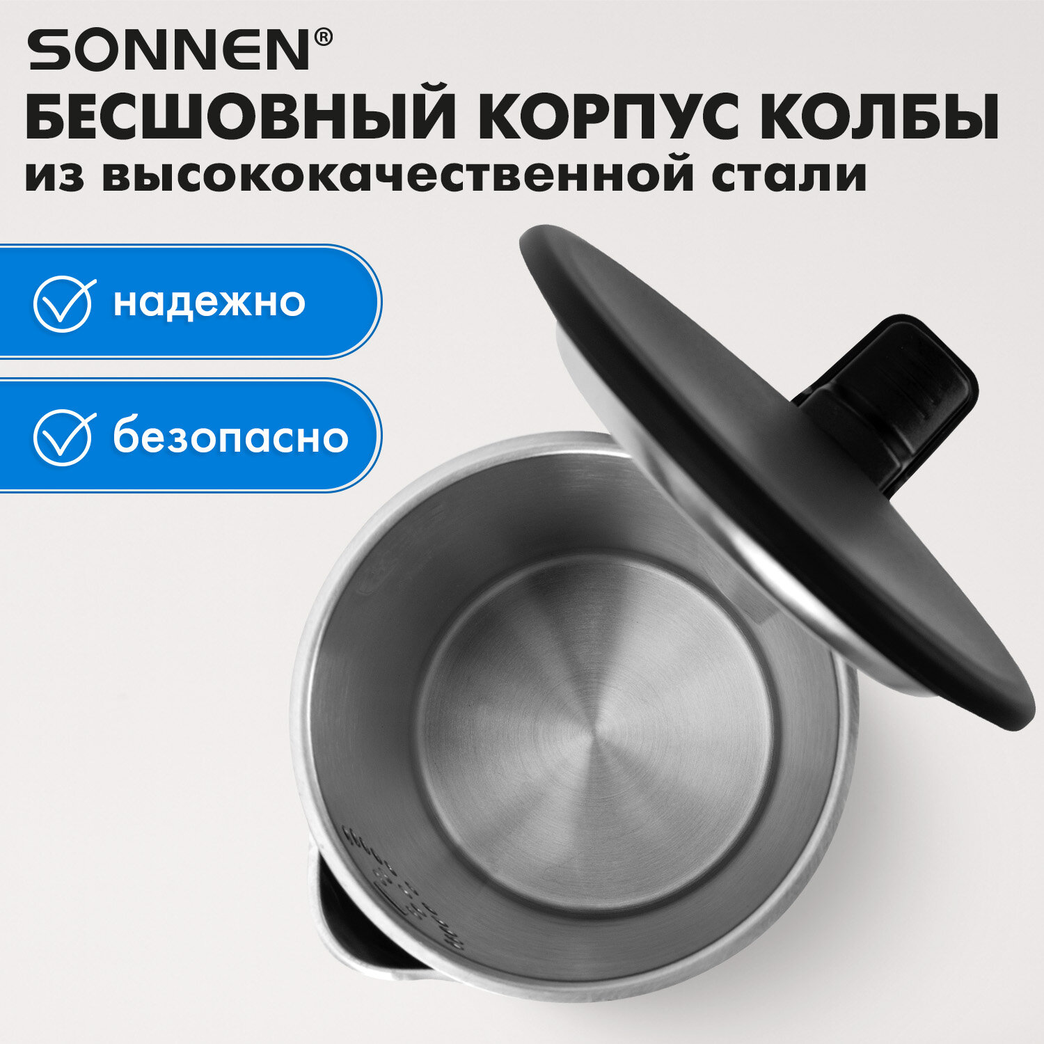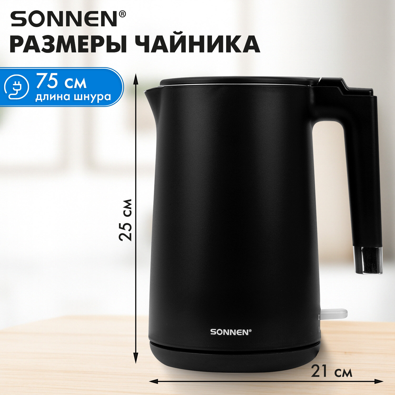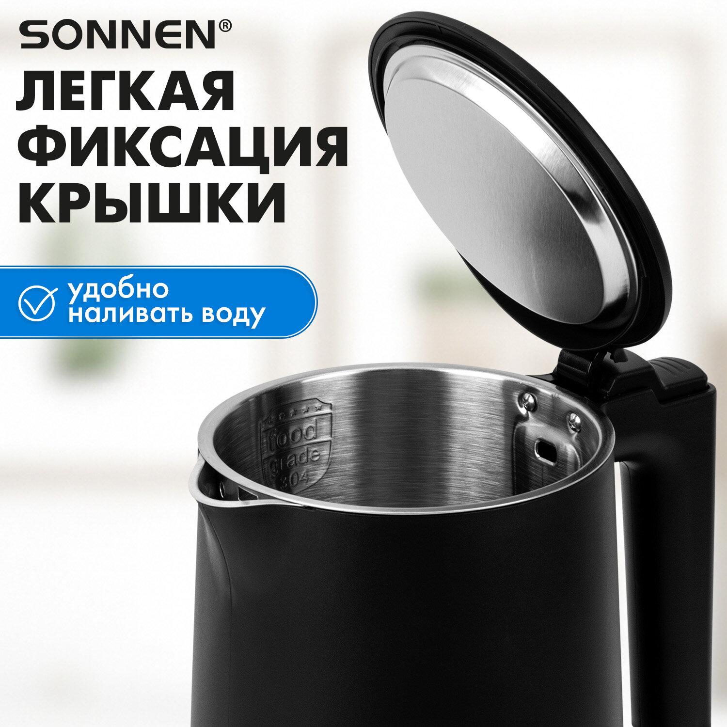 Чайник электрический с двойными стенками SONNEN KT-8719B, 1,5 л, 2200 Вт, черный Код товара: 454692 1 828,44 ₽ Купить Производитель:SONNEN Чайник с двойными стенками SONNEN KT-8719B – идеальный выбор для тех, кто ценит комфорт, безопасность и безупречный дизайн. Электрический чайник SONNEN KT-8719B имеет двойные стенки: внутренняя колба сделана из нержавеющей стали, внешнее покрытие – из термостойкого пластика. Благодаря такой конструкции внешняя поверхность чайника остаётся холодной, что исключает риск получения ожогов. Вода в таком чайнике остывает гораздо медленнее, сохраняя оптимальную температуру для заваривания любимых напитков. Данная модель идеально подходит для использования в домашних условиях и офисах, где важна скорость и удобство приготовления горячих напитков. Мощность прибора составляет 2200 Вт, что позволит воде закипеть за считаные минуты. Объема 1,5 л хватит на большую компанию или на несколько нагреваний для одного человека в течение дня. Благодаря стильному дизайну и компактным размерам этот чайник станет отличным дополнением к любой кухне. Чайник безопасен при использовании, так как имеет автоотключение при недостаточном количестве воды и защиту от перегрева.Производство: КитайОбъем: 1.5 лМощность: 2200 ВтМатериал корпуса: нержавеющая сталь, пластикВид нагревательного элемента: закрытыйАвтоотключение при закипании: даСерия: KT-8719Отключение при отсутствии воды: даИндикатор включения: даВращение на 360°: даФильтр от накипи: даДлина шнура: 0.75 мЦвет корпуса: черныйШирина: 155 ммВысота: 252 ммГлубина: 215 ммВес (без упаковки): 1 кгВес: 1,27 кгРазмер упаковки: 24.5 × 21.6 × 16.5 смОбъём: 0.01 м3Промежуточная упаковка: 8 штТранспортная упаковка: 8 штШтрих-код: 4606224467214 Файлы Сертификат-1.jpg Сертификат-2.jpg Сертификат-3.jpg Сертификат-4.jpg Сертификат-5.jpg Сертификат-6.jpg Сертификат-7.jpg