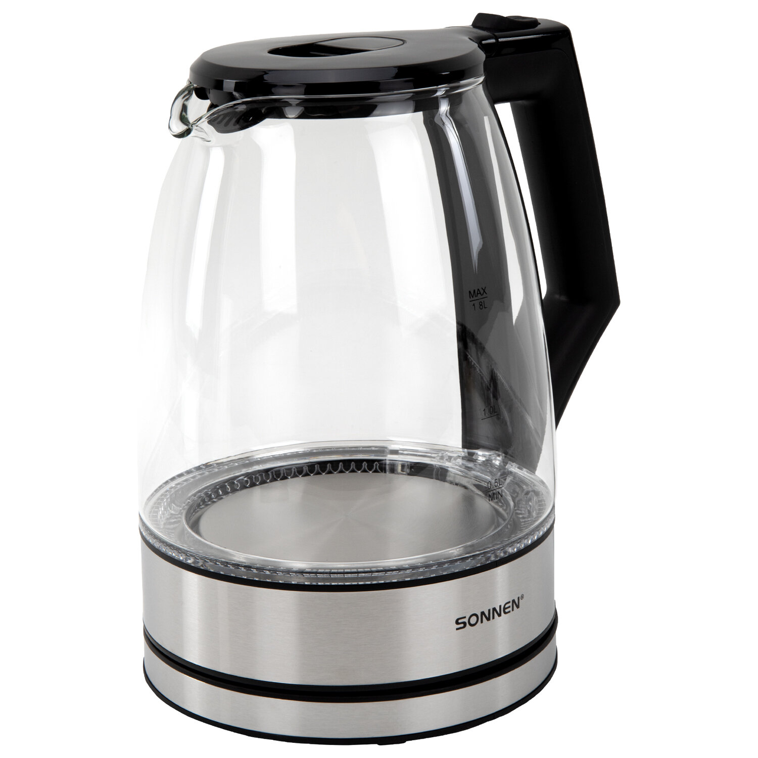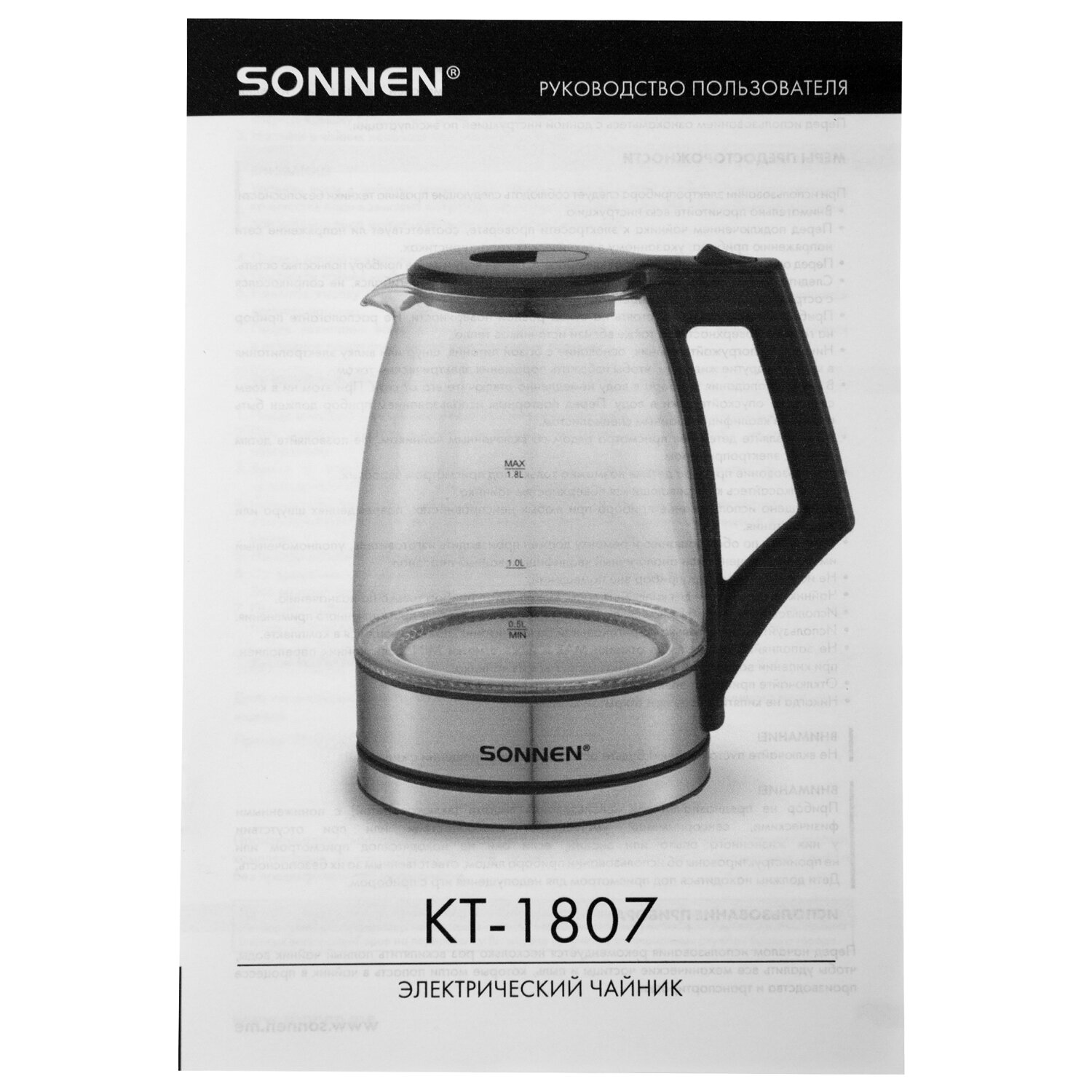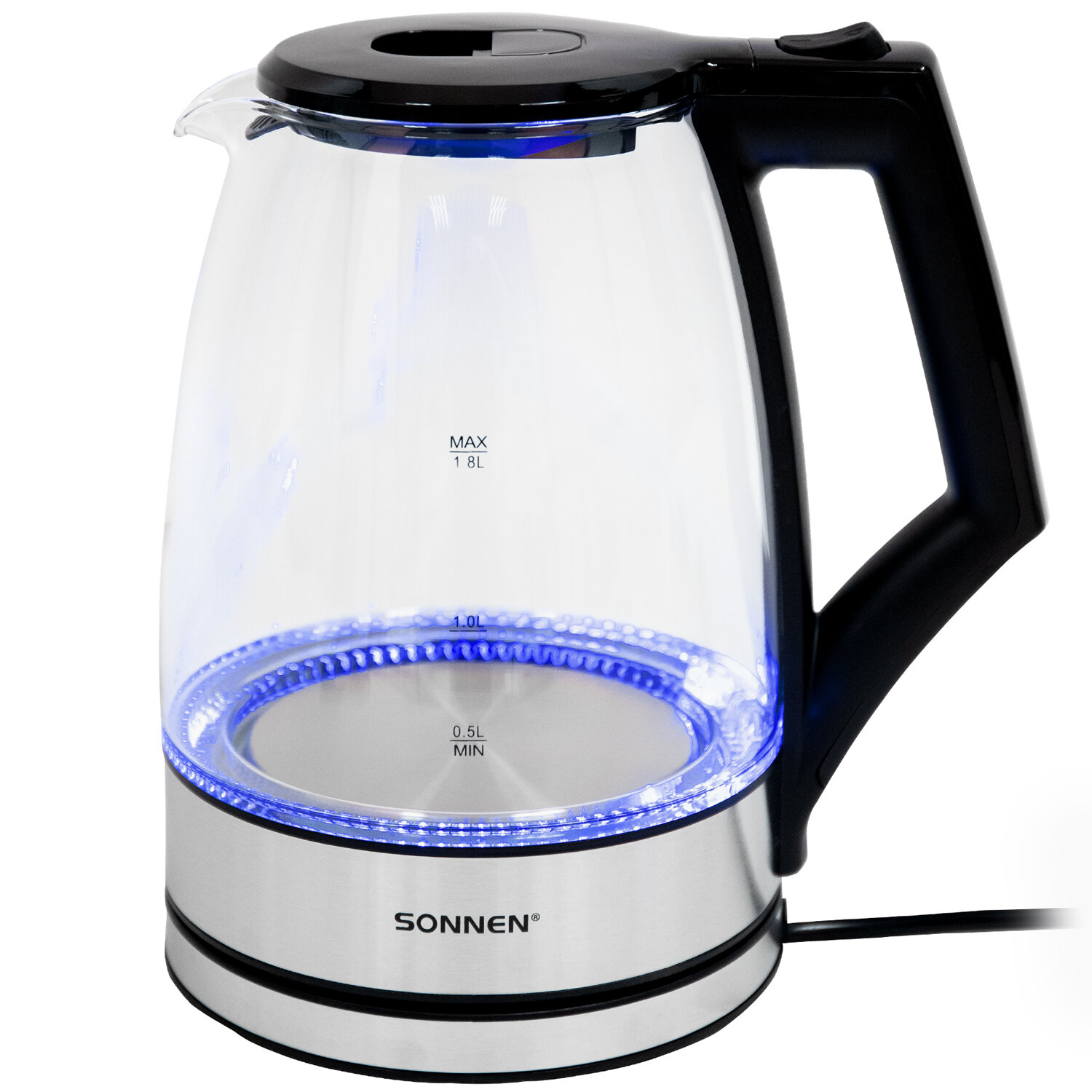 Чайник электрический SONNEN KT-1807, 1,8 л, 2200 Вт, термостойкое стекло, внутренняя подсветка синяя, нержавеющая сталь Код товара: 455140 1 462,54 ₽ Купить Производитель:SONNEN Универсальный, надежный чайник SONNEN станет прекрасным дополнением любой кухни. Приятная синяя подсветка, эргономичный стеклянный корпус – отличный чайник для атмосферного чаепития! Электрический чайник SONNEN KT-1807 имеет надежный корпус из прочного термостойкого стекла и основание из нержавеющей стали. Круговая синяя LED-подсветка включается при запуске работы устройства и отключается при закипании. Крышка легко открывается с помощью удобной кнопки. На стекле нанесена шкала для индикации уровня воды. Чайник отлично подходит для работы и дома благодаря большому объему 1,8 л и повышенной мощности 2200 Вт для быстрого закипания воды. Оснащен надежным контроллером, защитой от перегрева и функцией автоотключения при недостаточном количестве воды.Производство: КитайОбъем: 1.8 лМощность: 2200 ВтМатериал корпуса: термостойкое стеклоВид нагревательного элемента: закрытыйАвтоотключение при закипании: даСерия: KT-1807Отключение при отсутствии воды: даИндикатор включения: даИндикация уровня воды: даВращение на 360°: даПодсветка: даФильтр от накипи: даДлина шнура: 0.75 мЦвет корпуса: хром/прозрачныйШирина: 225 ммВысота: 244 ммГлубина: 160 ммВес (без упаковки): 1 кгВес: 1,26 кгРазмер упаковки: 19 × 24.9 × 22.2 смОбъём: 0.0119 м3Промежуточная упаковка: 6 штТранспортная упаковка: 6 штШтрих-код: 4606224517780 Файлы Приложение-1.pdf Сертификат-1.jpg Сертификат-2.jpg Сертификат-3.jpg Сертификат-4.jpg Сертификат-5.jpg Сертификат-6.jpg Сертификат-7.jpg