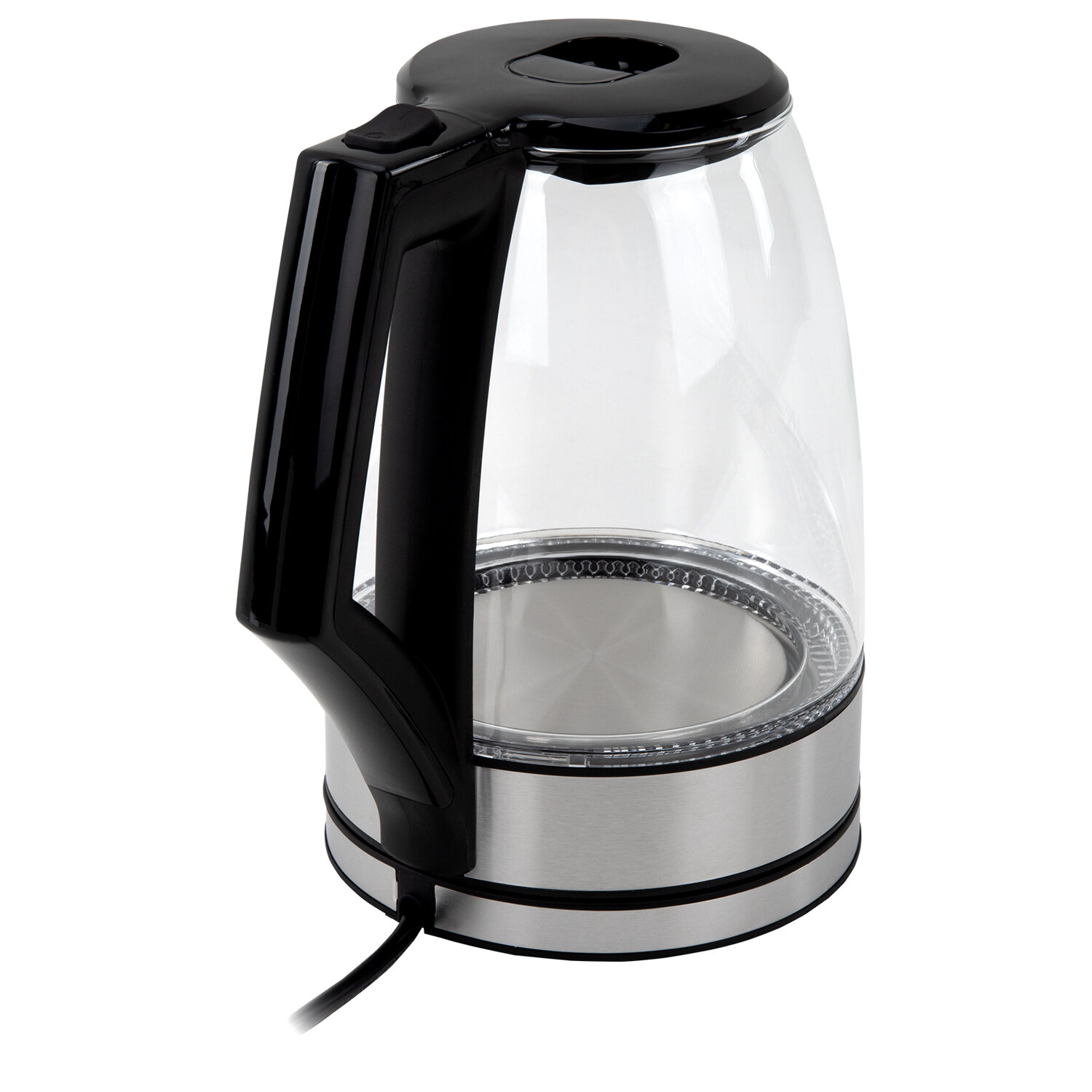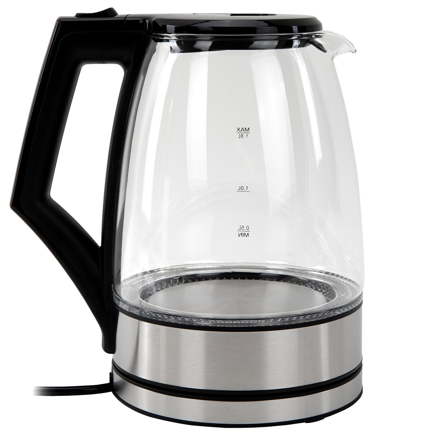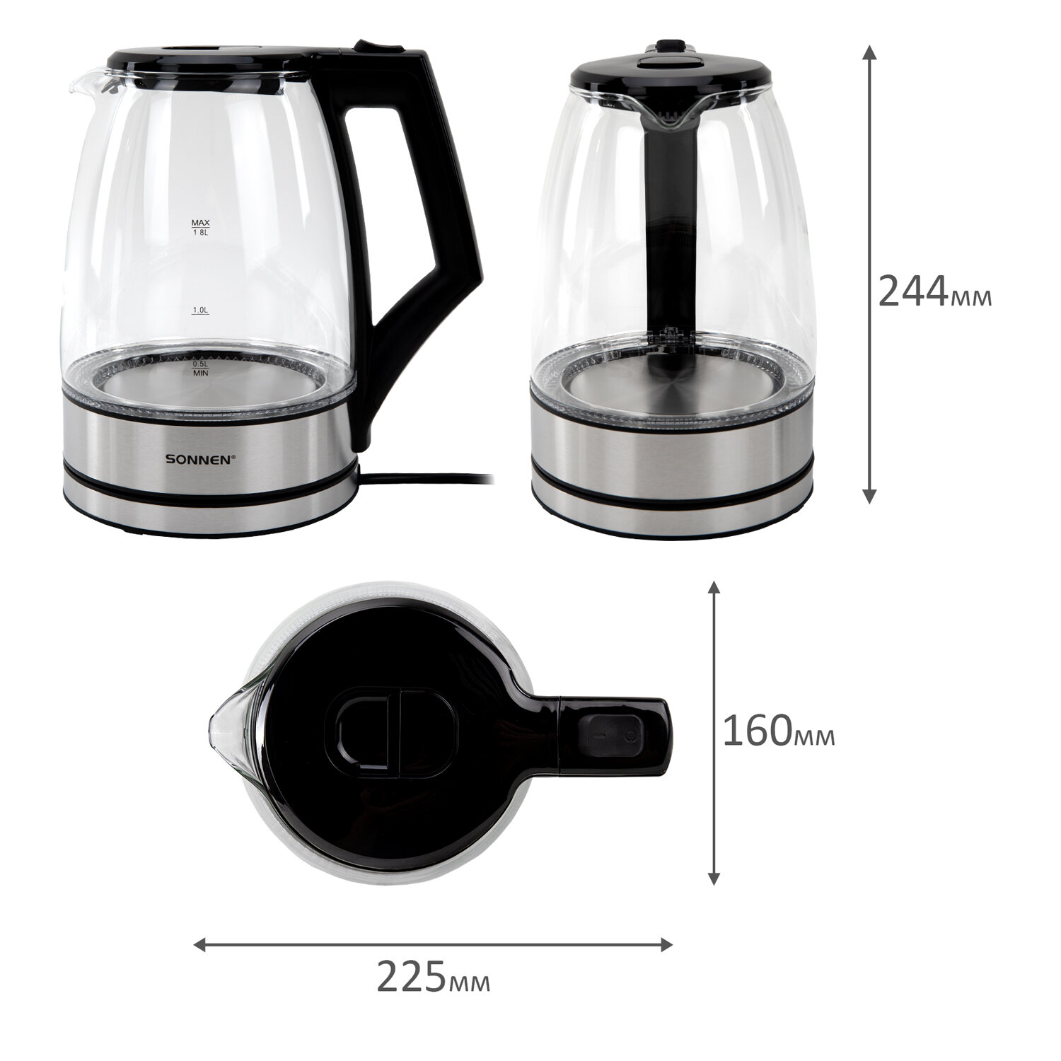 Чайник электрический SONNEN KT-1807, 1,8 л, 2200 Вт, термостойкое стекло, внутренняя подсветка синяя, нержавеющая сталь Код товара: 455140 1 462,54 ₽ Купить Производитель:SONNEN Универсальный, надежный чайник SONNEN станет прекрасным дополнением любой кухни. Приятная синяя подсветка, эргономичный стеклянный корпус – отличный чайник для атмосферного чаепития! Электрический чайник SONNEN KT-1807 имеет надежный корпус из прочного термостойкого стекла и основание из нержавеющей стали. Круговая синяя LED-подсветка включается при запуске работы устройства и отключается при закипании. Крышка легко открывается с помощью удобной кнопки. На стекле нанесена шкала для индикации уровня воды. Чайник отлично подходит для работы и дома благодаря большому объему 1,8 л и повышенной мощности 2200 Вт для быстрого закипания воды. Оснащен надежным контроллером, защитой от перегрева и функцией автоотключения при недостаточном количестве воды.Производство: КитайОбъем: 1.8 лМощность: 2200 ВтМатериал корпуса: термостойкое стеклоВид нагревательного элемента: закрытыйАвтоотключение при закипании: даСерия: KT-1807Отключение при отсутствии воды: даИндикатор включения: даИндикация уровня воды: даВращение на 360°: даПодсветка: даФильтр от накипи: даДлина шнура: 0.75 мЦвет корпуса: хром/прозрачныйШирина: 225 ммВысота: 244 ммГлубина: 160 ммВес (без упаковки): 1 кгВес: 1,26 кгРазмер упаковки: 19 × 24.9 × 22.2 смОбъём: 0.0119 м3Промежуточная упаковка: 6 штТранспортная упаковка: 6 штШтрих-код: 4606224517780 Файлы Приложение-1.pdf Сертификат-1.jpg Сертификат-2.jpg Сертификат-3.jpg Сертификат-4.jpg Сертификат-5.jpg Сертификат-6.jpg Сертификат-7.jpg