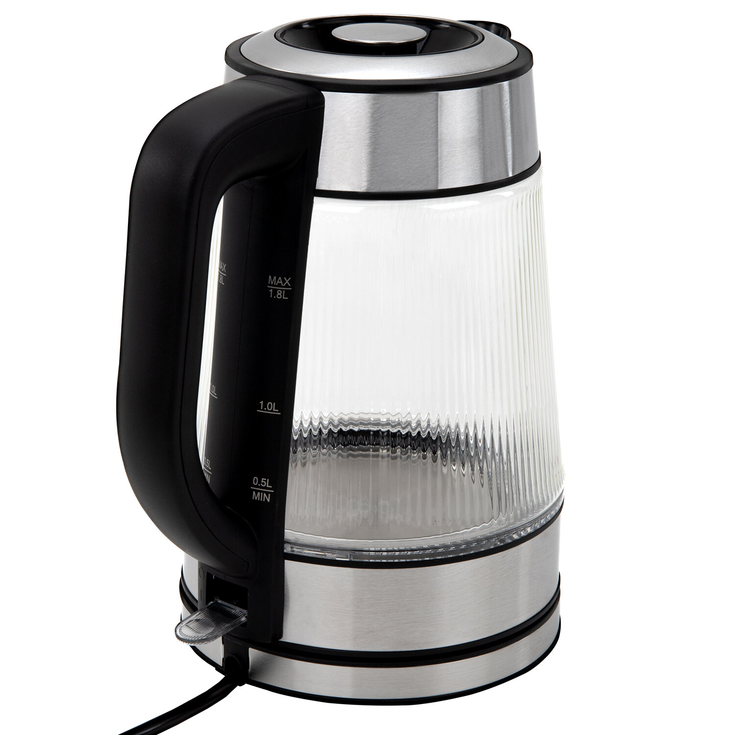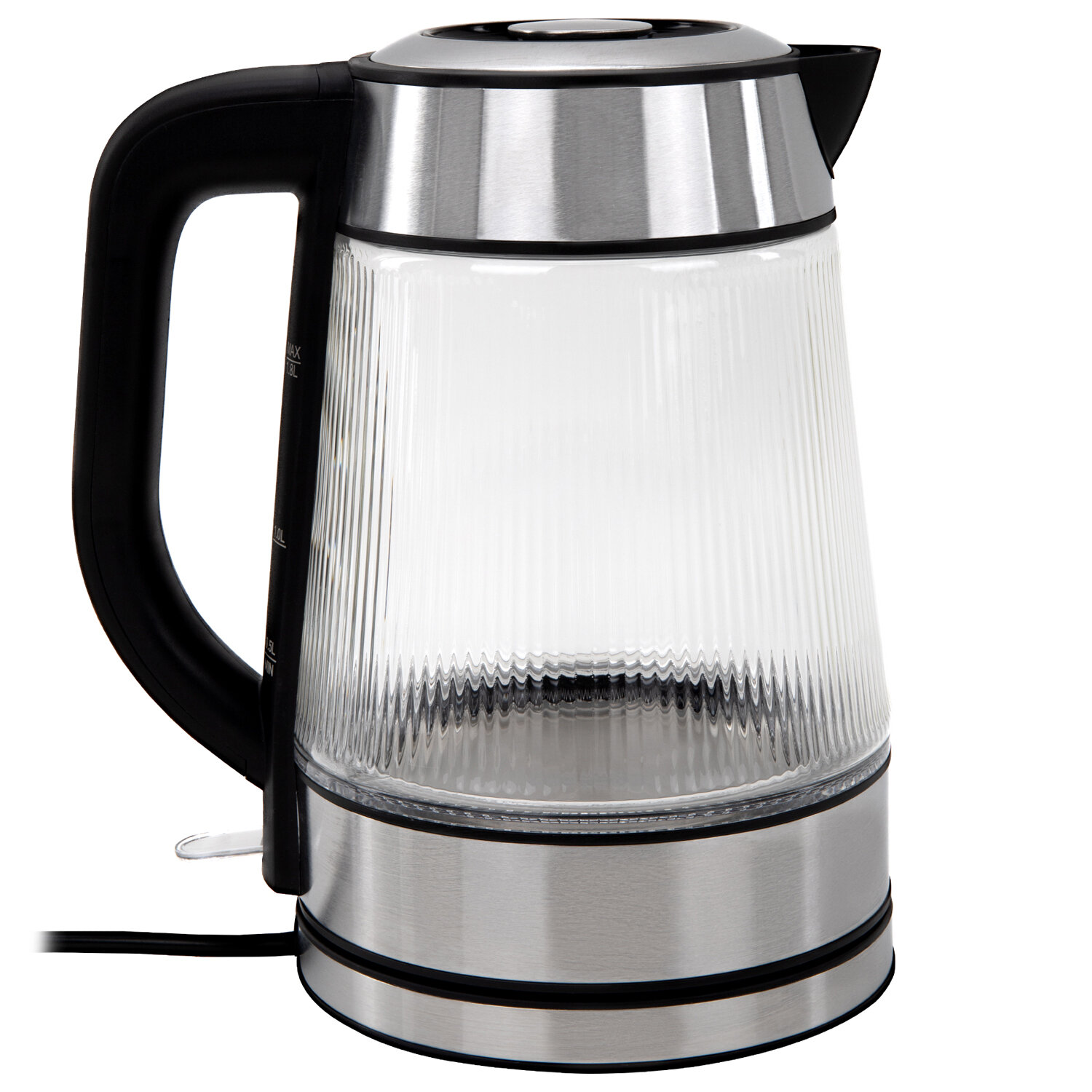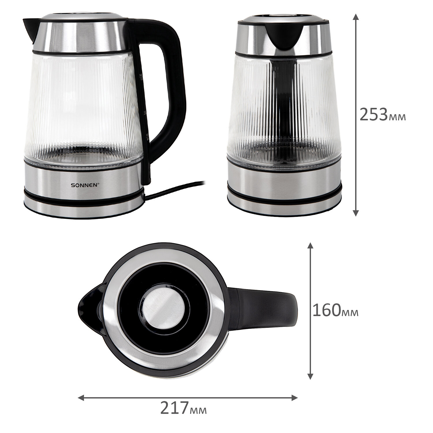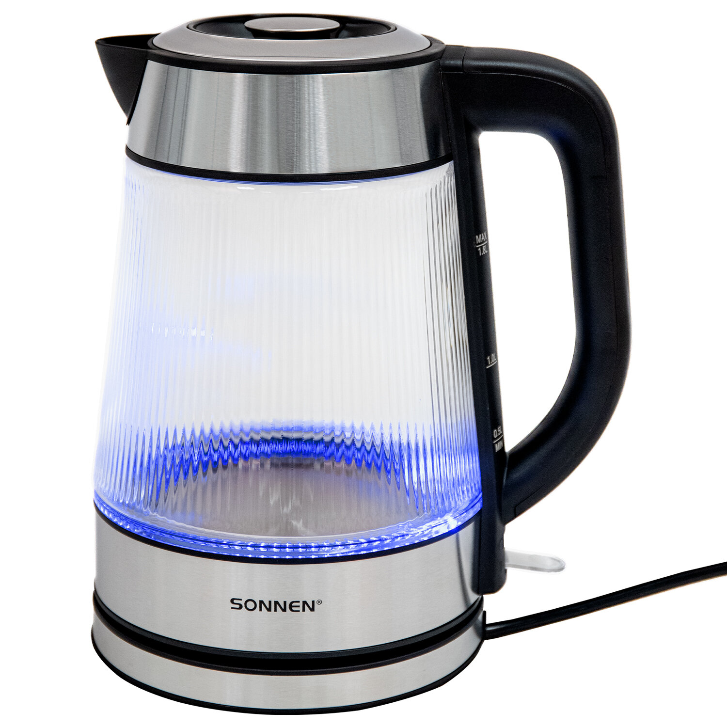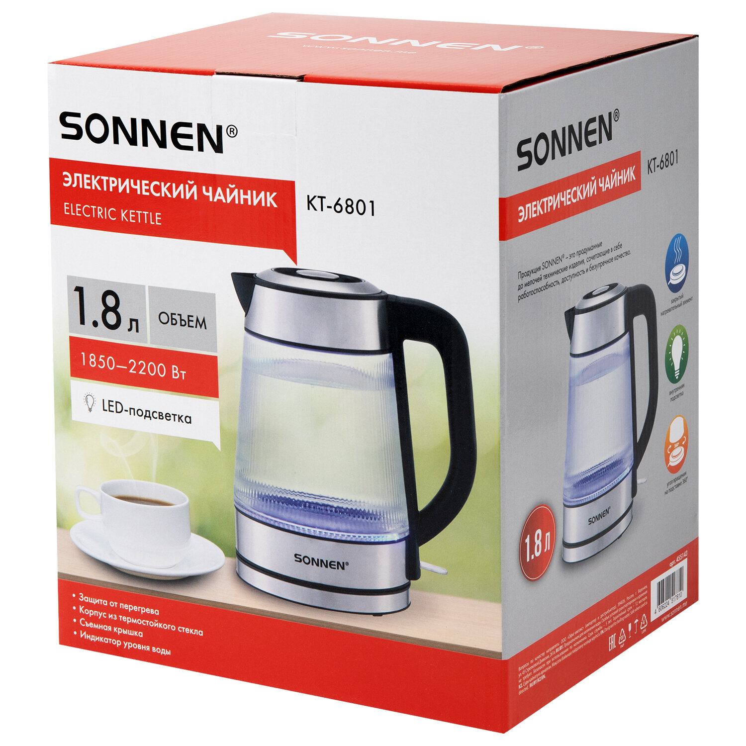 Чайник электрический SONNEN KT-6801, 1,8 л, 2200 Вт, термостойкое стекло текстура полоска, внутренняя подсветка синяя, нерж. сталь Код товара: 455143 1 678,27 ₽ Купить Производитель:SONNEN Стильный и надежный чайник SONNEN станет прекрасным дополнением любой кухни. Оригинальный рельефный корпус из термостойкого стекла, приятная синяя подсветка – отличный чайник для атмосферного чаепития! Электрический чайник SONNEN KT-6801 имеет надежный корпус из термостойкого стекла с оригинальной ребристой текстурой и прочное основание из нержавеющей стали. Круговая синяя LED-подсветка включается при запуске работы устройства и отключается при закипании. Крышка снимается полностью при помощи удобной ручки, а плотное прилегание крышки к корпусу позволяет дольше сохранять температуру воды. На основании ручки нанесена шкала для индикации уровня воды. Чайник отлично подходит для работы и дома благодаря большому объему 1,8 л и повышенной мощности 2200 Вт для быстрого закипания. Чайник оснащен надежным контроллером, защитой от перегрева и функцией автоотключения при недостаточном количестве воды.Производство: КитайОбъем: 1.8 лМощность: 2200 ВтМатериал корпуса: термостойкое стеклоВид нагревательного элемента: закрытыйАвтоотключение при закипании: даСерия: KT-6801Отключение при отсутствии воды: даИндикатор включения: даИндикация уровня воды: даВращение на 360°: даПодсветка: даФильтр от накипи: даДлина шнура: 0.75 мЦвет корпуса: хром/прозрачныйШирина: 217 ммВысота: 253 ммГлубина: 160 ммВес (без упаковки): 1.09 кгВес: 1,39 кгРазмер упаковки: 18.9 × 26.1 × 22.2 смОбъём: 0.0123 м3Промежуточная упаковка: 6 штТранспортная упаковка: 6 штШтрих-код: 4606224517810 Файлы Приложение-1.pdf Сертификат-1.jpg Сертификат-2.jpg Сертификат-3.jpg Сертификат-4.jpg Сертификат-5.jpg Сертификат-6.jpg Сертификат-7.jpg