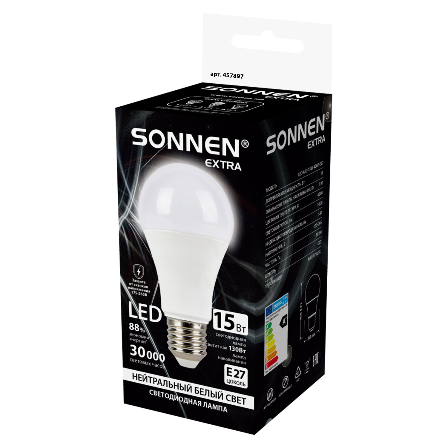 Лампа светодиодная SONNEN EXTRA, 15 (130) Вт, Е27, груша, нейтральный белый, 30000 ч, LED A60-15W-4000-Е27 Код товара: 457897 101,3 ₽ Купить Производитель:SONNEN Светодиодная лампа SONNEN EXTRA компактного размера. Срок службы лампы составляет не менее 30000 часов, что примерно в 30 раз больше, чем у обычной лампы накаливания. Оснащена цоколем типа Е27 и излучает нейтральный белый cвет. Отличается длительным сроком службы. Имеет грушевидную форму колбы и сделана из белого матового пластика. Мощность лампы составляет 15 Вт. Представленная модель дает световой поток 1600 Лм, а цветовая температура равна 4000 K. Диаметр лампы составляет 60 мм. Производитель сохраняет за собой право на внесение изменений в технические характеристики, комплектацию и конструкцию данной модели для улучшения эксплуатационных свойств без предварительного уведомления.Производство: Китай Тип цоколя : E27Количество в комплекте: 1 шт.Оттенок света: нейтральный белыйМощность: 15 ВтТип лампы: светодиоднаяТип колбы: грушаВид колбы: матоваяМинимальное рабочее напряжение: 175 ВМаксимальное рабочее напряжение: 265 ВМощность эквивалентной по световому потоку лампы накаливания: 130 ВтСветовой поток: 1600 ЛмЦветовая температура: 4000 КИндекс цветопередачи: 80 %Срок службы: 30000 ч.Высота (длина) лампы: 123 ммДиаметр лампы: 60 ммСерия: EXTRAВес: 50 грРазмер упаковки: 6.2 × 15.8 × 6.2 смОбъём: 0.0006 м3Промежуточная упаковка: 100 штТранспортная упаковка: 100 штШтрих-код: 4606224501567 Сертификат-1.jpg Сертификат-2.jpg