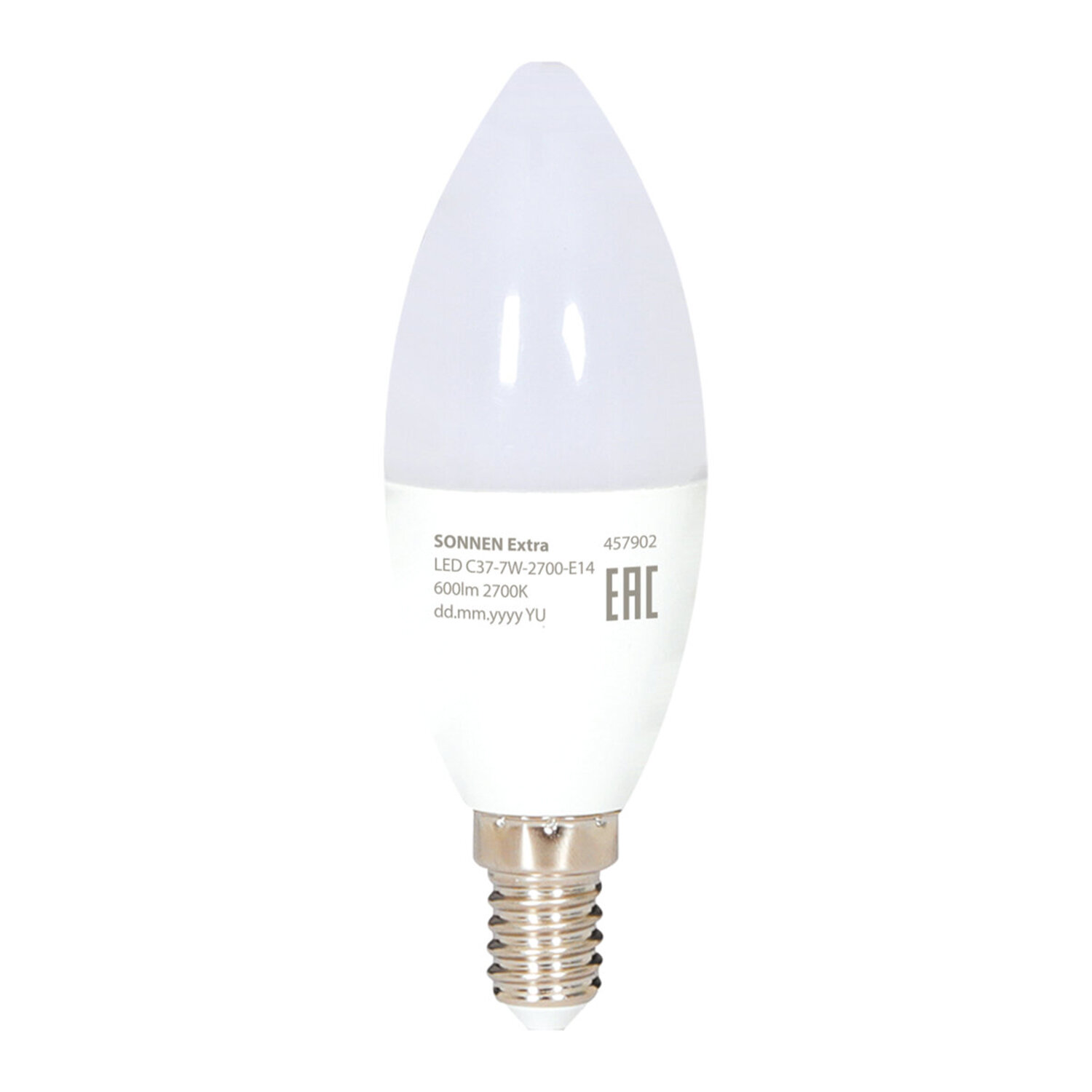 Лампа светодиодная SONNEN EXTRA, 7 (60) Вт, Е14, свеча, теплый белый, 30000 ч, LED C37-7W-2700-Е14 Код товара: 457902 60,6 ₽ Купить Производитель:SONNEN Светодиодная лампа SONNEN EXTRA компактного размера. Срок службы лампы составляет не менее 30000 часов, что примерно в 30 раз больше, чем у обычной лампы накаливания. Оснащена цоколем типа Е14 и излучает теплый белый cвет. Отличается длительным сроком службы. Имеет форму колбы "свеча" и сделана из белого матового пластика. Мощность лампы составляет 7 Вт. Представленная модель дает световой поток 600 Лм, а цветовая температура равна 2700 K. Диаметр лампы составляет 37 мм. Производитель сохраняет за собой право на внесение изменений в технические характеристики, комплектацию и конструкцию данной модели для улучшения эксплуатационных свойств без предварительного уведомления.Производство: Китай Тип цоколя : E14Количество в комплекте: 1 шт.Оттенок света: теплый белыйМощность: 7 ВтТип лампы: светодиоднаяТип колбы: свечаВид колбы: матоваяМинимальное рабочее напряжение: 175 ВМаксимальное рабочее напряжение: 265 ВМощность эквивалентной по световому потоку лампы накаливания: 60 ВтСветовой поток: 600 ЛмЦветовая температура: 2700 КИндекс цветопередачи: 80 %Срок службы: 30000 ч.Высота (длина) лампы: 100 ммДиаметр лампы: 37 ммСерия: EXTRAВес: 24 грРазмер упаковки: 4 × 10.1 × 3.7 смОбъём: 0.0002 м3Промежуточная упаковка: 10 штТранспортная упаковка: 100 штШтрих-код: 4606224501611 Файлы Сертификат-1.jpg Сертификат-2.jpg
