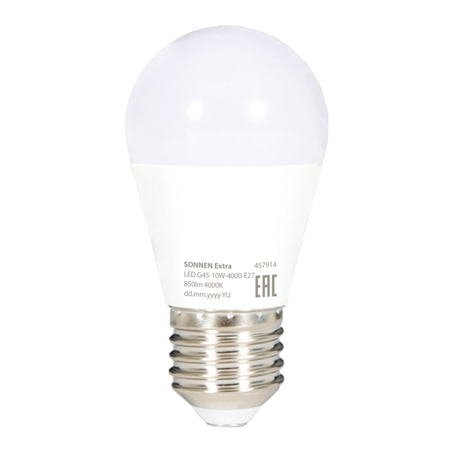 Лампа светодиодная SONNEN EXTRA, 10 (85) Вт, E27, шар, нейтральный белый, 30000 ч, LED G45-10W-4000-Е27 Код товара: 457914 72,18 ₽ Купить Производитель:SONNEN Светодиодная лампа SONNEN EXTRA компактного размера. Срок службы лампы составляет не менее 30000 часов, что примерно в 30 раз больше, чем у обычной лампы накаливания. Оснащена цоколем типа Е27 и излучает нейтральный белый cвет. Отличается длительным сроком службы. Имеет форму колбы "шар" и сделана из белого матового пластика. Мощность лампы составляет 10 Вт. Представленная модель дает световой поток 850 Лм, а цветовая температура равна 4000 K. Диаметр лампы составляет 45 мм. Производитель сохраняет за собой право на внесение изменений в технические характеристики, комплектацию и конструкцию данной модели для улучшения эксплуатационных свойств без предварительного уведомления.Производство: Китай Тип цоколя : E27Количество в комплекте: 1 шт.Оттенок света: нейтральный белыйМощность: 10 ВтТип лампы: светодиоднаяТип колбы: шарВид колбы: матоваяМинимальное рабочее напряжение: 175 ВМаксимальное рабочее напряжение: 265 ВМощность эквивалентной по световому потоку лампы накаливания: 85 ВтСветовой поток: 850 ЛмЦветовая температура: 4000 КИндекс цветопередачи: 80 %Срок службы: 30000 ч.Высота (длина) лампы: 80 ммДиаметр лампы: 45 ммСерия: EXTRAВес: 26 грРазмер упаковки: 4.6 × 4.6 × 8.1 смОбъём: 0.0002 м3Промежуточная упаковка: 10 штТранспортная упаковка: 100 штШтрих-код: 4606224501734 Сертификат-1.jpg Сертификат-2.jpg