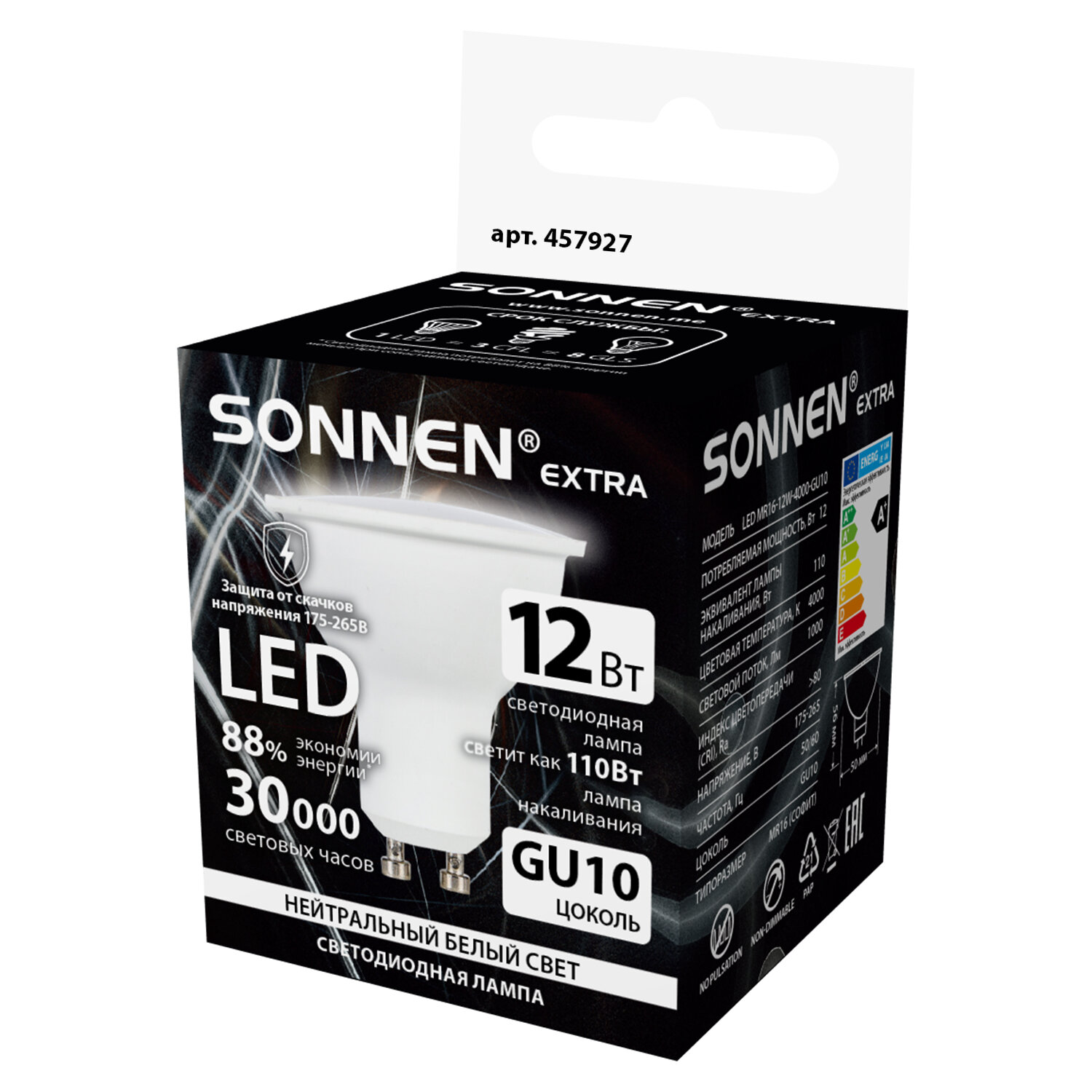 Лампа светодиодная SONNEN EXTRA, 12 (110) Вт, GU10, софит, нейтральный белый, 30000 ч, LED MR16-GU10-12W-4000 Код товара: 457927 67,5 ₽ Купить Производитель:SONNEN Светодиодная лампа SONNEN EXTRA компактного размера. Срок службы лампы составляет не менее 30000 часов, что примерно в 30 раз больше, чем у обычной лампы накаливания. Оснащена цоколем типа GU10 и излучает нейтральный белый cвет. Отличается длительным сроком службы. Имеет форму колбы "софит" и сделана из белого матового пластика. Мощность лампы составляет 12 Вт. Представленная модель дает световой поток 1000 Лм, а цветовая температура равна 4000 K. Диаметр лампы составляет 50 мм. Производитель сохраняет за собой право на внесение изменений в технические характеристики, комплектацию и конструкцию данной модели для улучшения эксплуатационных свойств без предварительного уведомления.Производство: Китай Тип цоколя : GU10Количество в комплекте: 1 шт.Оттенок света: нейтральный белыйМощность: 12 ВтТип лампы: светодиоднаяТип колбы: софитВид колбы: матоваяМинимальное рабочее напряжение: 175 ВМаксимальное рабочее напряжение: 265 ВМощность эквивалентной по световому потоку лампы накаливания: 110 ВтСветовой поток: 1000 ЛмЦветовая температура: 4000 КИндекс цветопередачи: 80 %Срок службы: 30000 ч.Высота (длина) лампы: 56 ммДиаметр лампы: 50 ммСерия: EXTRAВес: 30 грРазмер упаковки: 5.4 × 5.2 × 6 смОбъём: 0.0002 м3Промежуточная упаковка: 5 штТранспортная упаковка: 100 штШтрих-код: 4606224501864 Сертификат-1.jpg Сертификат-2.jpg