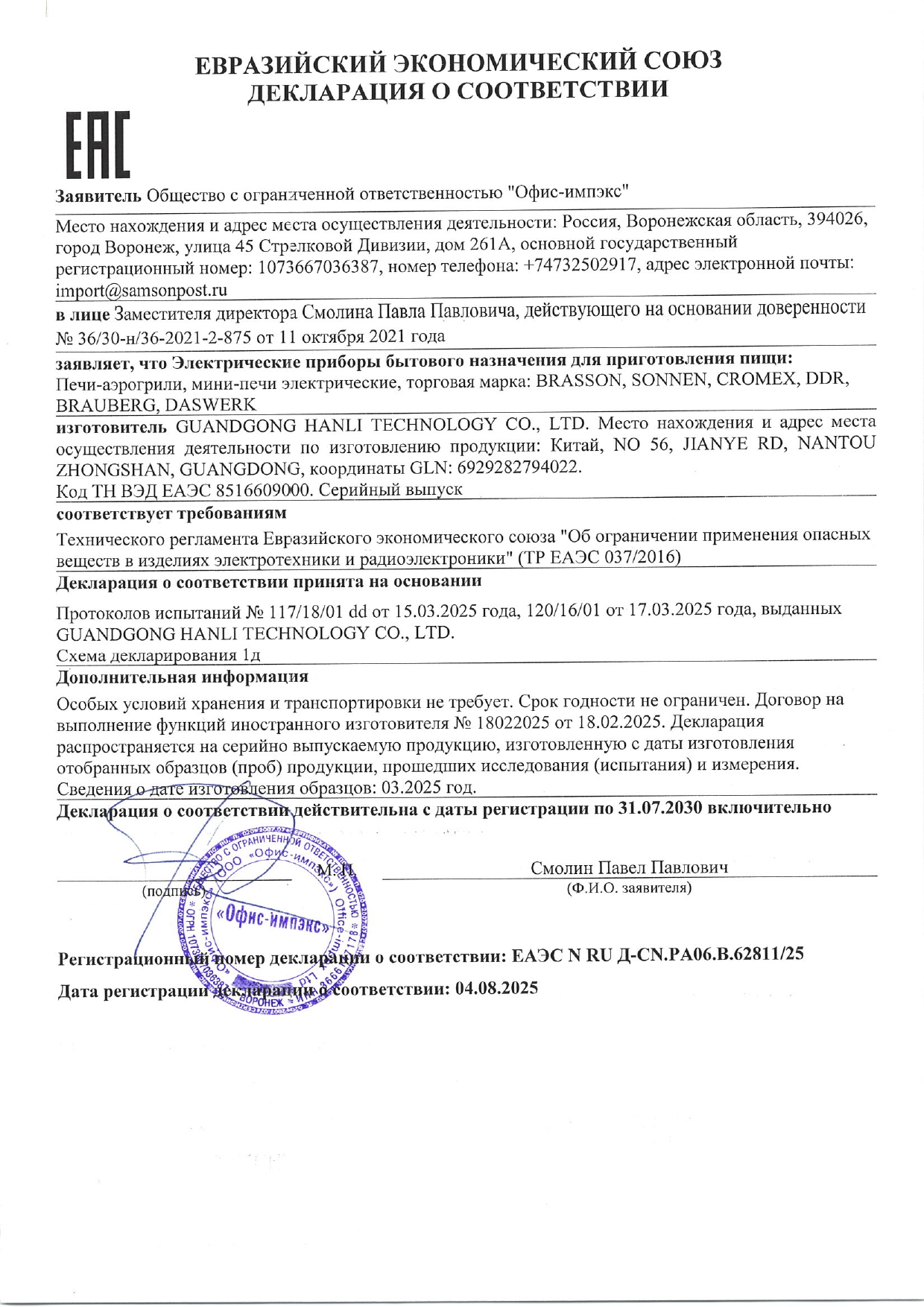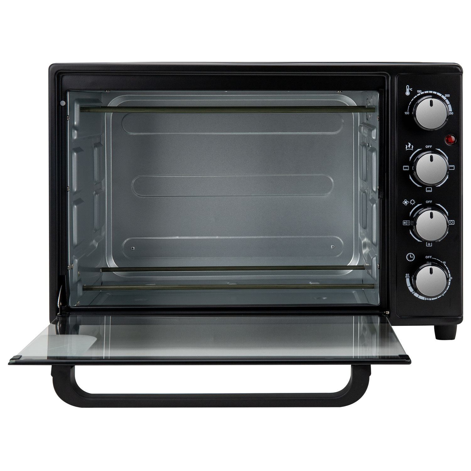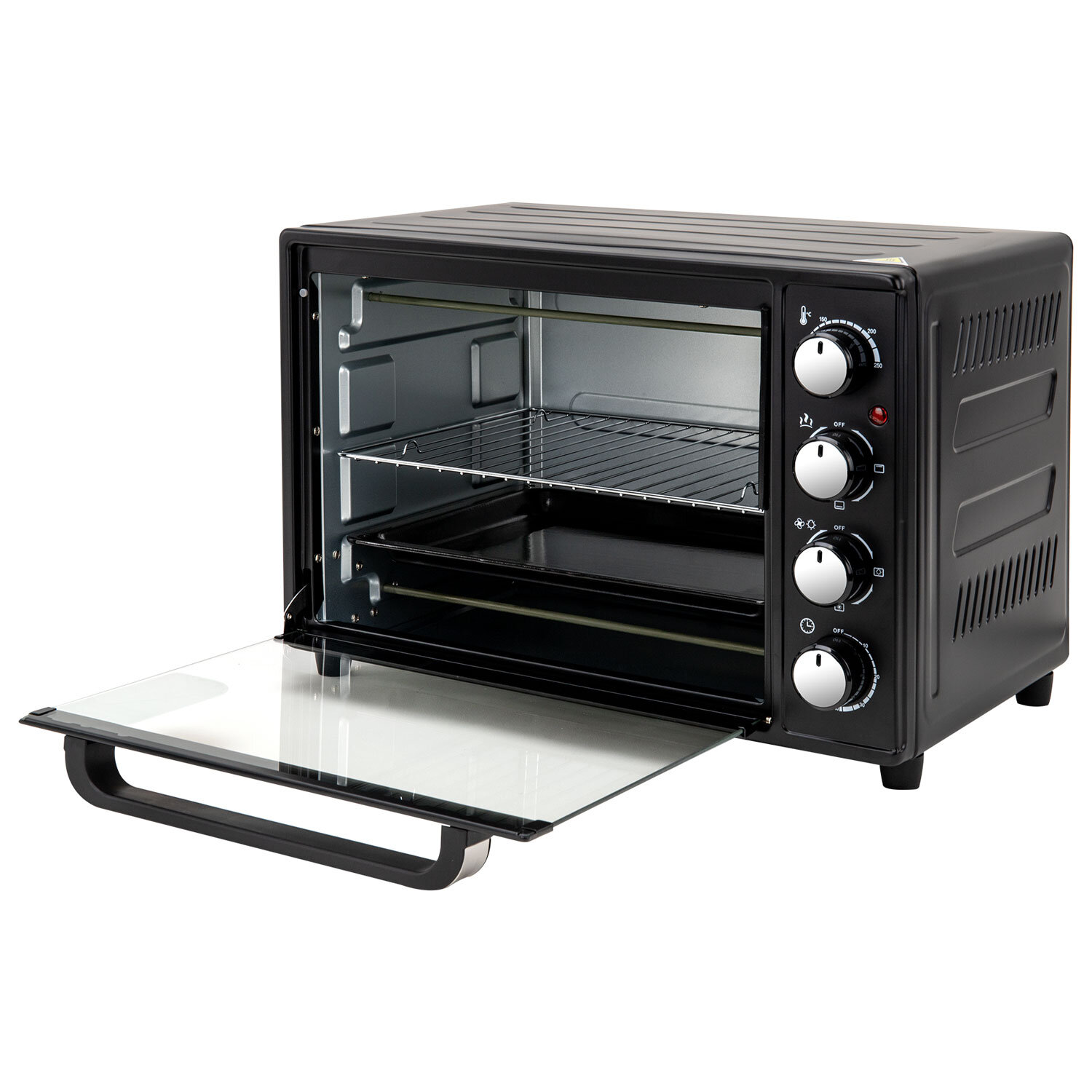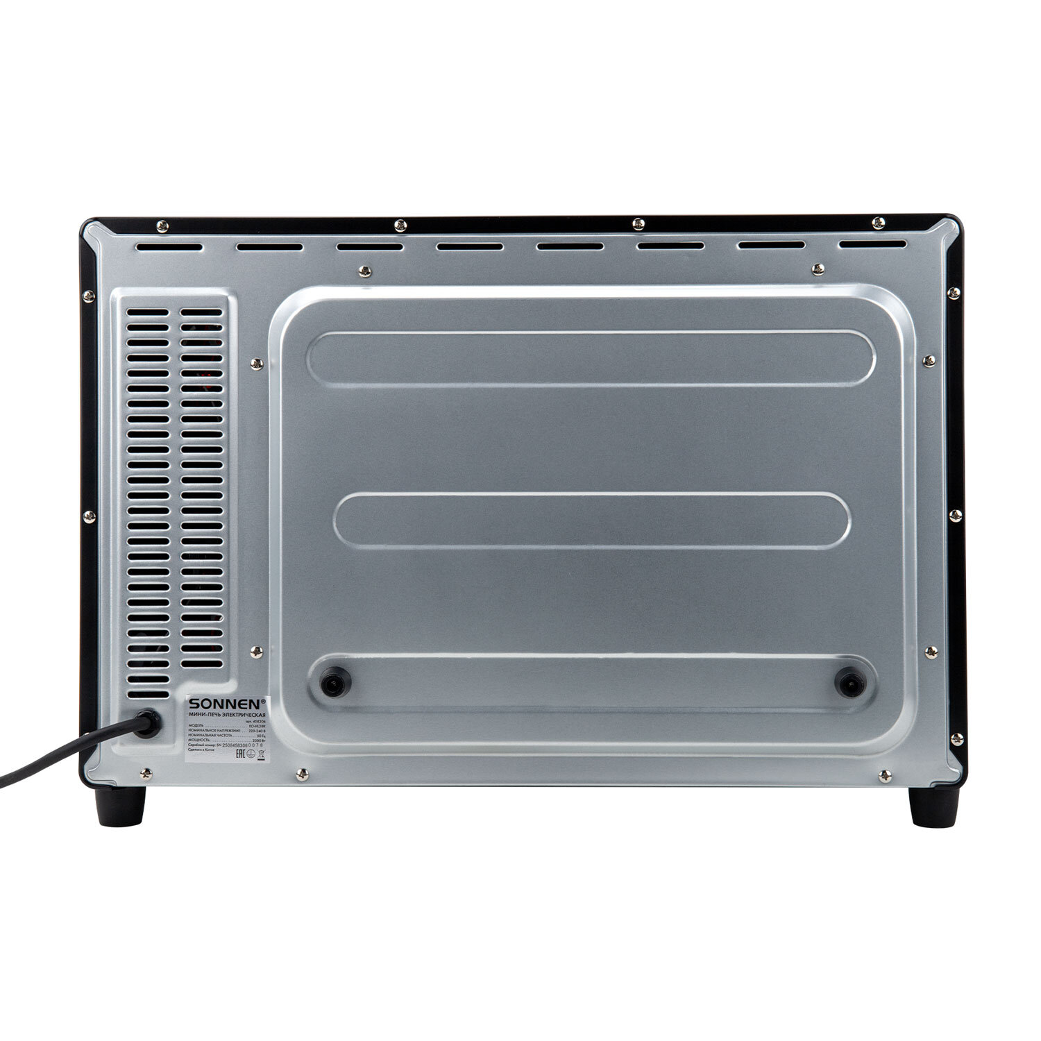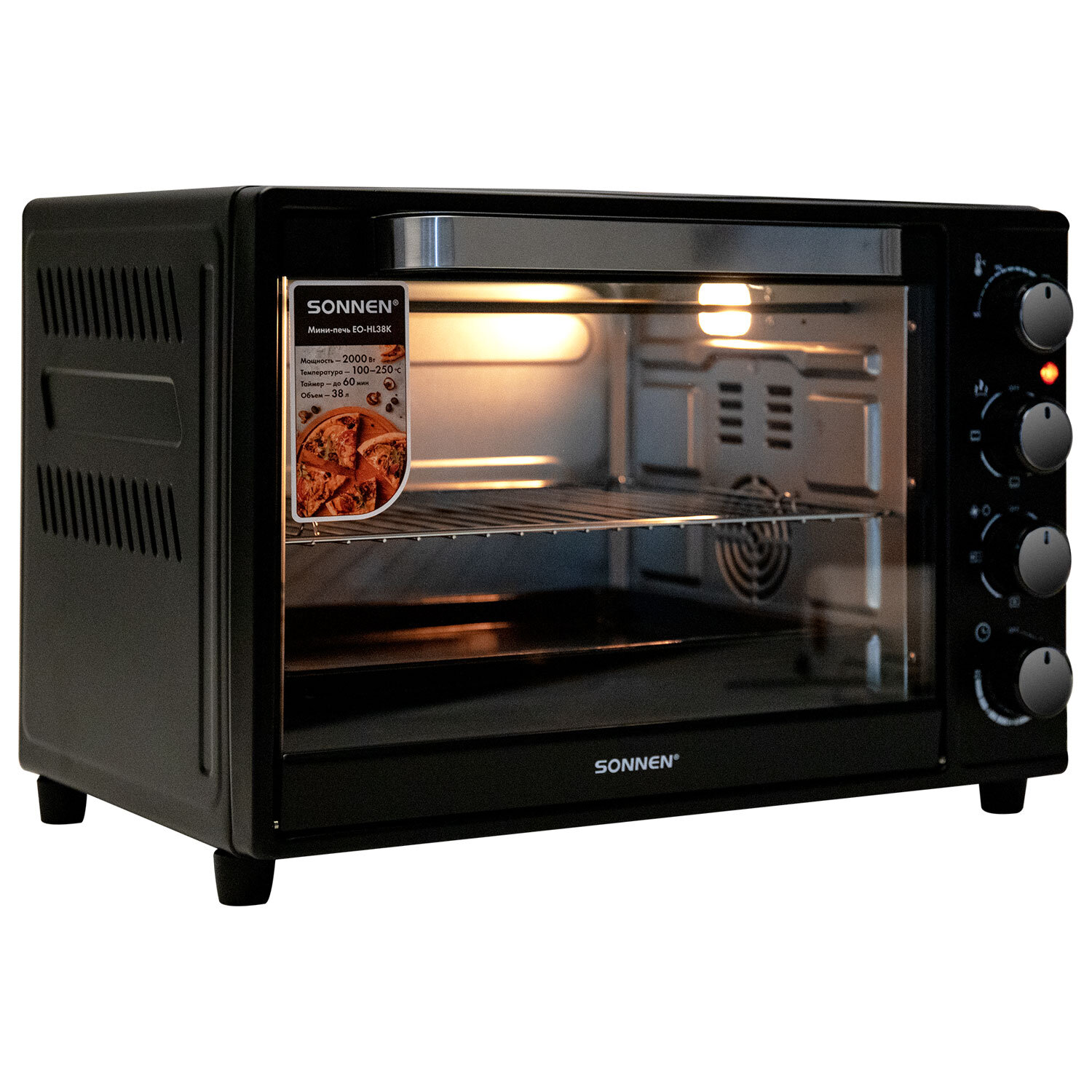 Мини-печь электрическая SONNEN EO-HL38K, 2000 Вт, 38 л, 3 режима нагрева, режим конвекции, таймер, механическое управление, черная Код товара: 458306 5 700,84 ₽ Купить Производитель:SONNEN Мини-печь SONNEN EO-HL38K обладает функциональностью полноценной духовки при компактных размерах. Мини-печь SONNEN EO-HL38K имеет внутренний объем 38 л, которого достаточно для приготовления блюд на всю семью. Мощность устройства – 2000 Вт, что обеспечивает быстрый нагрев и эффективное приготовление блюд. Система с 4 нагревательными элементами гарантирует равномерное приготовление блюда со всех сторон. Управление осуществляется с помощью 4 механических переключателей. Таймер с продолжительностью до 60 минут программирует необходимое время работы мини-печи. Также для приготовления разных блюд можно активировать режим конвекции, выбрать температуру в диапазоне 100-250 °C и подходящий режим нагрева: верхний, нижний или верхний + нижний. Подсветка камеры печи позволяет оценить степень готовности блюда. Размер устройства – 52,3х37,1х35,8 см. В комплекте с печью поставляется противень, решетка, ручка для противня, а также брошюра с рецептами.Производство: КитайМощность: 2000 ВтОбъем: 38 лКоличество режимов приготовления: 3Тип управления: механическоеВнутренняя подсветка: даТаймер: даАвтоматическое отключение и оповещение о готовности: даТип внутреннего покрытия: оцинкованная стальРешетка для жарки: даСерия: EO-HLЦвет: черныйВес: 8,92 кгРазмер упаковки: 39.6 × 57 × 42.5 смОбъём: 0.0959 м3Промежуточная упаковка: 1 штТранспортная упаковка: 1 штШтрих-код: 4606224518619 Файлы Приложение-1.pdf Сертификат-1.jpg Сертификат-2.jpg Сертификат-3.jpg Сертификат-4.jpg Сертификат-5.jpg Сертификат-6.jpg Сертификат-7.jpg
