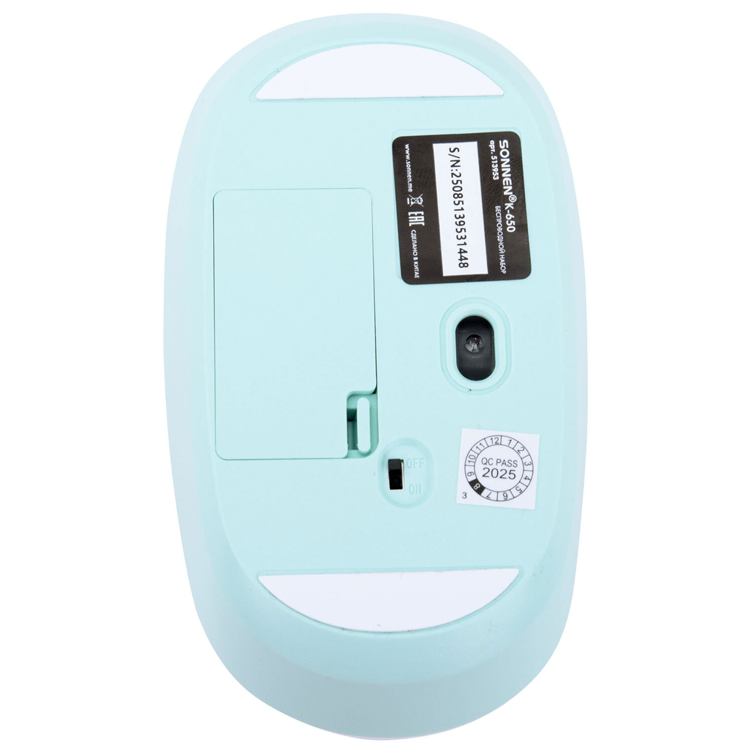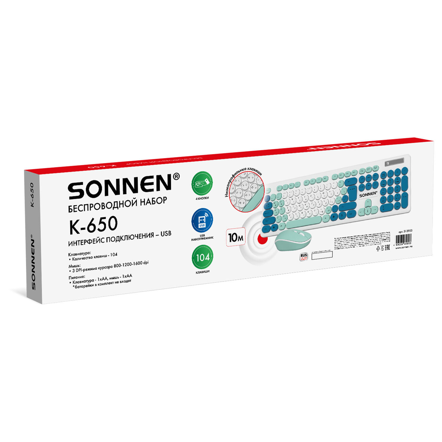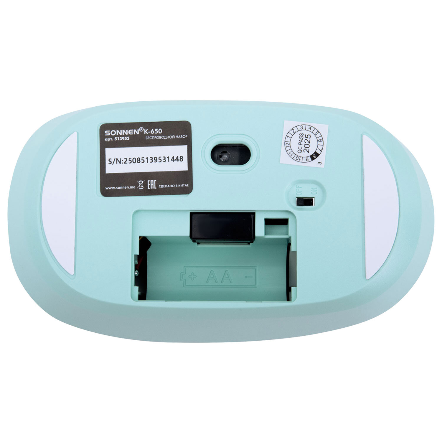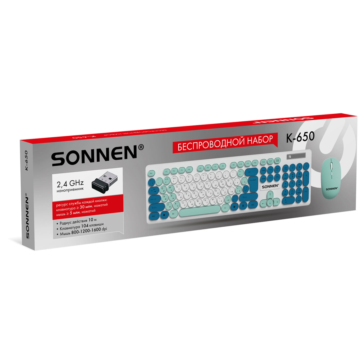 Набор беспроводной тихий: клавиатура 104 клавиши, мышь 4 кнопки 800/1200/1600 dpi, SONNEN K-650, белый / мятный / бирюзовый Код товара: 513953 1 237,16 ₽ Купить Производитель:SONNEN SONNEN K-650 – классический стильный комплект, сочетающий в себе функциональность, долговечность и исключительное удобство в работе. Внимание! Адаптер находится в отсеке для батареек клавиатуры! Беспроводное подключение: радиус действия – до 10 метров от компьютера или ноутбука. Клавиатура мембранного типа. Размер – 435,5х133х22 мм. Клавиатура имеет 104 основные клавиши. Также в комплект входит беспроводная мышь: 4 кнопки, разрешение сенсора (меняется с помощью дополнительной кнопки) – 800-1200-1600 dpi. Размеры – 60,2x32,5x110 мм. Питание клавиатуры – 1 батарея АА, мыши – 1 батарея АА (в комплект не входят!). Клавиатура и мышь выполнены в оригинальном дизайне. Цвет – белый / мятный / бирюзовый.Производство: КитайБеспроводное подключение: даРазъем клавиатуры и мыши: USBКоличество клавиш клавиатуры: 104Количество кнопок мыши: 4Технология сенсора мыши: оптическаяМаксимальное разрешение курсора: 1600 dpiРадиус действия: 10 мТип клавиатуры: мембраннаяЦвет: белый/мятный/бирюзовыйПитание клавиатуры: 1 батарея ААПитание мыши: 1 батарея ААШирина клавиатуры: 435.5 ммГлубина клавиатуры: 133 ммВысота клавиатуры: 22 ммСерия: K-650Вес клавиатуры: 368 гДлина мыши: 110 ммШирина мыши: 60.2 ммВысота мыши: 32.5 ммВес мыши: 52.4 гВес: 579 грРазмер упаковки: 4.7 × 51.4 × 14.1 смОбъём: 0.0037 м3Промежуточная упаковка: 20 штТранспортная упаковка: 20 штШтрих-код: 4606224458090 Файлы Сертификат-1.jpg Сертификат-2.jpg