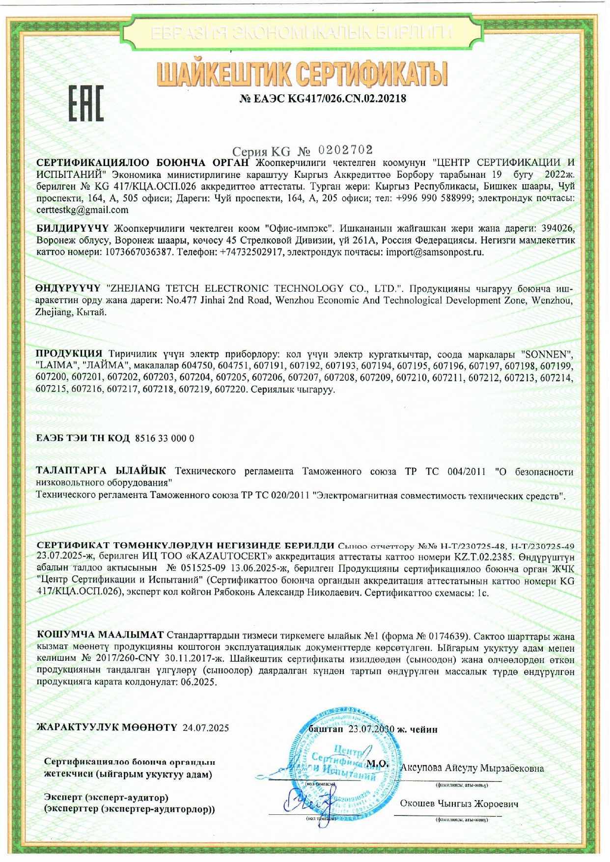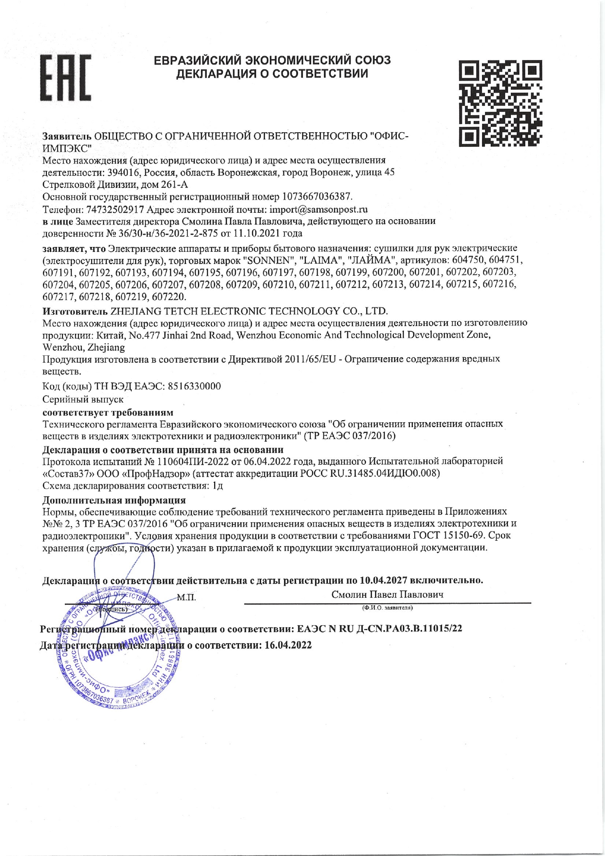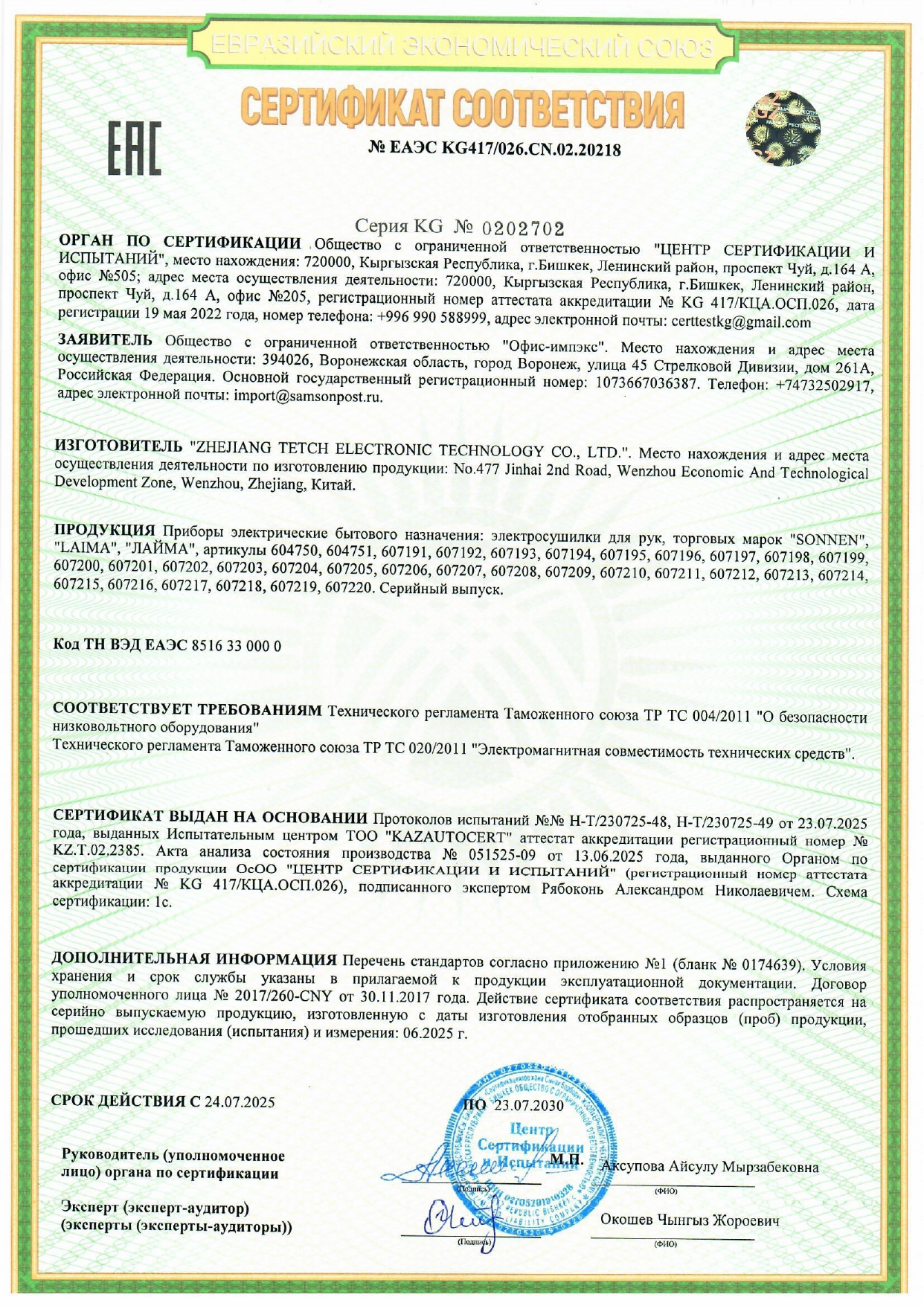 Сушилка для рук, встроенная в смеситель с подачей воды, сенсорная, SONNEN SF1204, 1200 Вт, 95 м/с, IP24, нержавеющая сталь Код товара: 607194 38 828,68 ₽ Купить Производитель:SONNEN Смеситель-электросушитель для раковины SONNEN SF1204 – это уникальное 2 в 1 сочетание смесителя с высокоскоростной сушилкой для рук, обладающее всеми преимуществами обоих устройств: гигиеничность, широкий функционал, надежность и многое другое. Мощность 1200 Вт обеспечивает время сушки рук всего за 15 секунд. Стандарт IP24 гарантирует защиту от брызг. Инфракрасные сенсоры отвечают за подачу воды и сушку рук. Эргономичный дизайн, надежная конструкция делают данную модель идеальным вариантом как для установки дома, так и для мест с высокой и средней проходимостью. Корпус из нержавеющей стали обеспечивает долговечность и антивандальную безопасность устройства. В комплект поставки входит набор для крепления. Воспользуйтесь нашей видеоинструкцией для быстрой и качественной установки смесителя-электросушилки. Данный товар относится к среднему ценовому сегменту.Производство: КитайТип: подвеснаяМощность: 1200 ВтВремя сушки: 10-20 секАвтоматическое включение: даКласс влагозащиты: IP24Уровень шума: 75 dBAАнтивандальный корпус: даМатериал корпуса: нержавеющая стальЦвет корпуса: серебристый матовыйДлина шнура: 0.76 мВысота: 263 ммШирина: 199 ммГлубина: 168 ммВес (без упаковки): 5.2 кгВес: 7,48 кгРазмер упаковки: 27.8 × 34.2 × 34 смОбъём: 0.038 м3Промежуточная упаковка: 2 штТранспортная упаковка: 2 штШтрих-код: 4606224467313 Файлы Приложение-1.mp4 Сертификат-1.jpg Сертификат-2.jpg Сертификат-3.jpg Сертификат-4.jpg Сертификат-5.jpg Сертификат-6.jpg Сертификат-7.jpg