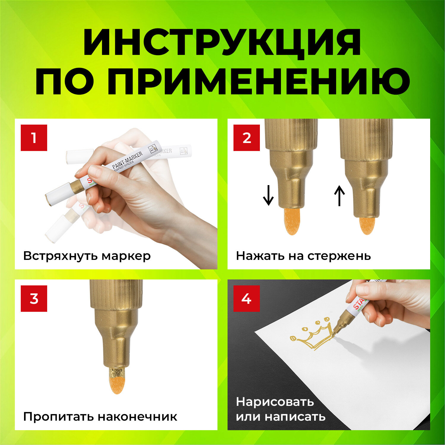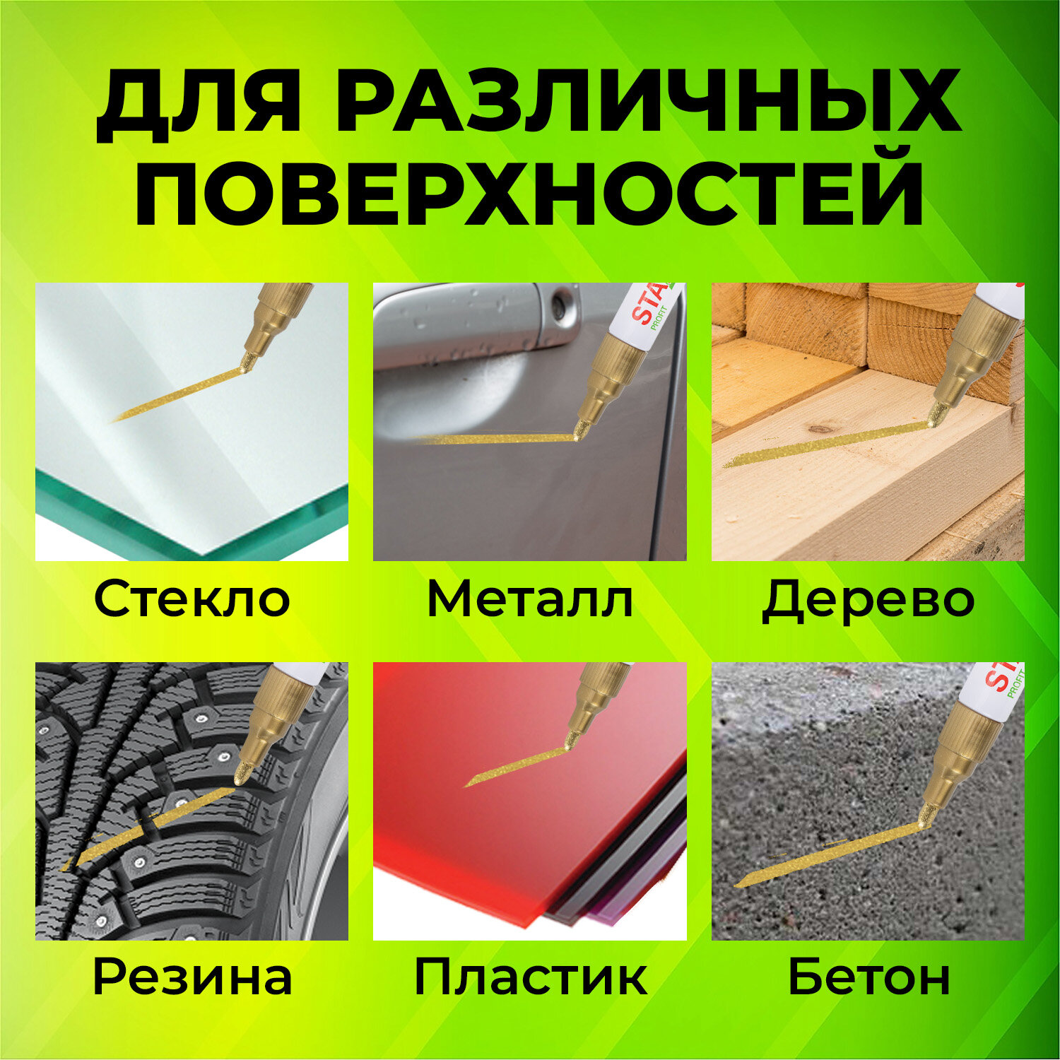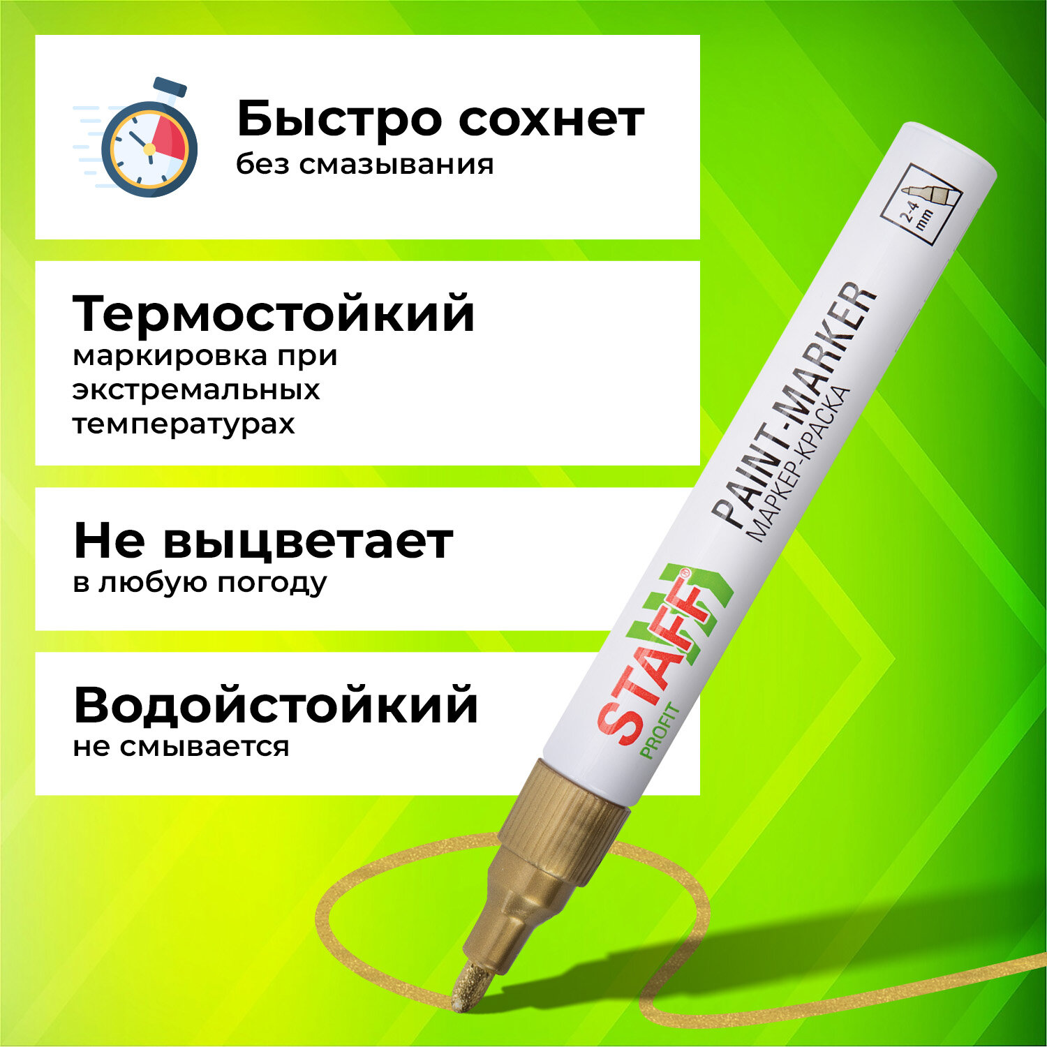 Маркер-краска лаковый (paint marker) 2-4 мм, ЗОЛОТИСТЫЙ, НИТРО-ОСНОВА, STAFF PROFIT, для любых поверхностей Код товара: 152579 85,78 ₽ Купить Производитель:STAFF Маркер-краска лаковый STAFF PROFIT предназначен для маркировки различных поверхностей: бетон, дерево, стекло, металл, резина, пластик. Подходит для использования как в промышленных, так и в бытовых целях. СПОСОБ ПРИМЕНЕНИЯ: 1. Перед использованием хорошо встряхнуть с закрытым колпачком. 2. Снять колпачок, надавить наконечником на поверхность. 3. Подождать 20 секунд, когда краска полностью пропитает наконечник. 4. После использования плотно закрыть колпачок. Высококачественные чернила золотистого цвета с лаковым эффектом идеально подходят для нанесения долговечной маркировки на любые поверхности. Благодаря усиленной формуле чернил краска ложится ровным слоем, полностью закрашивая поверхность. С помощью круглого прочного наконечника, выполненного из пористого акрила с шириной линии письма 2-4 мм, можно легко наносить широкие линии равномерным и однородным слоем. Быстросохнущие чернила предотвращают смазывание в процессе маркировки. После высыхания надписи становятся термо- и водостойкими, а также устойчивыми к выцветанию и механическому истиранию. Отлично подходит для маскировки бытовых дефектов, таких как царапины и сколы. Надежный помповый механизм подачи чернил предотвращает вытекание и разбрызгивание в процессе использования, а также преждевременное высыхание. Корпус маркера выполнен из алюминия, внутри находятся 2 металлических шарика для взбалтывания краски. Цвет колпачка соответствует цвету чернил. Это товар эконом-сегмента, поэтому он отличается привлекательной ценой. Товар обладает базовым набором характеристик и простой упаковкой, при этом полностью соответствует основным требованиям потребителей.Производство: КитайТип: маркер-краскаСерия: PROFITКоличество в комплекте: 1 шт.Цвет чернил: золотойФорма наконечника: круглыйШирина линии письма: 2-4 ммЧернила с лакирующим эффектом: даМатериал корпуса: алюминийВодостойкие: даУстойчивы к выцветанию: даБыстросохнущие чернила: даСрок годности: 60 месВес: 23 грРазмер упаковки: 1.6 × 14.6 × 1.6 смОбъём: 0.0001 м3Промежуточная упаковка: 12 штТранспортная упаковка: 576 штШтрих-код: 4606224462172 Файлы Сертификат-1.jpg Сертификат-2.jpg Сертификат-3.jpg Сертификат-4.jpg Сертификат-5.jpg Сертификат-6.jpg Сертификат-7.jpg Сертификат-8.jpg Сертификат-9.jpg Сертификат-10.jpg Сертификат-11.jpg Сертификат-12.jpg Сертификат-13.jpg Сертификат-14.jpg Сертификат-15.jpg Сертификат-16.jpg Сертификат-17.jpg Сертификат-18.jpg Сертификат-19.jpg Сертификат-20.jpg Сертификат-21.jpg Сертификат-22.jpg Сертификат-23.jpg Сертификат-24.jpg Сертификат-25.jpg Сертификат-26.jpg