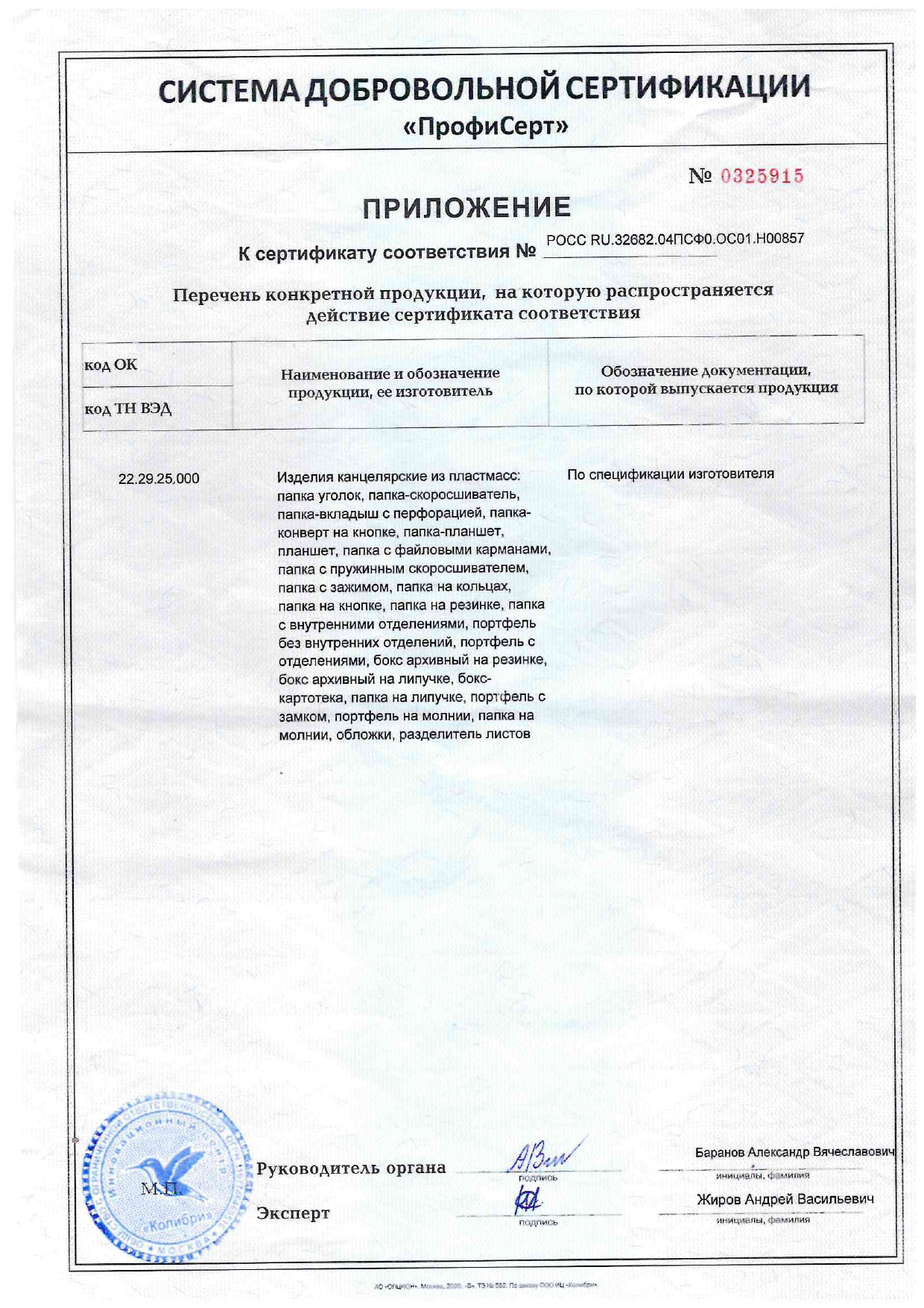 Папка 10 вкладышей STAFF, синяя, 0,5 мм Код товара: 225688 97,26 ₽ Купить Производитель:STAFF Папка STAFF солидного синего цвета предназначена для хранения документов в офисе. Также подходит для ресторанного и гостиничного бизнеса. Для маркировки содержимого на корешок наклеена этикетка. Папка изготовлена из пластика толщиной 0,5 мм с антибликовой фактурой, а ширина корешка составляет 8 мм. Содержит 10 вкладышей, позволяющих хранить документы формата А4 и обеспечивающих их надежную защиту от попадания влаги, пыли и прочих повреждений.Производство: РоссияКоличество карманов: 10 шт.Формат: А4Ширина корешка: 8 ммАнтибликовая фактура: даЦвет: синийСерия: StandardФактура: песокТолщина пластика: 0.5 ммМатериал: пластикВес: 95 грРазмер упаковки: 0.1 × 48.8 × 30.9 смОбъём: 0.0002 м3Промежуточная упаковка: 5 штТранспортная упаковка: 90 штШтрих-код: 4606224129969 Файлы Сертификат-1.jpg Сертификат-2.jpg Сертификат-3.jpg Сертификат-4.jpg