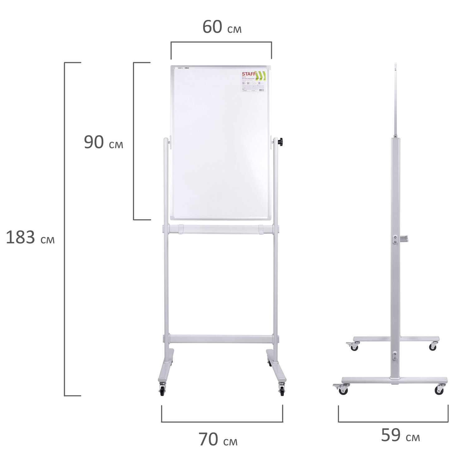 Доска магнитно-маркерная НА СТЕНДЕ 60х90 см, 2-сторонняя, STAFF Код товара: 238013 12 479,01 ₽ Купить Производитель:STAFF Двусторонняя магнитно-маркерная доска на стенде STAFF предназначена для наглядной демонстрации информации при проведении тренингов, совещаний и презентаций. Лаковое покрытие предназначено для письма специальными маркерами для белой доски. Металлическая поверхность позволяет размещать информацию при помощи магнитов. Вращается в горизонтальной плоскости на 360°. Перемещается на колесиках. Элементы крепления и лоток для принадлежностей входят в комплект. Размер доски – 90х60 см. Перед началом работы необходимо удалить защитную пленку с рабочей поверхности доски.Производство: КитайТип доски: напольная 2-сторонняяРазмер доски (ВхШ): 90х60 смМаксимальная ширина доски: 60 смВысота в сборе: 183 смПокрытие рабочей поверхности: лаковоеМатериал рамы: алюминийСерия: Stand-upУкреплённые пластиковые уголки: даВращается в горизонтальной плоскости на 360 градусов: даПеремещается на колесиках: даРазметка: нетШирина рамки: 2.16 смТолщина рамки: 1.69 смКомплектация: полка для принадлежностей, элементы крепленияТип крепления: нетМатериал рабочей поверхности: стальВес: 8.2 кгРазмер упаковки: 78 × 138 × 7 смОбъём: 0.0753 м3Промежуточная упаковка: 1 штТранспортная упаковка: 1 штШтрих-код: 4606224360898 Файлы Сертификат-1.jpg Сертификат-2.jpg Сертификат-3.jpg Сертификат-4.jpg Сертификат-5.jpg Сертификат-6.jpg Сертификат-7.jpg Сертификат-8.jpg Сертификат-9.jpg Сертификат-10.jpg Сертификат-11.jpg Сертификат-12.jpg Сертификат-13.jpg Сертификат-14.jpg Сертификат-15.jpg Сертификат-16.jpg Сертификат-17.jpg Сертификат-18.jpg Сертификат-19.jpg Сертификат-20.jpg Сертификат-21.jpg Сертификат-22.jpg Сертификат-23.jpg Сертификат-24.jpg Сертификат-25.jpg Сертификат-26.jpg