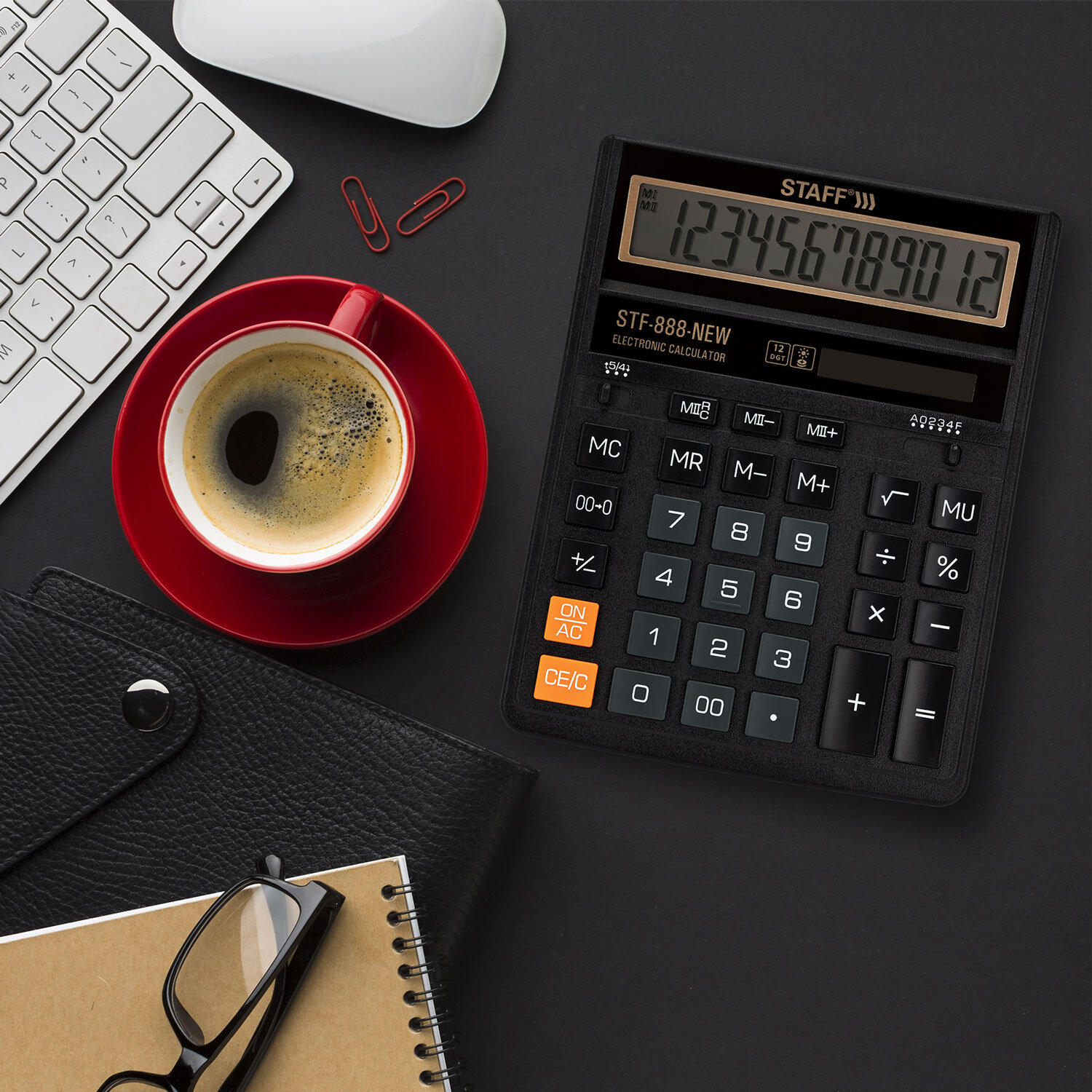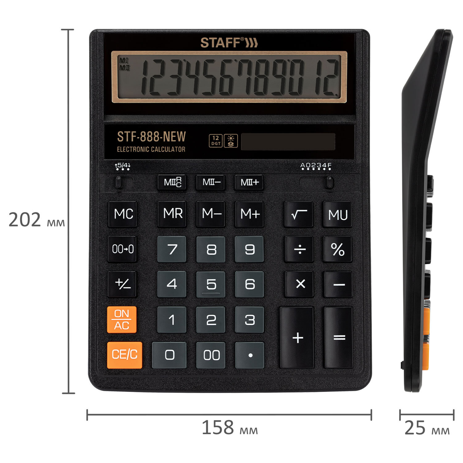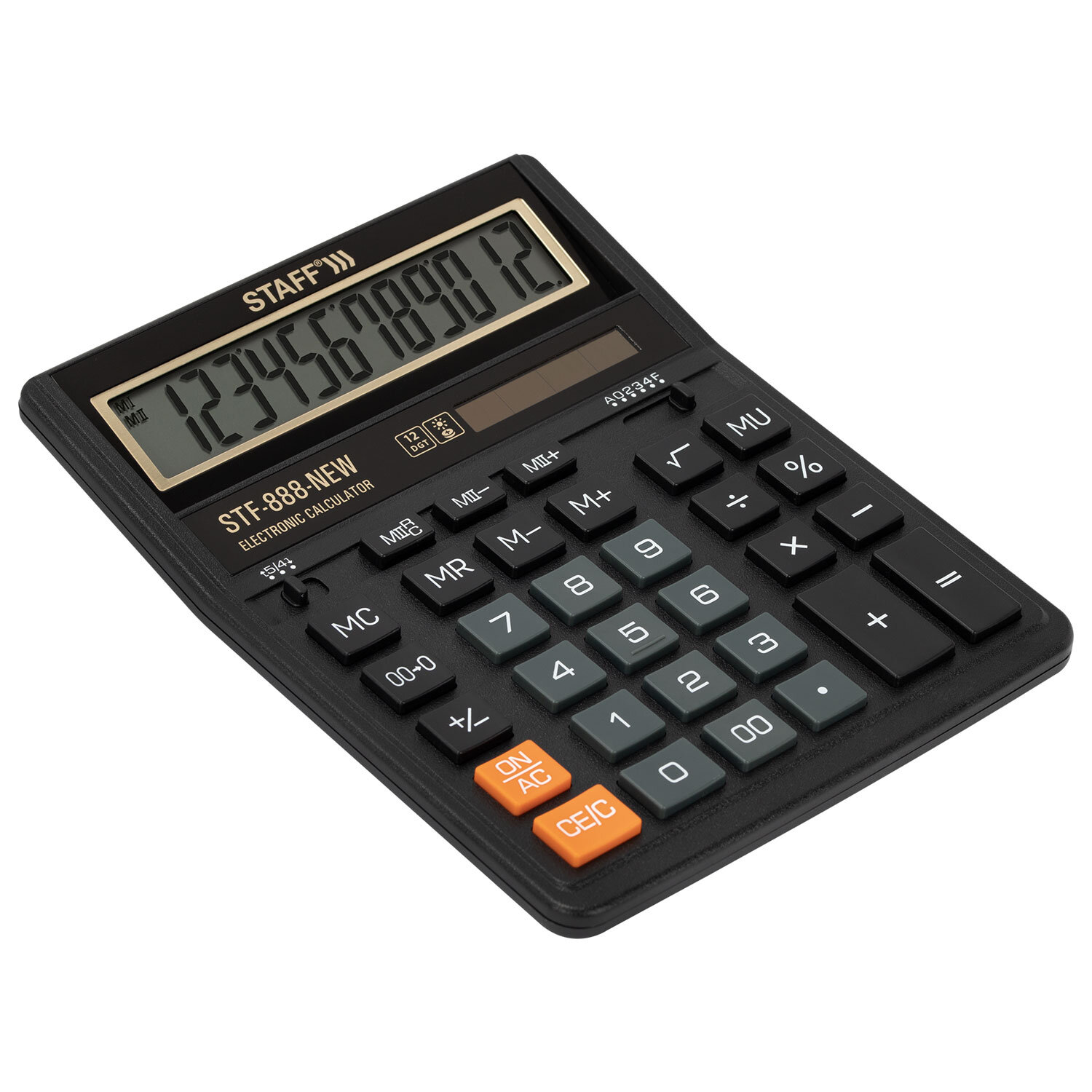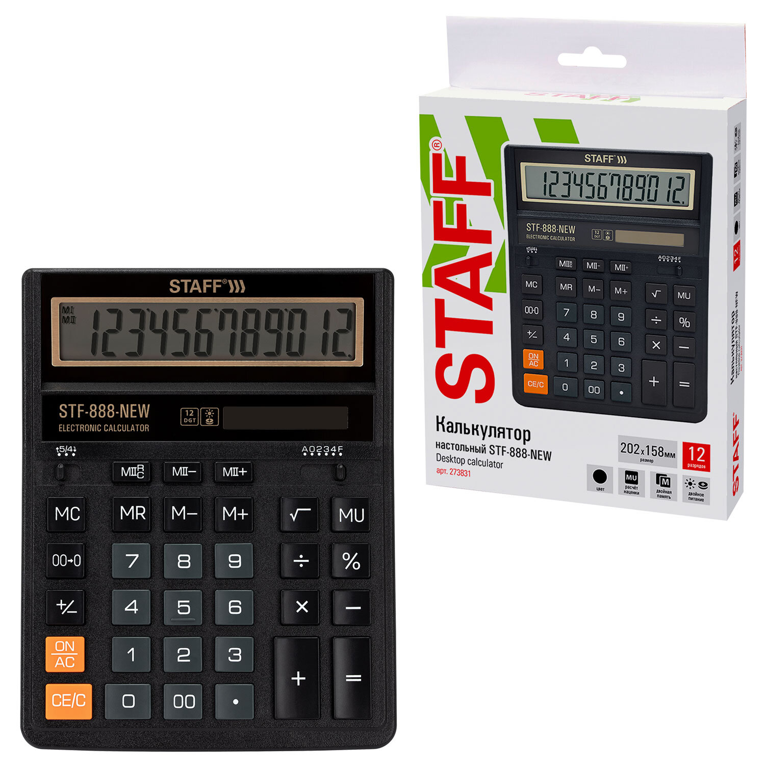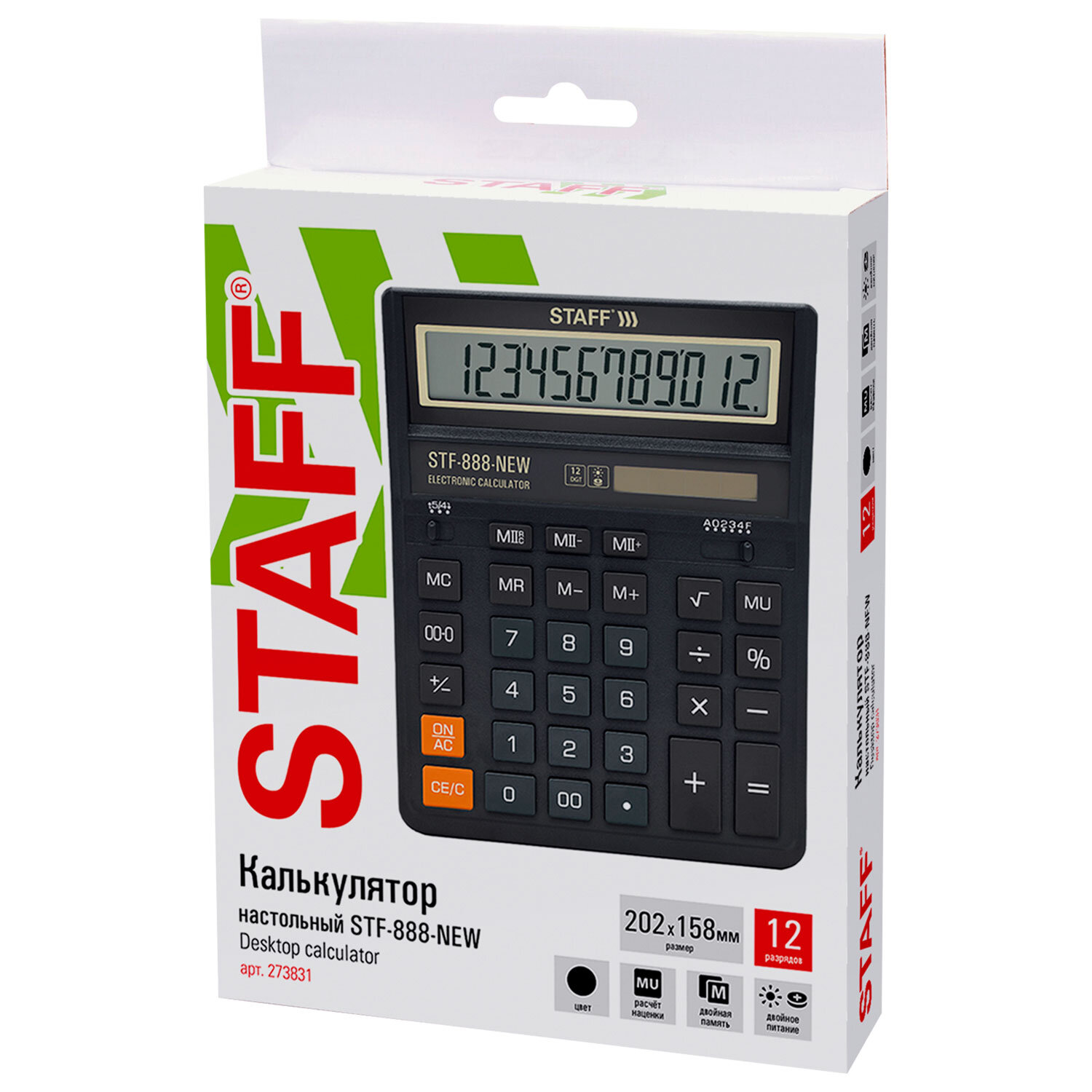 Калькулятор настольный STAFF STF-888-New (202x158 мм), 12 разрядов, двойное питание, черный Код товара: 273831 578,49 ₽ Купить Производитель:STAFF Настольный калькулятор STAFF 888-New – прекрасный выбор для бухгалтеров, продавцов, банковских и офисных сотрудников. Модель STAFF STF-888-New имеет две независимые памяти, возможность установки режимов округления и изменения количества знаков после запятой, клавишу "Два нуля". Разрядность дисплея – 12 выводимых на табло цифр, позволяет работать с крупными числами. Клавиша вычисления MU предназначена для финансовых расчетов с учетом торговой наценки. Для экономии энергии предусмотрены два источника питания: солнечная и алкалиновая батареи. Благодаря крупному дисплею и клавишам эта модель конфортна в использовании. Калькулятор выполнен в черном универсальном цвете со стильной золотистой рамкой на дисплее.Производство: КитайРазрядность дисплея: 12Серия: STF-888-NewТип размера: полноразмерныйТип применения: для бухгалтеровСтиль: классическийФункционал: вычисление наценки (MU), расчет процентов, сложение, вычитание, деление, умножениеИсполнение: настольныйЧисло строк дисплея: 1Материал кнопок: пластикТип питания: 1 батарейка LR54 (LR1130/AG10), солнечный элементЦвет панели: черный/золотойДлина корпуса: 202 ммШирина корпуса: 158 ммВысота корпуса: 25 ммВес: 342 грРазмер упаковки: 3.7 × 24.3 × 16.2 смОбъём: 0.0016 м3Промежуточная упаковка: 10 штТранспортная упаковка: 60 штШтрих-код: 4606224498362 Сертификат-1.jpg Сертификат-2.jpg Сертификат-3.jpg