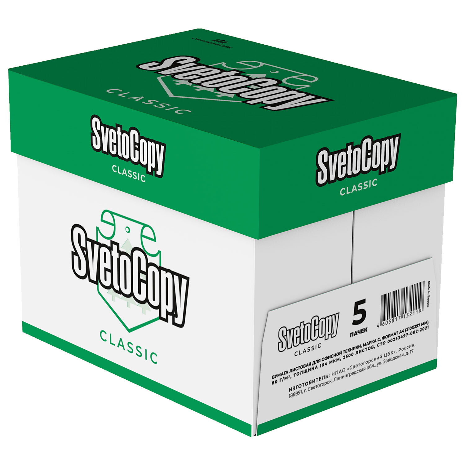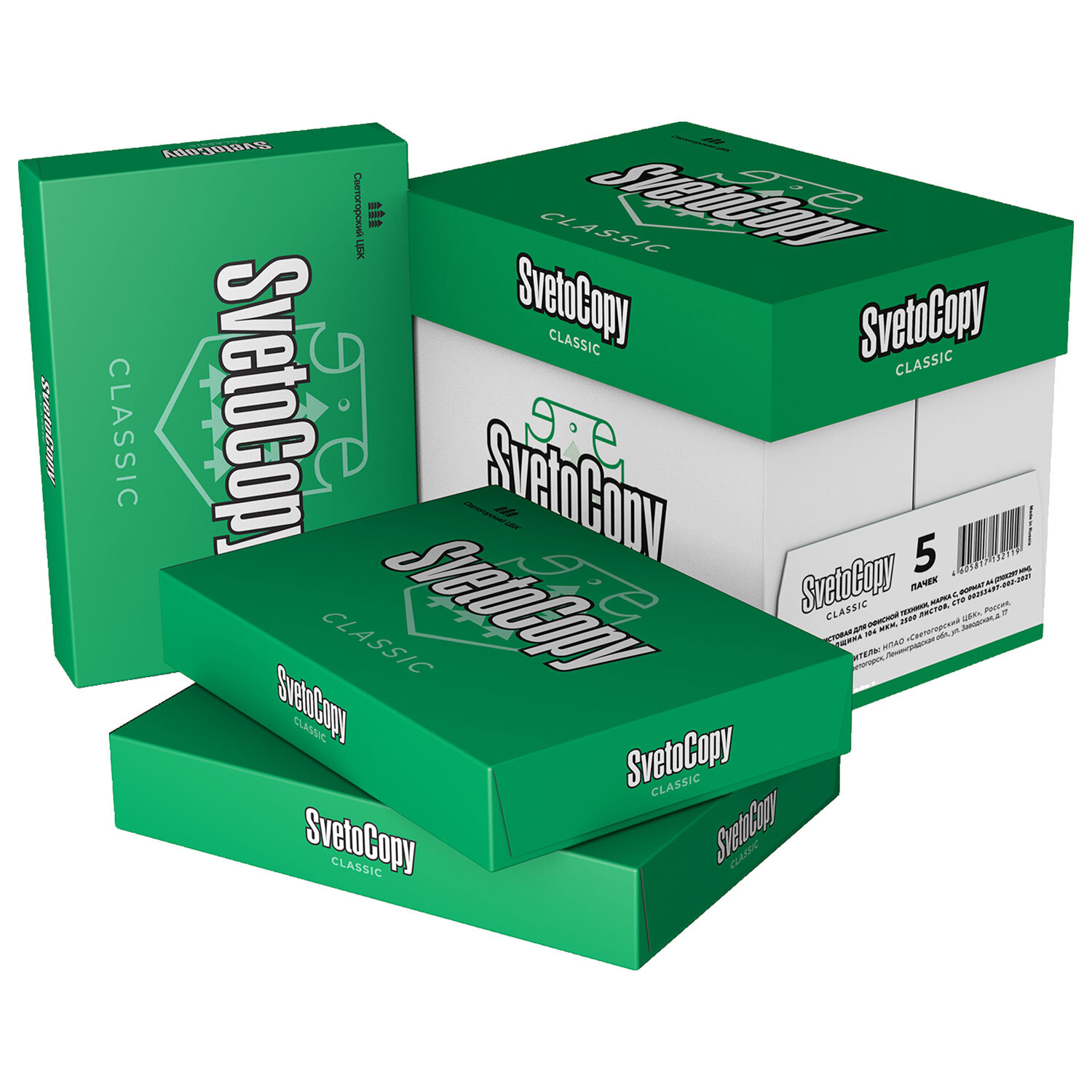 Бумага офисная А4, 80 г/м2, 500 л., марка С, SVETOCOPY CLASSIC, Россия, 146% (CIE) Код товара: 110086 364,54 ₽ Купить Производитель:SVETOCOPY Бумага SVETOCOPY предназначена для повседневной работы в офисе. Подходит для всех классов копировальных аппаратов и принтеров. SvetoСopy – бренд №1 в категории «Бумаги для офиса», а каждый второй потребитель офисной бумаги на вопрос о знании марок первой называет SvetoCopy*. Бренд появился на рынке в 1996 году, и SvetoCopy стала первой офисной бумагой, которая производится в России, а не импортируется из-за границы. Бумага SvetoCopy Classic делает работу и жизнь лучше вот уже больше 20 лет и характеризуется оптимальными показатели жесткости и толщины. Она идеально подходит для любого принтера и копировального аппарата независимо от его набора функций и периода операционной деятельности. Необходимая жесткость позволяет избежать «заминания» бумаги в принтере, а оптимальная влажность предупреждает скручивание листа. Высокий показатель непрозрачности обеспечивает хорошую читаемость текста. SvetoCopy любого формата (А4 и A3) относится к категории качества «С». Бумага этого класса - отличный вариант, подходящий для использования на многочисленном офисном оборудовании. Экономичность позволяет копировать и печатать документы в любых необходимых объемах. Стоимость упаковки бумаги Svetocopy A4 в нашем интернет-магазине зависит от количества приобретаемых единиц товара. Желаем приятных покупок по выгодной цене! * Источник: исследование IPSOS «Оценка здоровья брендов», 2017Производство: РоссияФормат: А4Марка: CСерия: ClassicБелизна по CIE: 140-150 ± 3 %Белизна по ISO: нет %Плотность: 72-80 ± 2-3 г/м2Соответствует требованиям ГОСТа: ГОСТ Р 57641-2017Количество листов в пачке: 500Отбелка целлюлозы без хлора (ECF): даУстойчива к старению: даКоличество пачек на палете: 240 шт.Вес: 2,5 кгРазмер упаковки: 5.4 × 29.9 × 21.3 смОбъём: 0.0038 м3Промежуточная упаковка: 5 штТранспортная упаковка: 5 штШтрих-код: 4605817132102 Файлы Приложение-1.pdf Приложение-2.pdf Сертификат-1.jpg Сертификат-2.jpg Сертификат-3.jpg Сертификат-4.jpg Сертификат-5.jpg Сертификат-6.jpg Сертификат-7.jpg Сертификат-8.jpg Сертификат-9.jpg Сертификат-10.jpg Сертификат-11.jpg Сертификат-12.jpg Сертификат-13.jpg Сертификат-14.jpg Сертификат-15.jpg Сертификат-16.jpg Сертификат-17.jpg Сертификат-18.jpg Сертификат-19.jpg Сертификат-20.jpg Сертификат-21.jpg Сертификат-22.jpg Сертификат-23.jpg Сертификат-24.jpg Сертификат-25.jpg Сертификат-26.jpg