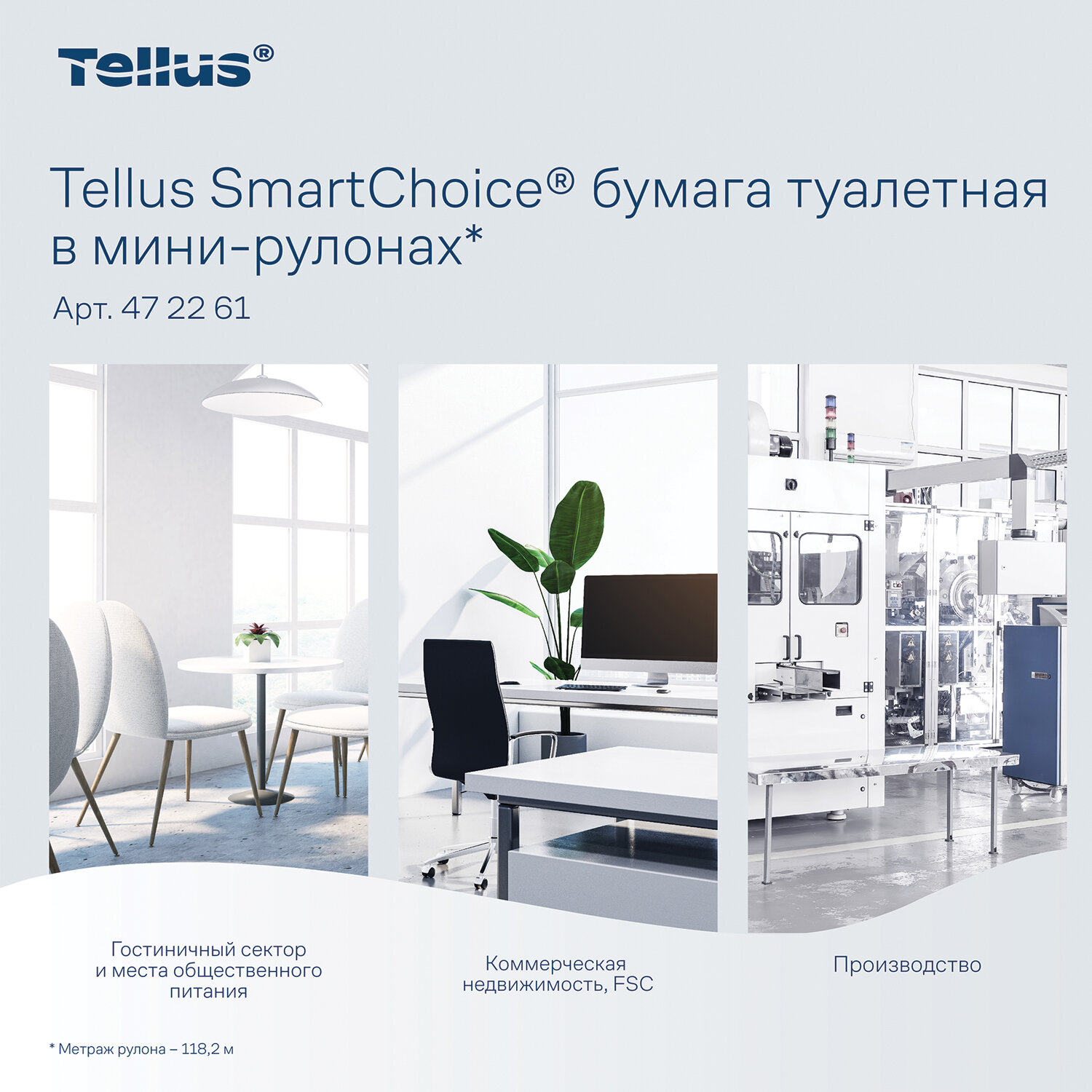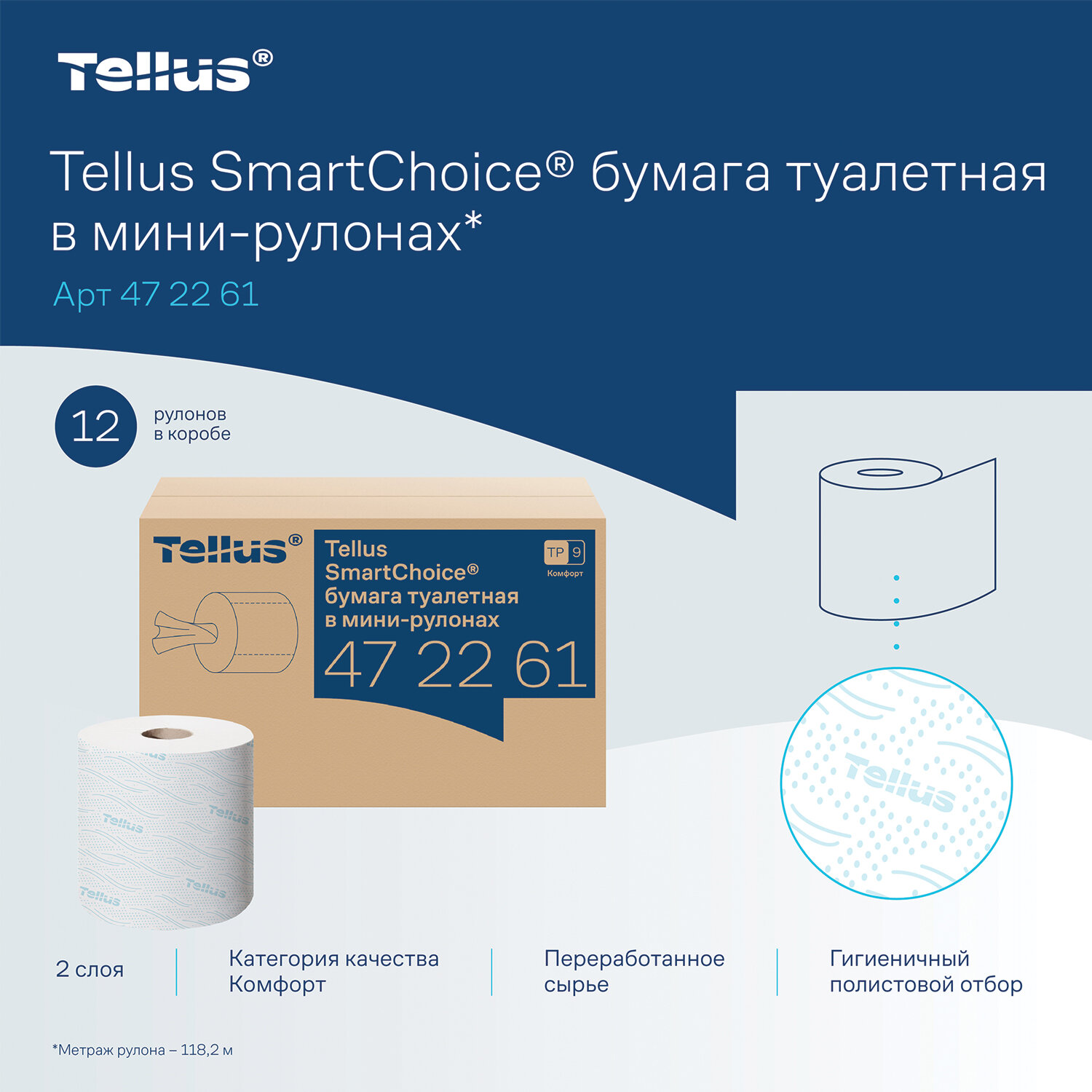 Бумага туалетная 130 м, Tellus/TORK (Система T9) SmartOne, ADVANCED, КОМПЛЕКТ 12 рулонов, 2-слойная, белая Код товара: 115493 3 710,69 ₽ Купить Производитель:Tellus/TORK Туалетная бумага в мини-рулонах Tellus SmartChoice обладает мягкостью и высокой степенью белизны. Яркий и необычный дизайн тиснения придает продукту индивидуальность. Подходит для использования в диспенсерах системы T9 (TP9), устанавливаемых в туалетных комнатах с высокой проходимостью. Полистовой отбор обеспечивает гигиеничность и позволяет контролировать расход. - Категория качества – Комфорт; - Произведено из переработанного сырья; - Рулоны с центральной вытяжкой; - Длина – 118 метров. 1 рулон заменяет 6 стандартных рулонов. Артикул: Tellus 472261.Производство: РоссияДиспенсерная система: T9 SmartOneТип: с центральной вытяжкойСырье: вторичное сырьеКоличество слоев: 2Тиснение: даПерфорация: даДоля вторичного сырья: 100 %Спайка/комплект: 12 штДлина намотки: 118.2 мДиаметр рулона: 149 ммШирина рулона: 13.2 смВнутренний диаметр втулки: 45 ммРазмер листа: 13,2х17 смШирина спайки: 14.9 смГлубина спайки: 14.9 смВысота спайки: 13.2 смКоличество листов в рулоне/пачке: 695Цвет: белыйСочетается с оборудованием других производителей: даСерия: КомфортВес: 6,81 кгРазмер упаковки: 27.8 × 45.6 × 31.1 смОбъём: 0.0394 м3Промежуточная упаковка: 1 штТранспортная упаковка: 1 штШтрих-код: 7322542130766 Сертификат-1.jpg Сертификат-2.jpg Сертификат-3.jpg