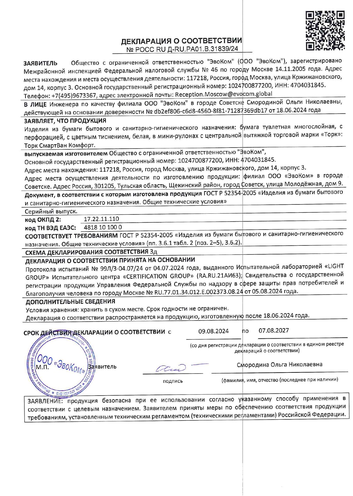 Бумага туалетная 170 метров, Tellus/TORK (Система T2) ADVANCED, КОМПЛЕКТ 12 рулонов, 2-слойная, белая Код товара: 126502 2 627,65 ₽ Купить Производитель:Tellus/TORK Качественная туалетная бумага для диспенсеров, изготовлена из переработанного сырья с тиснением серого цвета. Подходит для использования в местах со средней и высокой проходимостью. Высокая впитывающая способность, перфорация для отрыва листов. Подходит для диспенсерной системы Т2. Два слоя. В комплекте 12 рулонов длиной 170 м. Такого количества хватит на долгое время использования. Произведена с использованием вторичного сырья. С заботой о сохранении природных ресурсов. Артикул TORK 120231.Производство: РоссияДиспенсерная система: Т2Тип: рулонныеСырье: облагороженная макулатураКоличество слоев: 2Тиснение: даПерфорация: даДоля вторичного сырья: 100 %Спайка/комплект: 12 штДлина намотки: 170 мДиаметр рулона: 190 ммШирина рулона: 9.2 смВнутренний диаметр втулки: 59 ммРазмер листа: 9,2х14 смКоличество листов в рулоне/пачке: 1214Цвет: белыйСочетается с оборудованием других производителей: даРастворяется в воде: даСерия: AdvancedВес: 6,8 кгРазмер упаковки: 29.5 × 39 × 38.9 смОбъём: 0.0448 м3Промежуточная упаковка: 1 штТранспортная упаковка: 1 штШтрих-код: 4670199854805 Файлы Приложение-1.pdf Приложение-2.pdf Приложение-3.pdf Приложение-4.pdf Приложение-5.pdf Приложение-6.pdf Сертификат-1.jpg Сертификат-2.jpg