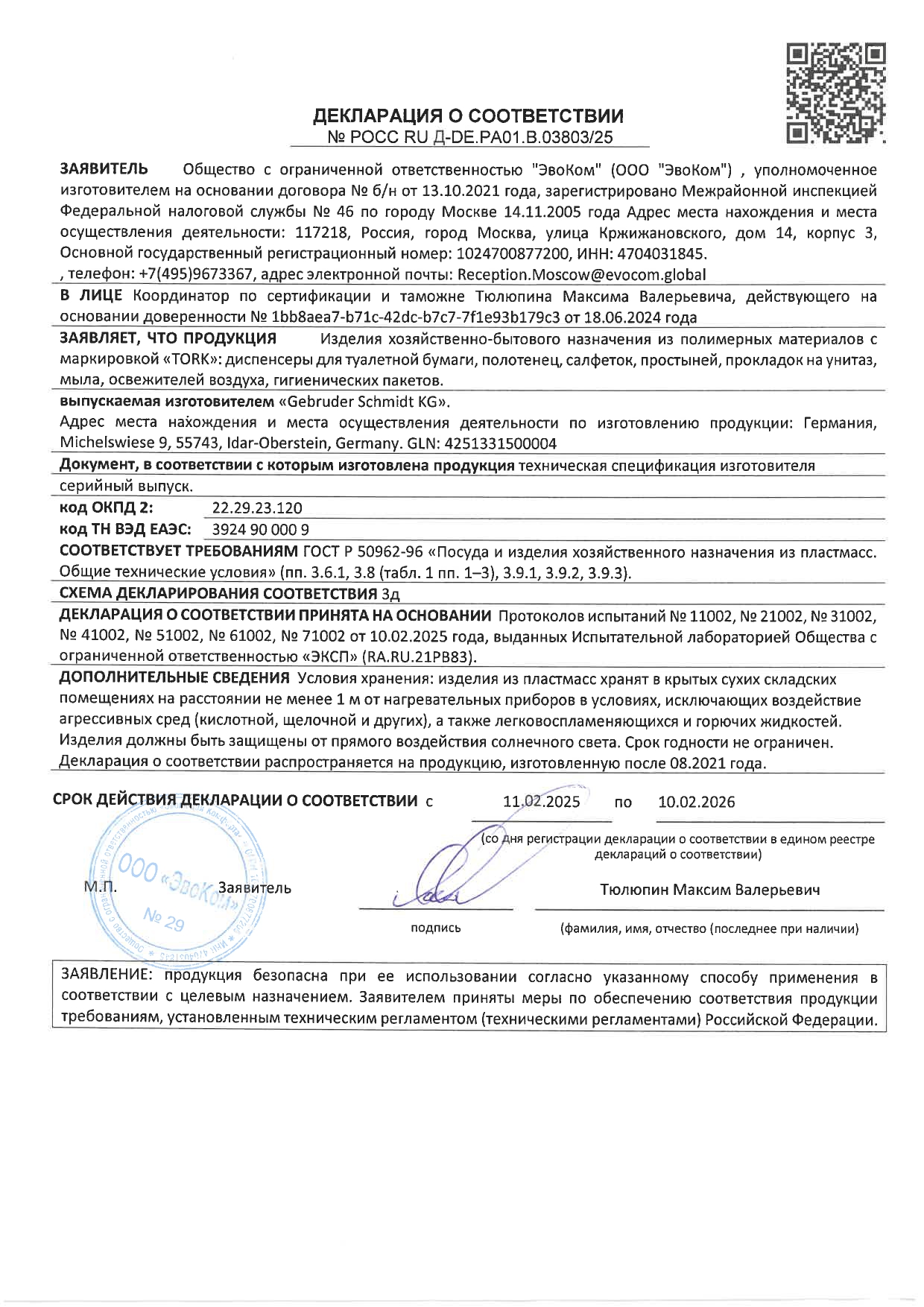 Диспенсер для полотенец TORK (Система H2) Elevation, mini, Z-сложения, белый Код товара: 600282 6 327,89 ₽ Купить Производитель:TORK Компактный держатель идеально подходит для туалетных комнат с малой площадью. Полотенце, сложенное по системе Multifold, на 1/3 больше стандартного полотенца, сложенного способом ZZ. Производство: ГерманияДиспенсерная система: Н2Вид расходных материалов: листовойПодходят бумажные полотенца: MultifoldРежим подачи полотенец: ручнойВместимость полотенец: 1 пач./рулоновСочетается с расходными материалами других производителей: даВозможность регулировки длины выдаваемого полотенца: даЕдиный металлический ключ для всех диспенсеров бренда: даСамозахлопывающийся замок: даСкрытый замок: даМатериал замка: металлМатериал корпуса: ударопрочный пластик ABSАртикул: 552100Серия: Elevation miniЦвет корпуса: белыйШирина: 302 ммВысота: 295 ммГлубина: 101 ммВес: 985 грРазмер упаковки: 10.5 × 30.4 × 30.6 смОбъём: 0.0098 м3Промежуточная упаковка: 1 штТранспортная упаковка: 1 штШтрих-код: 7322540349184 Сертификат-1.jpg Сертификат-2.jpg Сертификат-3.jpg