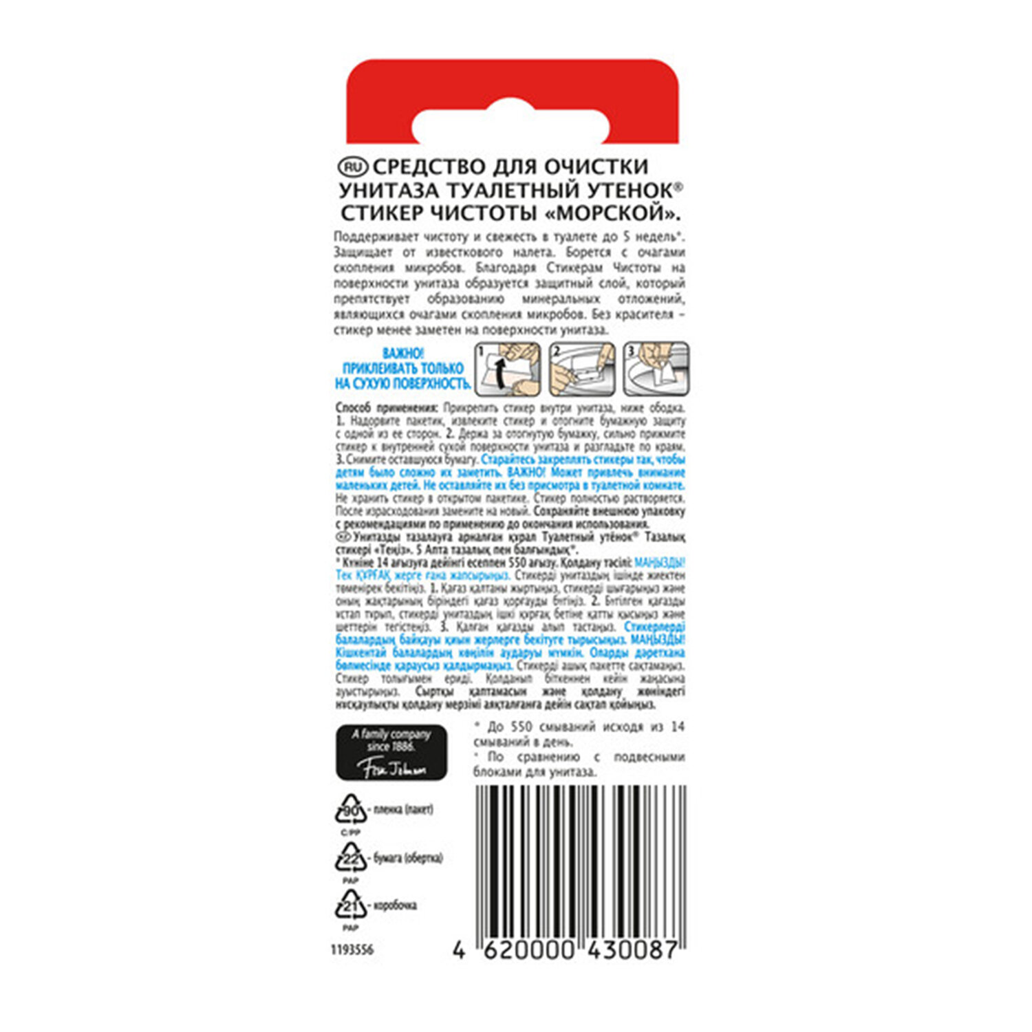 Освежитель/очиститель для унитаза/писсуара 3 шт. ТУАЛЕТНЫЙ УТЕНОК "Морской", Стикер чистоты Код товара: 602207 142 ₽ Купить Производитель:ТУАЛЕТНЫЙ УТЕНОК Освежитель/очиститель для унитаза/писсуара ТУАЛЕТНЫЙ УТЕНОК "Морской" поддерживают чистоту и свежесть в туалете до 5 недель. Защищают от известкового налета, борются с очагами скопления микробов. Не нужно заменять и прикасаться к грязным блокам. Поддерживает унитаз свежим между регулярными чистками гелем. Удобно и гигиенично. Способ применения 1. Надорвите пакетик, извлеките стикер и отогните бумажную защиту с одной из ее сторон. 2. Держа за отогнутую бумажку, СИЛЬНО ПРИЖМИТЕ стикер к внутренней сухой поверхности унитаза и разгладьте по краям. 3. Снимите оставшуюся бумагу. Старайтесь закреплять стикеры так, чтобы детям было сложно заметить. Стикер полностью растворяется. После израсходования замените на новый. Сохраняйте внешнюю упаковку с рекомендациями по применению до окончания использования. ОСТОРОЖНО! При попадании в глаза вызывает выраженное раздражение. При попадании на кожу вызывает слабое раздражение. Токсично для водных организмов. Условия хранения: хранить в сухом, недоступном для детей и домашних животных месте при температуре от -5 до +30 градусов отдельно от пищевых продуктов, напитков и корма для животных. После использования или по окончании срока годности упаковку/содержимое утилизировать как бытовые отходы. Состав: а-ПАВ более 30%, сульфат натрия, отдушка (Бутилфенилметилпропиональ, кумарин, эвгенол, d-лимонен, альфа-изометилионон), н-ПАВ менее 5%, акриловый сополимер менее 5%, красители.Производство: РоссияТип товара: стикерОбъем: 10 мл/гФорма выпуска: стикерОтдушка: "Морской"Количество в комплекте: 3 шт.Защита до: 35 днейСерия: Toilet CleanerЦвет: синийСрок годности: 24 месВес: 45 грРазмер упаковки: 3.2 × 11.5 × 5.4 смОбъём: 0.0002 м3Промежуточная упаковка: 24 штТранспортная упаковка: 24 штШтрих-код: 4620000430087 Сертификат-1.jpg Сертификат-2.jpg Сертификат-3.jpg