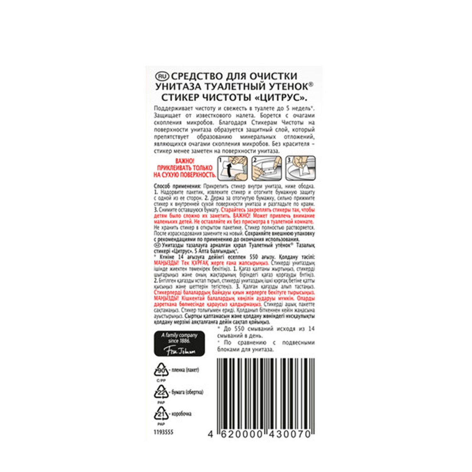 Освежитель/очиститель для унитаза/писсуара 3 шт. ТУАЛЕТНЫЙ УТЕНОК "Цитрус", стикер чистоты Код товара: 701795 145,18 ₽ Купить Производитель:ТУАЛЕТНЫЙ УТЕНОК Стикеры чистоты "Цитрус" ТУАЛЕТНЫЙ УТЕНОК поддерживают чистоту и свежесть в туалете до 5 недель. Защищают от известкового налета, борются с очагами скопления микробов. Чистит и освежает. Удобное и гигиеничное средство. Стикер легко крепится к внутренней поверхности унитаза, оставляет приятный свежий аромат. Способ применения 1. Надорвите пакетик, извлеките стикер и отогните бумажную защиту с одной из ее сторон. 2. Держа за отогнутую бумажку, СИЛЬНО ПРИЖМИТЕ стикер к внутренней сухой поверхности унитаза и разгладьте по краям. 3. Снимите оставшуюся бумагу. Старайтесь закреплять стикеры так, чтобы детям было сложно их заметить. Стикер полностью растворяется. После израсходования замените на новый. Сохраняйте внешнюю упаковку с рекомендациями по применению до окончания использования. Хранить в сухом, недоступном для детей и домашних животных месте при температуре от -5 до +30 °С отдельно от пищевых продуктов, напитков и корма для животных. После использования или по окончании срока годности упаковку/содержимое утилизировать как бытовые отходы. Состав: а-ПАВ не менее 30%, сульфат натрия, отдушка (d-лимонен, цитраль), н-ПАВ не более 5%, акриловый сополимер не более 5%. ТУ 20.41.32-001-18578805-2017.Производство: РоссияТип товара: стикерОбъем: 30 мл/гФорма выпуска: стикерОтдушка: ЦитрусКоличество в комплекте: 3 шт.Защита до: 35 днейСерия: Toilet CleanerЦвет: желтыйСрок годности: 24 месВес: 46 грРазмер упаковки: 3.1 × 11.5 × 5.4 смОбъём: 0.0002 м3Промежуточная упаковка: 24 штТранспортная упаковка: 24 штШтрих-код: 4620000430070 Сертификат-1.jpg Сертификат-2.jpg Сертификат-3.jpg