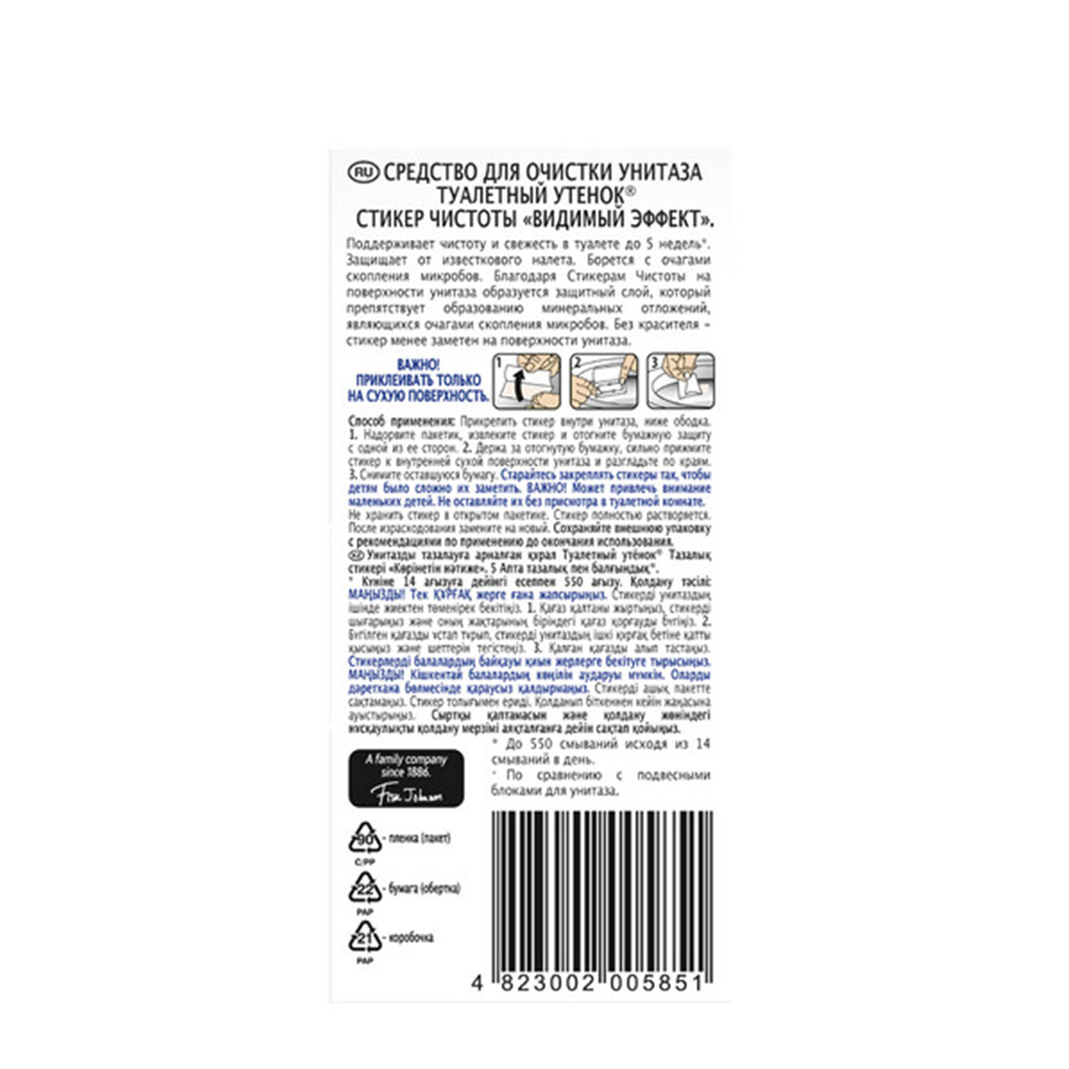 Освежитель/очиститель для унитаза/писсуара 3 шт. ТУАЛЕТНЫЙ УТЕНОК "Видимый эффект", стикер чистоты Код товара: 701796 142 ₽ Купить Производитель:ТУАЛЕТНЫЙ УТЕНОК Стикеры чистоты "Видимый эффект" ТУАЛЕТНЫЙ УТЕНОК поддерживают чистоту и свежесть в туалете до 5 недель. Защищают от известкового налета, борются с очагами скопления микробов. Стикер легко крепится к внутренней поверхности унитаза, оставляет приятный свежий аромат. Удобно и гигиенично. Содержит отбеливающий компонент (активный хлор), который эффективно очищает и отбеливает поверхность унитаза, а также обладает антимикробным действием. Способ применения 1. Надорвите пакетик, извлеките стикер и отогните бумажную защиту с одной из ее сторон. 2. Держа за отогнутую бумажку, СИЛЬНО ПРИЖМИТЕ стикер к внутренней сухой поверхности унитаза и разгладьте по краям. 3. Снимите оставшуюся бумагу. Старайтесь закреплять стикеры так, чтобы детям было сложно заметить. Стикер полностью растворяется. После израсходования замените на новый. Сохраняйте внешнюю упаковку с рекомендациями по применению до окончания использования. ОСТОРОЖНО! При попадании в глаза вызывает выраженное раздражение. При попадании на кожу вызывает слабое раздражение. Токсично для водных организмов. Вредно для водных организмов с долгосрочными последствиями. Состав: а-ПАВ не менее 30%, сульфат натрия, отдушка (Бутилфенилметилпропиональ, кумарин, цитраль), н-ПАВ не более 5%, дихлоризоцианурат натрия не более 5%, акриловый сополимер не более 5%. ТУ 20.41.32-001-18578805-2017.Производство: РоссияТип товара: стикерОбъем: 30 мл/гФорма выпуска: стикерОтдушка: нетКоличество в комплекте: 3 шт.Защита до: 35 днейСерия: Toilet CleanerЦвет: синийСрок годности: 24 месВес: 47 грРазмер упаковки: 3 × 11.7 × 5.5 смОбъём: 0.0002 м3Промежуточная упаковка: 24 штТранспортная упаковка: 24 штШтрих-код: 4823002005851 Сертификат-1.jpg Сертификат-2.jpg Сертификат-3.jpg