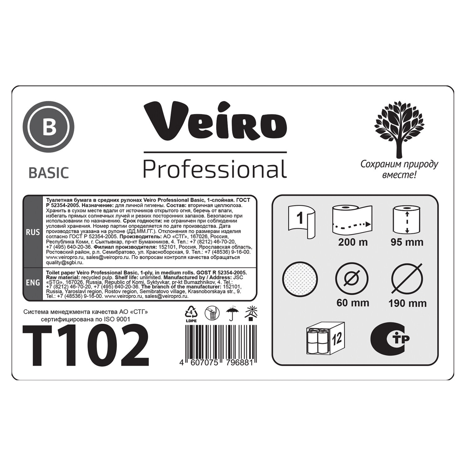 Бумага туалетная 200 м, VEIRO Professional (Система T2), КОМПЛЕКТ 12 шт., Basic Код товара: 127083 1 296,41 ₽ Купить Производитель:VEIRO PROFESSIONAL Уровень гигиены в туалетных комнатах всегда должен быть на высоте, ведь это является частью имиджа. Туалетная бумага VEIRO Professional - идеальное cочетание экономичности и качества. Подходит для диспенсерной системы - T2. Подходит для диспенсерной системы Т2. Один слой. В комплекте 12 рулонов длиной 200 м. Такого количества хватит на долгое время использования. Произведена с использованием вторичного сырья. С заботой о сохранении природных ресурсов. Артикул VEIRO T102.Производство: РоссияДиспенсерная система: Т2Тип: рулонныеСырье: макулатураКоличество слоев: 1Тиснение: даПерфорация: нетДоля вторичного сырья: 100 %Спайка/комплект: 12 штДлина намотки: 200 мДиаметр рулона: 190 ммШирина рулона: 9.5 смВнутренний диаметр втулки: 60 ммЦвет: натуральныйСочетается с оборудованием других производителей: даРастворяется в воде: даСерия: ProfessionalВес: 5,13 кгРазмер упаковки: 18.5 × 54.5 × 37.3 смОбъём: 0.0376 м3Промежуточная упаковка: 1 штТранспортная упаковка: 1 штШтрих-код: 4607075796881 Файлы Приложение-1.pdf Приложение-2.pdf Приложение-3.pdf Сертификат-1.jpg Сертификат-2.jpg Сертификат-3.jpg Сертификат-4.jpg