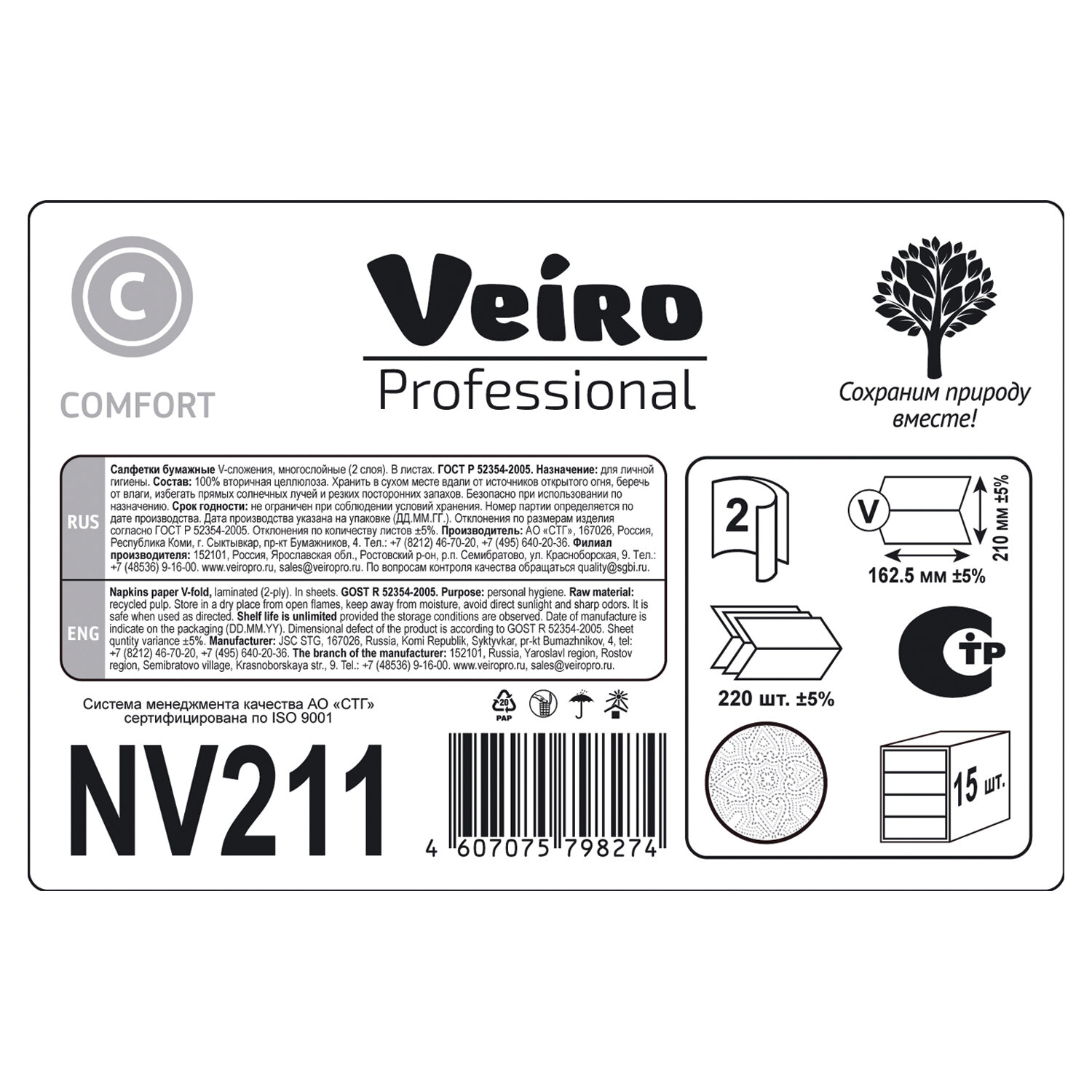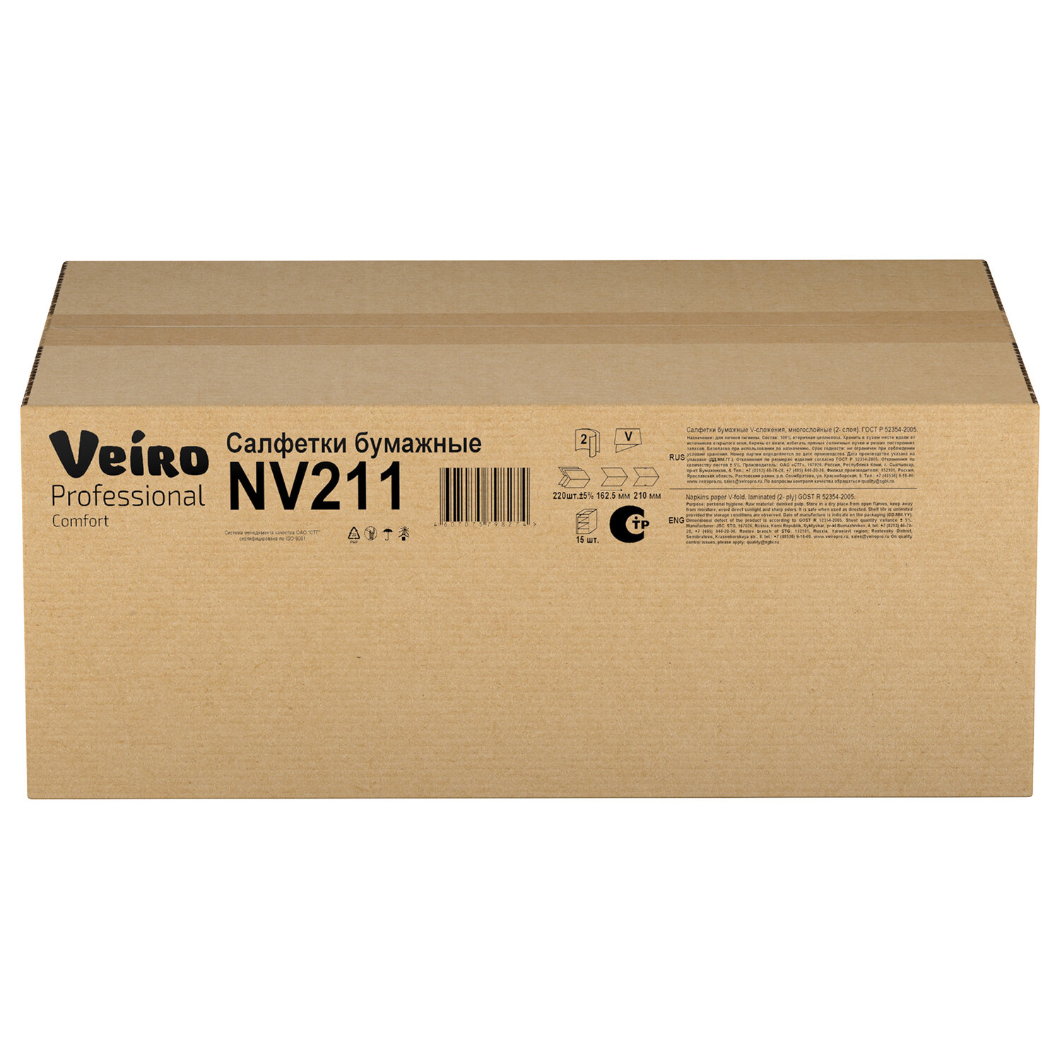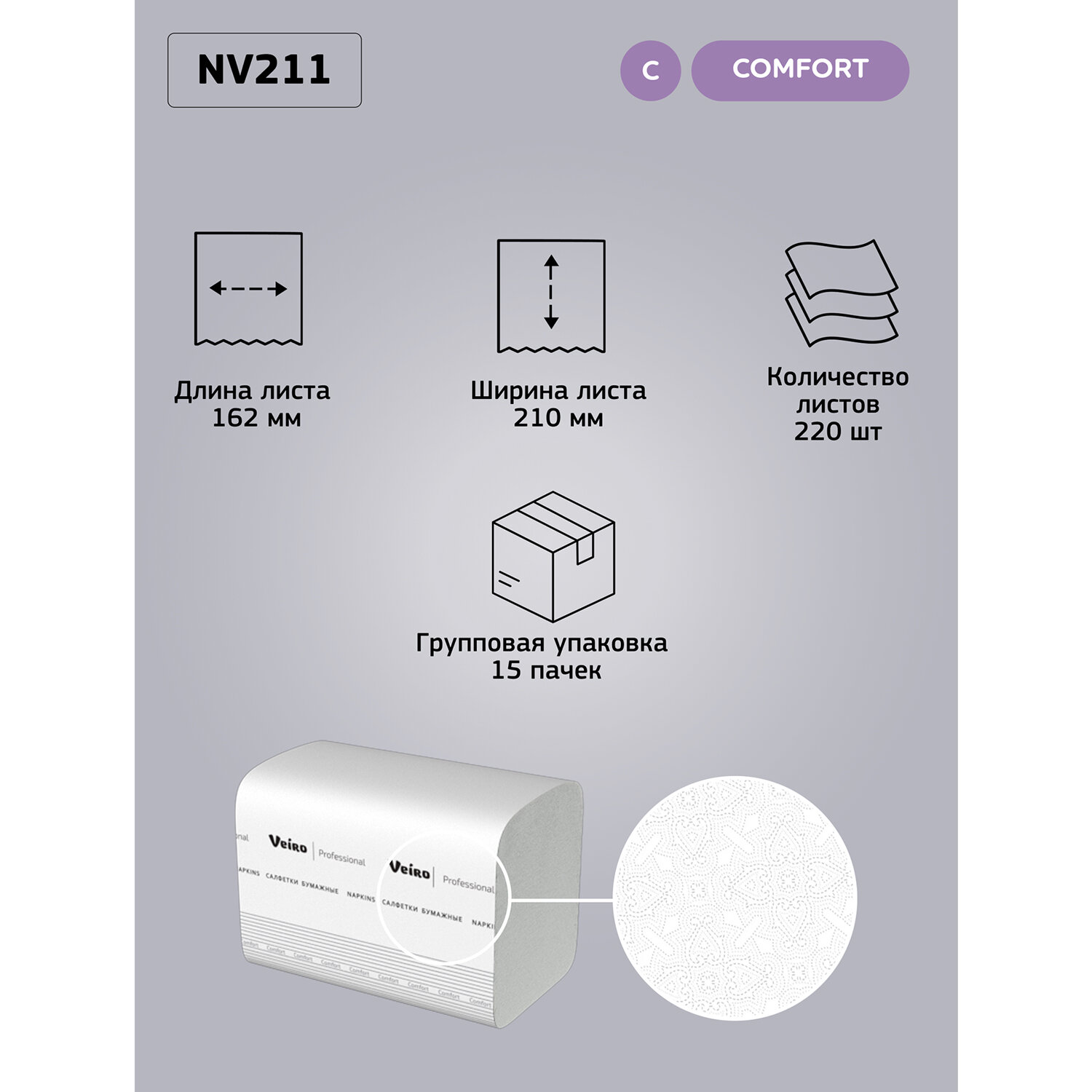 Салфетки VEIRO Professional (Система N4), Comfort, КОМПЛЕКТ 15 шт. х 220 шт., 2-слойные, белые, 21х16,2, V Код товара: 127092 2 072,36 ₽ Купить Производитель:VEIRO PROFESSIONAL Диспенсерные салфетки Veiro Professional идеально подходят для использования в ресторанах, кафе быстрого питания, офисных столовых, выездных мероприятиях и летних площадок. Подходят для диспенсерной системы - N4. Производство: РоссияДиспенсерная система: N4Количество салфеток: 220 шт.Количество слоев: 2Тип сложения: VДлина салфетки: 21 смШирина салфетки: 16.2 смЦвет салфеток: белыйАртикул: NV211Серия: ComfortСырье: облагороженная макулатураДоля вторичного сырья: 100 %Высота коробки/пачки: 14.5 смШирина коробки/пачки: 16.5 смГлубина коробки/пачки: 11 смКоличество комплектов: 15 шт.Вес: 3,95 кгРазмер упаковки: 17.5 × 54.7 × 38.5 смОбъём: 0.0369 м3Промежуточная упаковка: 1 штТранспортная упаковка: 1 штШтрих-код: 4607075798274 Файлы Приложение-1.pdf Приложение-2.pdf Приложение-3.pdf Сертификат-1.jpg Сертификат-2.jpg Сертификат-3.jpg Сертификат-4.jpg