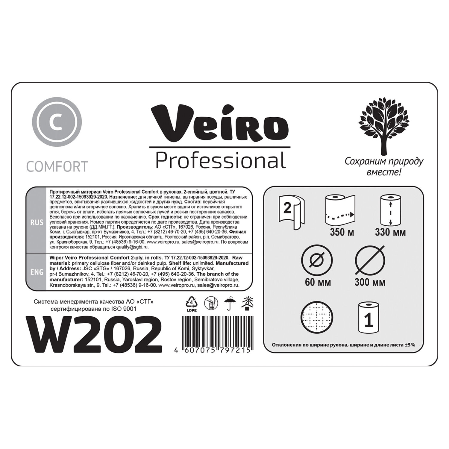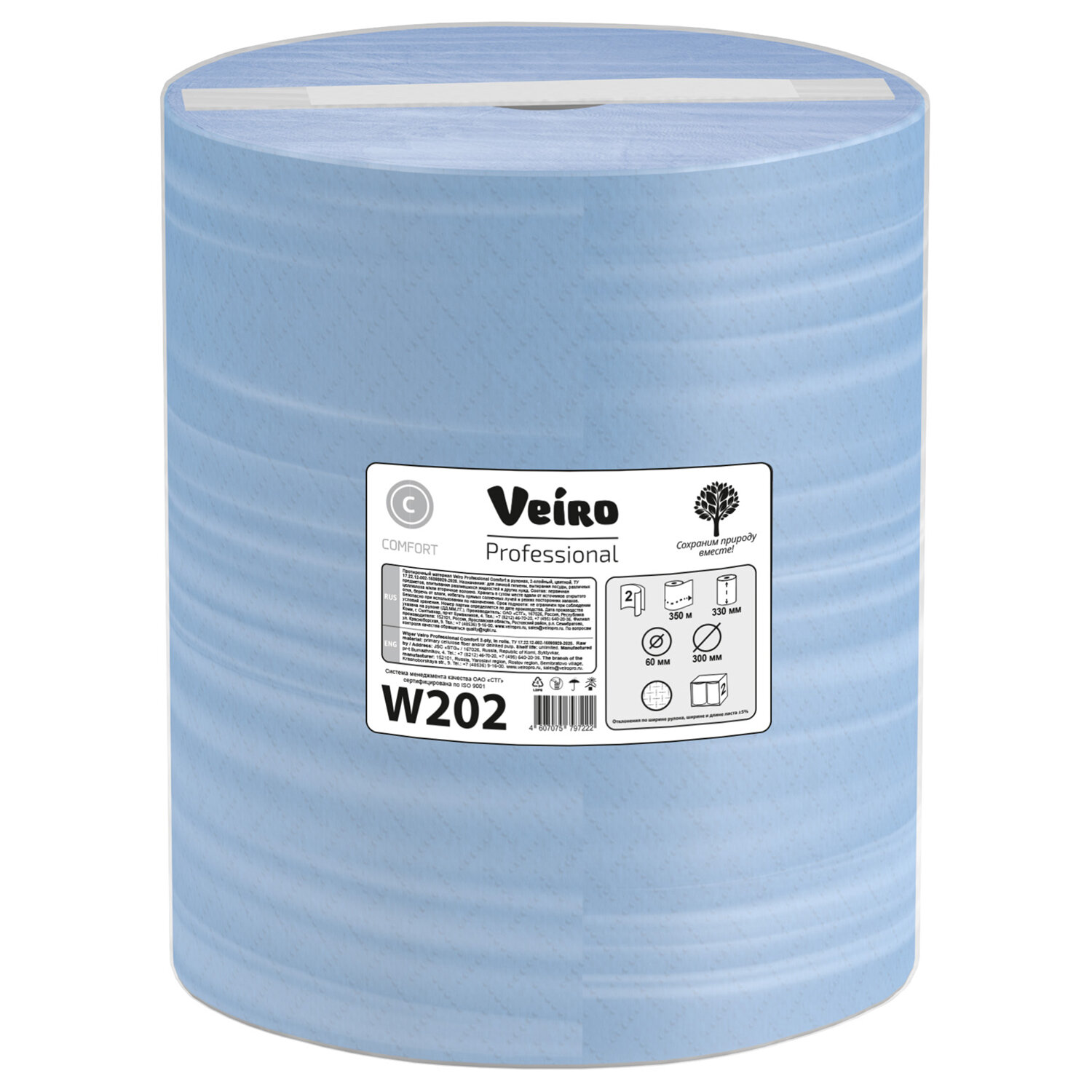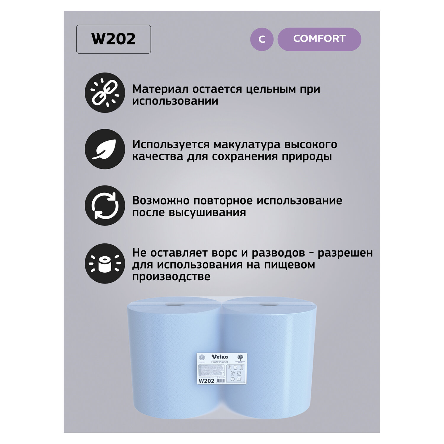 Бумага протирочная VEIRO (Система W1), КОМПЛЕКТ 2 шт., 1000 листов в рулоне, 33х35 см, 2-слойная, Comfort Код товара: 127104 3 859,47 ₽ Купить Производитель:VEIRO PROFESSIONAL Протирочные материалы VEIRO предназначены для удаления большинства типов загрязнений на производстве, станциях технического обслуживания, пищевых производствах и т.п. Бумажные протирочные материалы - отличная замена ветоши. Подходит для диспенсерной системы W1. Два слоя. В комплекте 2 рулона по 100 листов. Размер листа 33х35 см. Произведена с использованием вторичного сырья. С заботой о сохранении природных ресурсов.Производство: РоссияТип товара: бумага протирочнаяАртикул: W202Диспенсерная система: W1Серия: ComfortПерфорация: даДлина намотки: 350 мДиаметр рулона: 30 смШирина рулона: 33 смКоличество листов в рулоне/пачке: 1000Количество слоев: 2Ширина листа: 33 смДлина листа: 35 смЦвет*: голубойЦвет: голубойНаличие втулки: даВид сырья: облагороженная макулатураКоличество в комплекте: 2 шт.Вес: 9,23 кгРазмер упаковки: 28.5 × 58.5 × 34 смОбъём: 0.0567 м3Промежуточная упаковка: 1 штТранспортная упаковка: 1 штШтрих-код: 4607075797222 Файлы Приложение-1.pdf Приложение-2.pdf Сертификат-1.jpg Сертификат-2.jpg Сертификат-3.jpg Сертификат-4.jpg