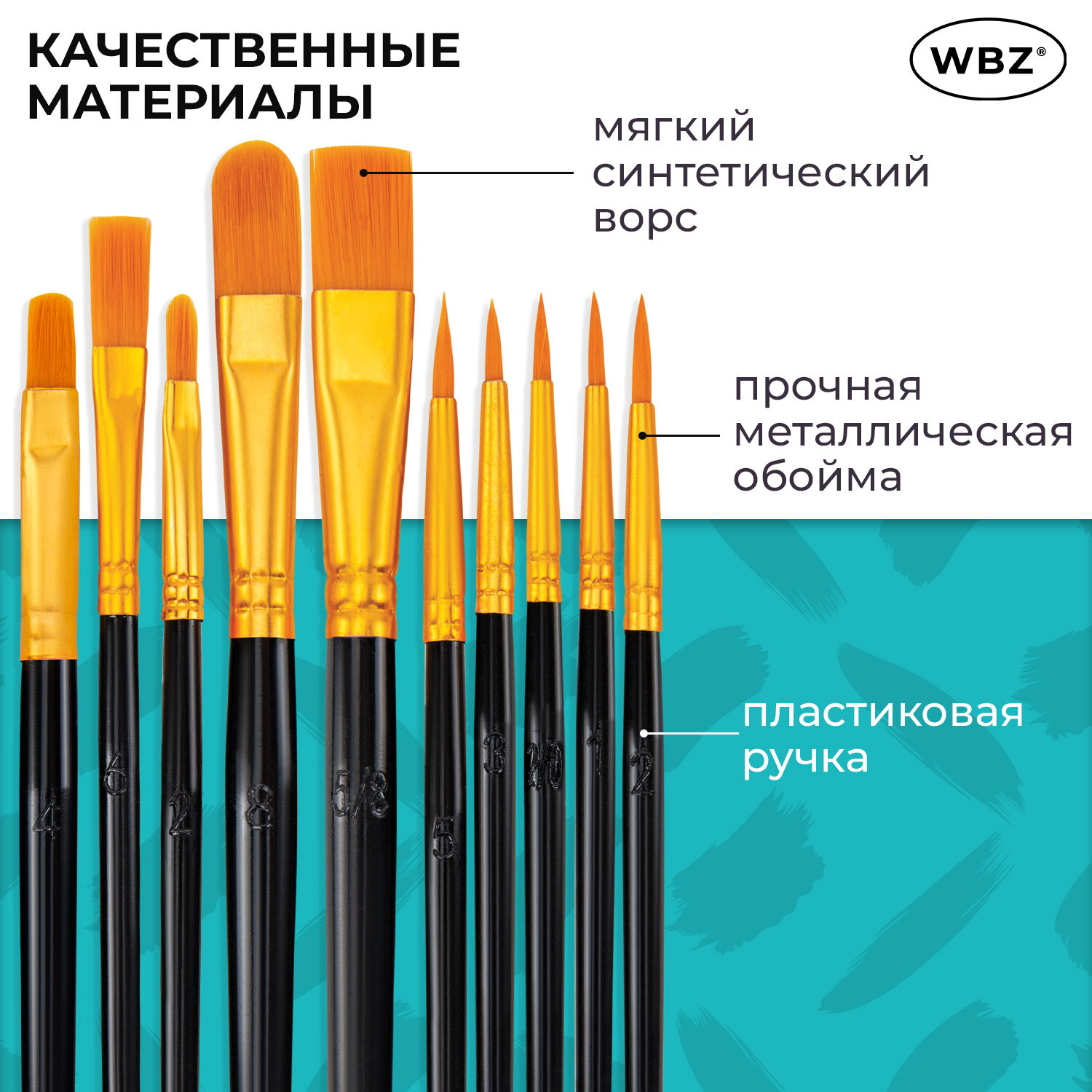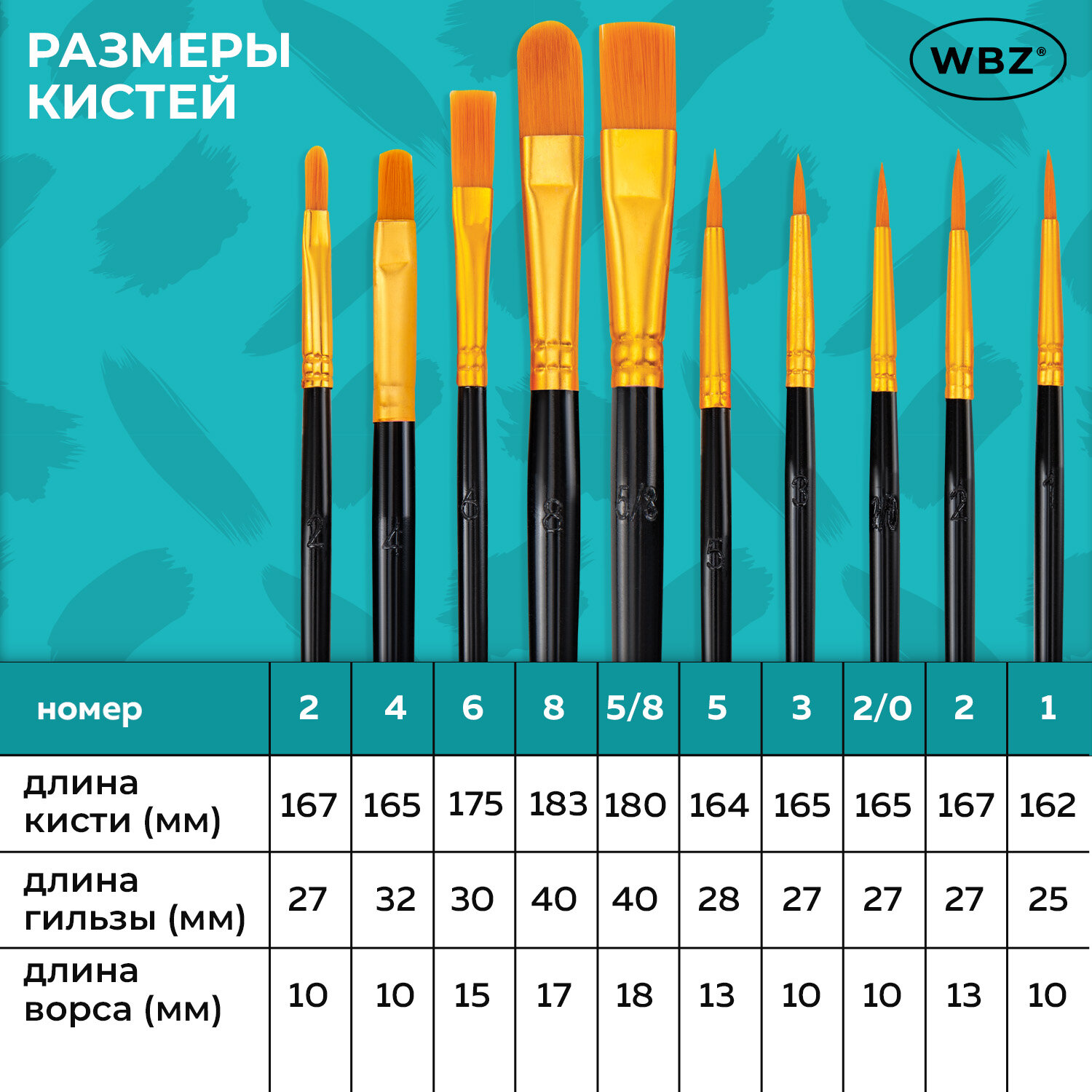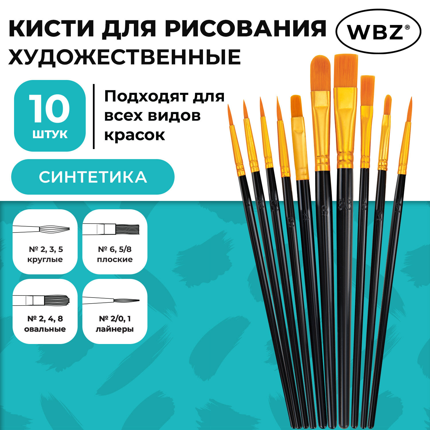 Кисти набор 10 шт., синтетика, черные, № 2/0-8 (Круглые; Овальные; Плоские; Лайнеры), WBZ (ВБЗ) Код товара: 201084 201,45 ₽ Купить Производитель:WBZ Набор кистей WBZ обладает превосходным внешним видом и характеристиками. Он станет хорошим подарком человеку, который увлекается живописью. Упругий синтетический ворс кистей не теряет форму при намокании и имеет повышенную износостойкость. Кисти WBZ изготовлены из высококачественной синтетики. Отличаются универсальностью в использовании, обусловленной упругостью ворса и прекрасными впитывающими свойствами пучка. Ручка из древесины покрыта лаком, что защищает ее от воздействия красок и влаги. В набор входят 10 кистей различной формы. Форма пучка: круглые – № 2, 3, 5; овальные – 2, 4, 8; плоские – № 6, 5/8; лайнеры – № 2/0, 1. Номер кисти соответствует реальной ширине пучка в миллиметрах. Упаковка – ПВХ-пакет с европодвесом.Производство: КитайКоличество кистей в наборе: 10 шт.Тип кисти: круглая, плоская, овальная, лайнерНомер кисти: 1, 2, 2/0, 3, 4, 5/8, 6, 8Ворс: синтетикаРучка: стандартнаяУпаковка: пакет с европодвесомСерия: -Цвет: черныйВес: 39 грРазмер упаковки: 0.8 × 20.8 × 7.3 смОбъём: 0.0001 м3Промежуточная упаковка: 300 штТранспортная упаковка: 300 штШтрих-код: 4606224472867 Сертификат-1.jpg Сертификат-2.jpg Сертификат-3.jpg