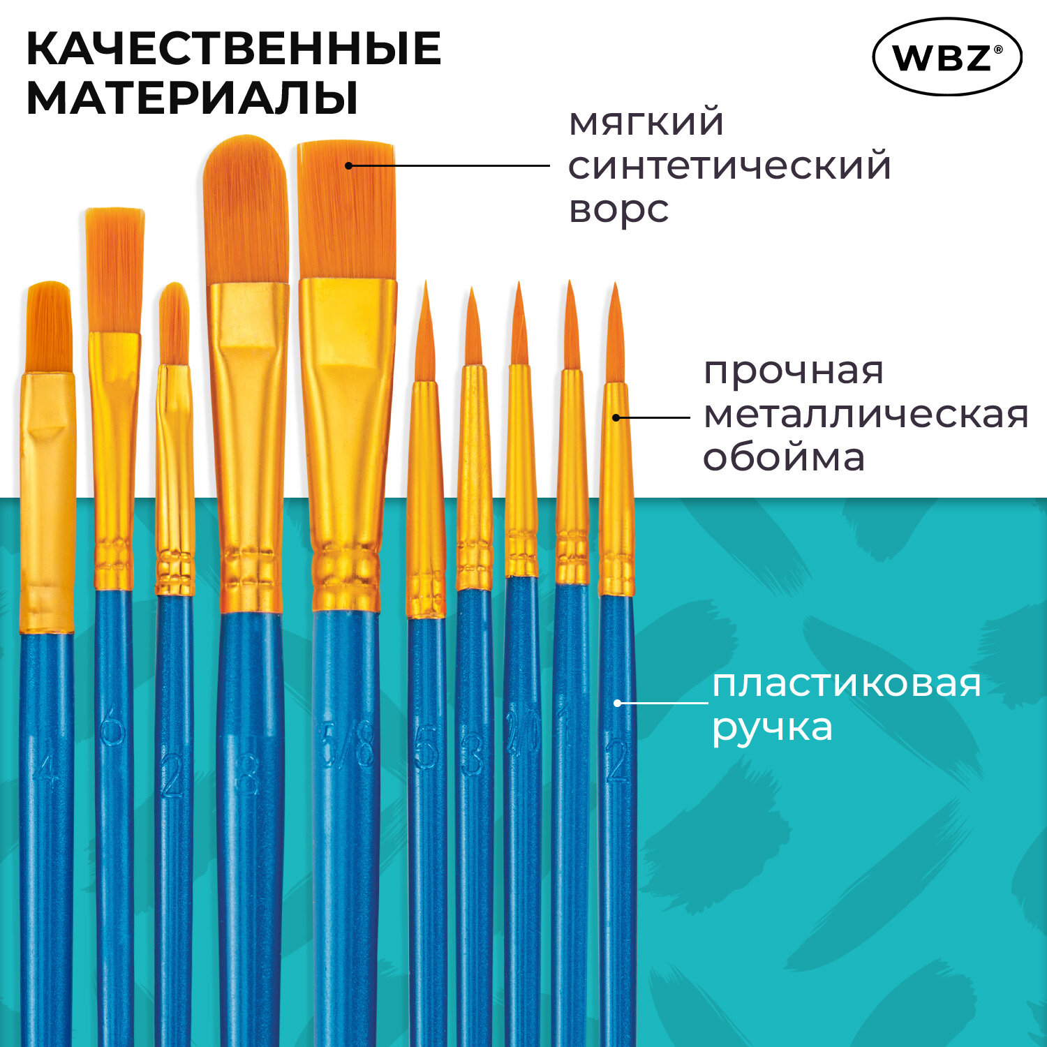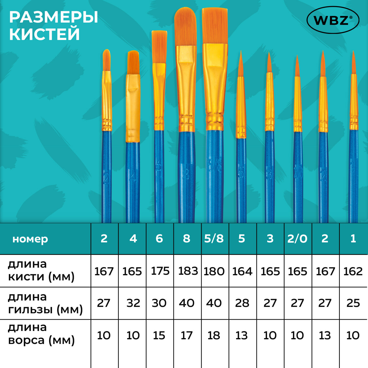 Кисти набор 10 шт., синтетика, синие, № 2/0-8 (Круглые; Овальные; Плоские; Лайнеры), WBZ (ВБЗ) Код товара: 201085 201,45 ₽ Купить Производитель:WBZ Набор кистей WBZ обладает превосходным внешним видом и характеристиками. Он станет хорошим подарком человеку, который увлекается живописью. Упругий синтетический ворс кистей не теряет форму при намокании и имеет повышенную износостойкость. Кисти WBZ изготовлены из высококачественной синтетики. Отличаются универсальностью в использовании, обусловленной упругостью ворса и прекрасными впитывающими свойствами пучка. Ручка из древесины покрыта лаком, что защищает ее от воздействия красок и влаги. В набор входят 10 кистей различной формы. Форма пучка: круглые – № 2, 3, 5; овальные – 2, 4, 8; плоские – № 6, 5/8; лайнеры – № 2/0, 1. Номер кисти соответствует реальной ширине пучка в миллиметрах. Упаковка – ПВХ-пакет с европодвесом.Производство: КитайКоличество кистей в наборе: 10 шт.Тип кисти: круглая, плоская, овальная, лайнерНомер кисти: 1, 2, 2/0, 3, 4, 5, 5/8, 6, 8Ворс: синтетикаРучка: стандартнаяУпаковка: пакет с европодвесомСерия: -Цвет: темно-синийВес: 39 грРазмер упаковки: 0.9 × 20.8 × 7.3 смОбъём: 0.0001 м3Промежуточная упаковка: 300 штТранспортная упаковка: 300 штШтрих-код: 4606224472874 Сертификат-1.jpg Сертификат-2.jpg Сертификат-3.jpg