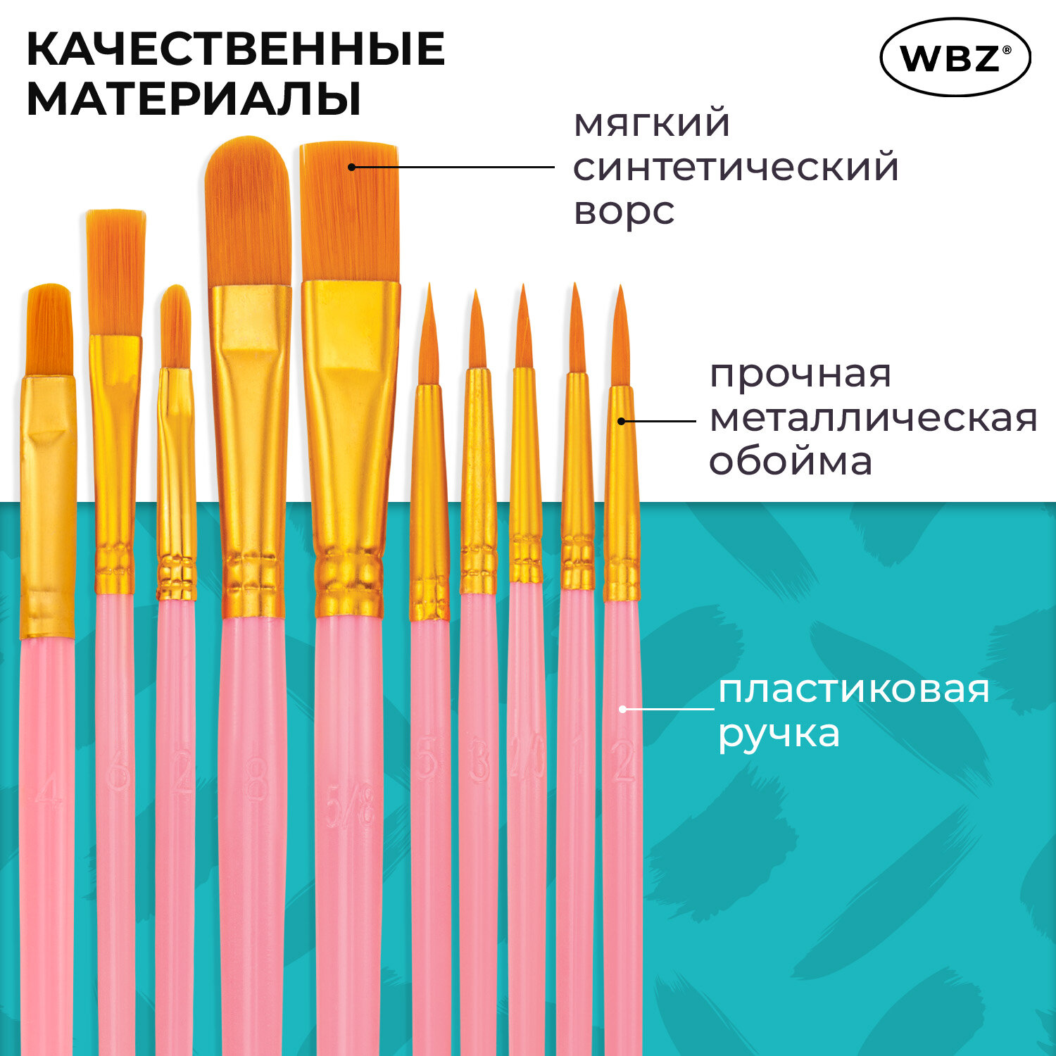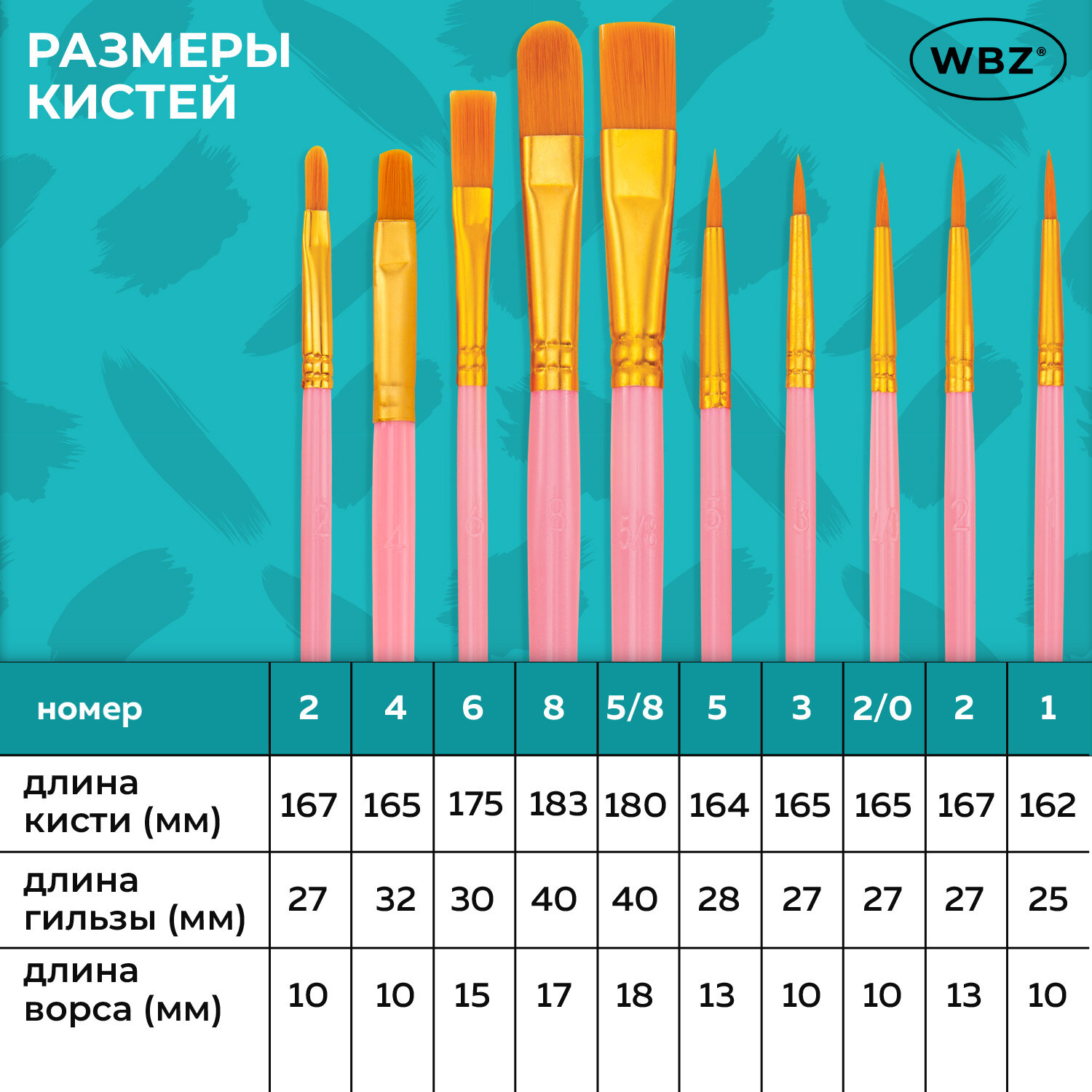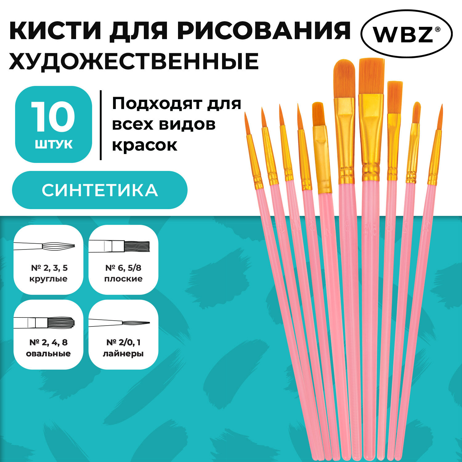 Кисти набор 10 шт., синтетика, розовые, № 2/0-8 (Круглые; Овальные; Плоские; Лайнеры), WBZ (ВБЗ) Код товара: 201088 201,45 ₽ Купить Производитель:WBZ Набор кистей WBZ обладает превосходным внешним видом и характеристиками. Он станет хорошим подарком человеку, который увлекается живописью. Упругий синтетический ворс кистей не теряет форму при намокании и имеет повышенную износостойкость. Кисти WBZ изготовлены из высококачественной синтетики. Отличаются универсальностью в использовании, обусловленной упругостью ворса и прекрасными впитывающими свойствами пучка. Ручка из древесины покрыта лаком, что защищает ее от воздействия красок и влаги. В набор входят 10 кистей различной формы. Форма пучка: круглые – № 2, 3, 5; овальные – 2, 4, 8; плоские – № 6, 5/8; лайнеры – № 2/0, 1. Номер кисти соответствует реальной ширине пучка в миллиметрах. Упаковка – ПВХ-пакет с европодвесом.Производство: КитайКоличество кистей в наборе: 10 шт.Тип кисти: круглая, плоская, овальная, лайнерНомер кисти: 2, 2/0, 3, 4, 5, 5/8, 6, 8Ворс: синтетикаРучка: стандартнаяУпаковка: пакет с европодвесомСерия: -Цвет: розовыйВес: 39 грРазмер упаковки: 1 × 21 × 7.3 смОбъём: 0.0001 м3Промежуточная упаковка: 300 штТранспортная упаковка: 300 штШтрих-код: 4606224472904 Сертификат-1.jpg Сертификат-2.jpg Сертификат-3.jpg
