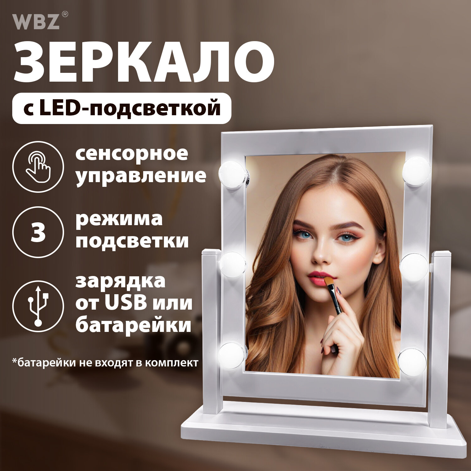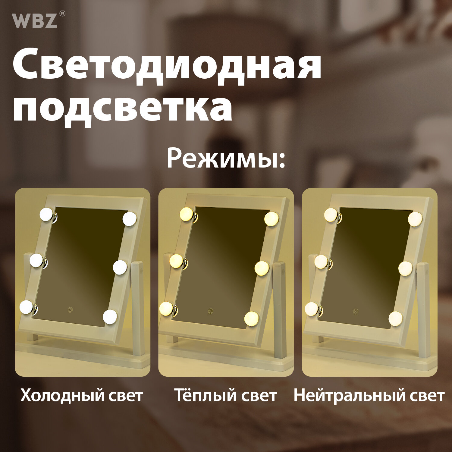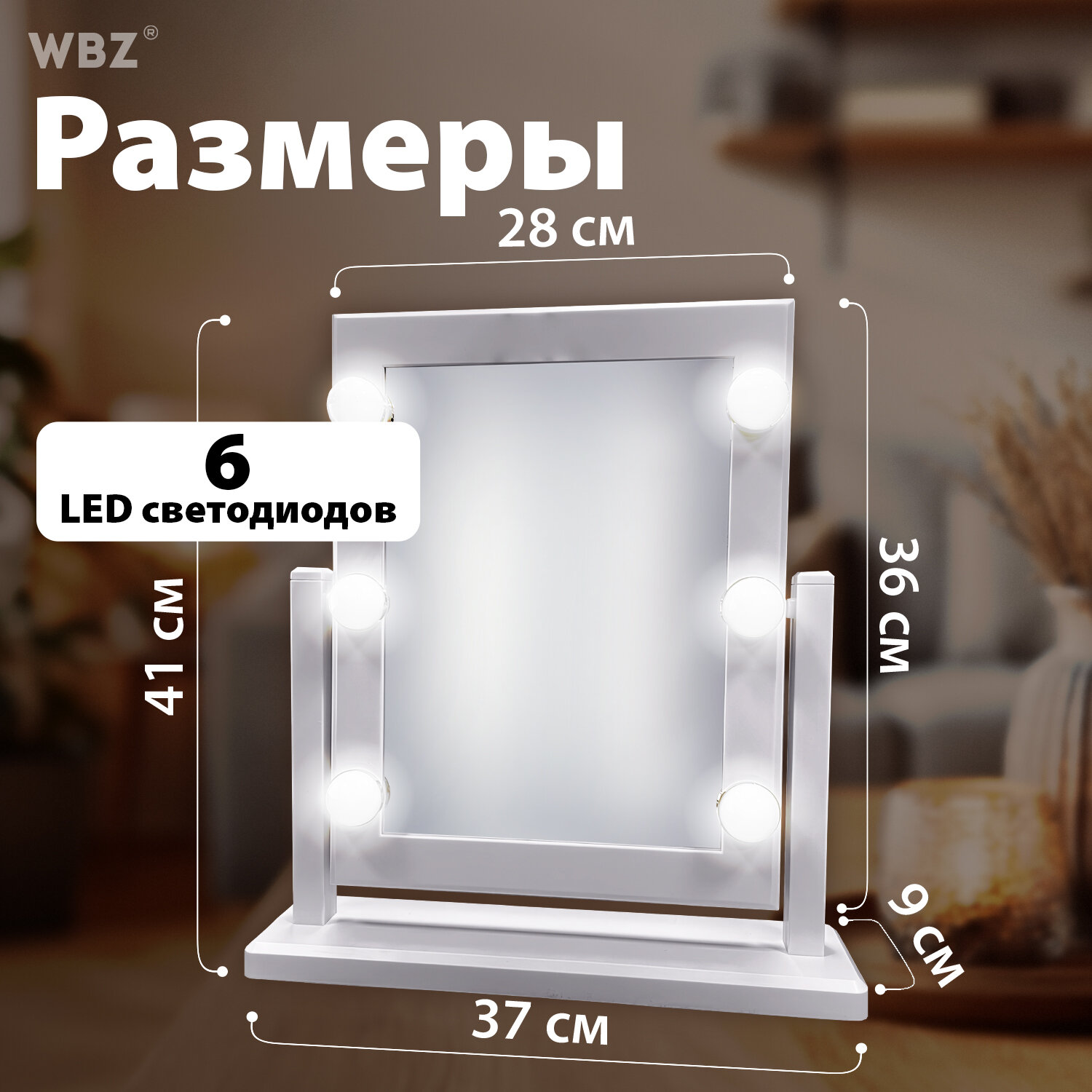 Зеркало для макияжа гримерное, 6 LED-ламп, 3 режима свечения, размер 21х29 см, работа от USB или 4хAA, цвет белый, WBZ (ВБЗ) Код товара: 609334 1 807,35 ₽ Купить Производитель:WBZ Гримерное зеркало с LED-подсветкой WBZ – это красивый и практичный аксессуар, которому будет рада любая женщина. Три режима подсветки позволят подобрать оптимальный свет для нанесения макияжа и проведения процедур по уходу за лицом. Зеркало с LED-подсветкой, которая работает при помощи сенсорного управления. 6 LED-ламп расположены поверх пластиковой оправы с двух противоположных сторон от полотна зеркала. Кратковременное нажатие на кнопку сенсорного управления обеспечивает включение, выключение, а также выбор света, который может быть белым, тёплым и холодным. Зеркало в широкой пластиковой оправе, имеет устойчивую подставку. Благодаря подвижному соединению с опорой зеркало может вращаться на 360 градусов, позволяя регулировать угол наклона. Может работать от 4-х батареек АА (не входят в комплектацию) или через USB-кабель (входит в комплектацию). С обратной стороны зеркала есть кнопка включения/выключения питания, а также отсек для батареек и порт для USB-кабеля. Размеры зеркального полотна – 29х21 см. Размеры зеркала в раме – 36х28 см. Габариты зеркала с подставкой: высота – 41 см, длина – 37 см, ширина – 9 см. Количество LED-ламп – 6. Длина USB-кабеля – 80 см. Цвет – белый. Упаковка – белый гофрокороб с одноцветной печатью.Производство: КитайТип размещения: настольноеФорма: прямоугольнаяВысота: 29 смШирина: 21 смВращающееся: даОбъем аккумулятора: работа от сети, 4 ААМатериал оправы: пластикЦвет оправы*: белыйЦвет оправы: белыйВес: 2,02 кгРазмер упаковки: 12.2 × 44.4 × 40.9 смОбъём: 0.0265 м3Промежуточная упаковка: 4 штТранспортная упаковка: 4 штШтрих-код: 4606224440385 Файлы Сертификат-1.jpg Сертификат-2.jpg Сертификат-3.jpg Сертификат-4.jpg Сертификат-5.jpg