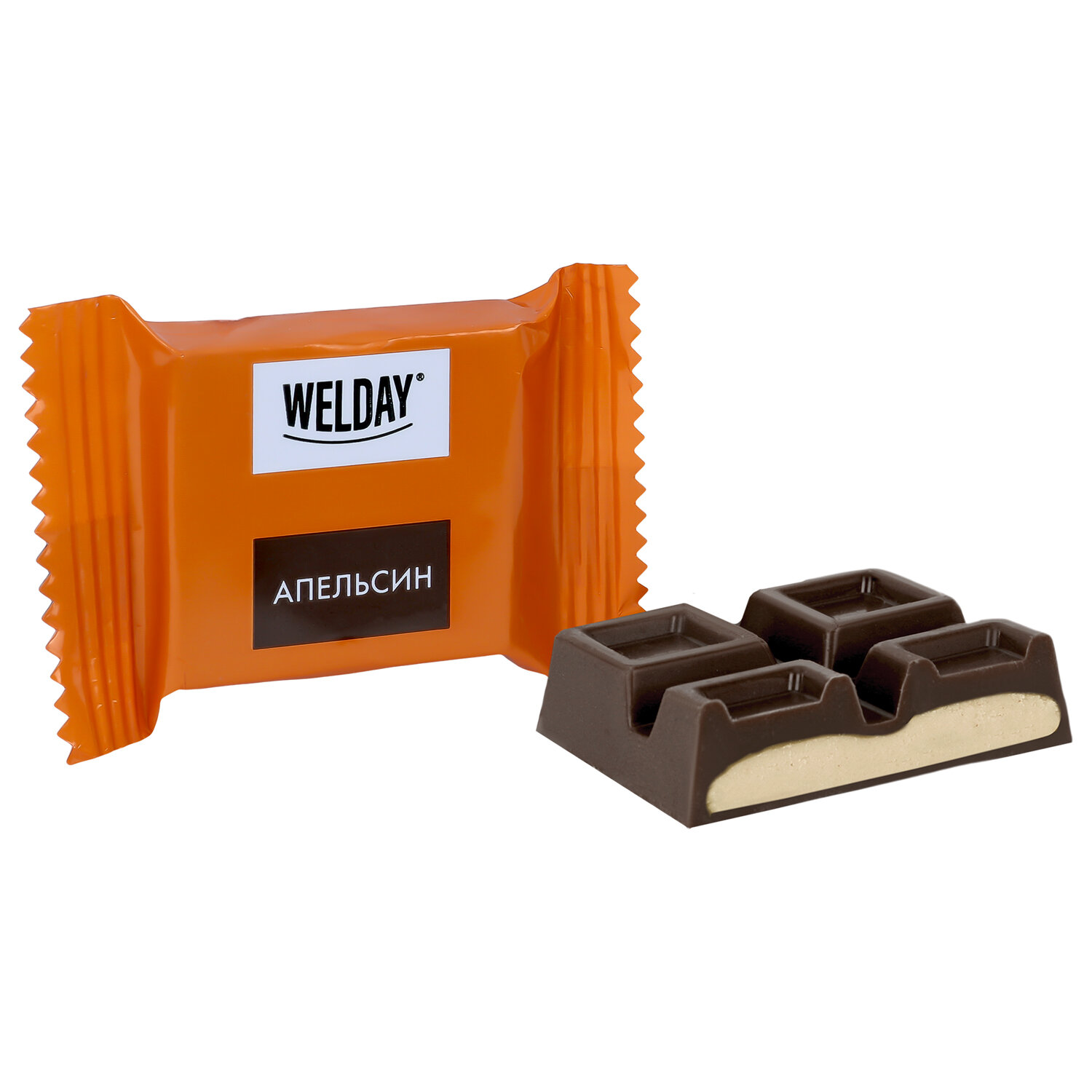 Темный шоколад с апельсиновой начинкой. Состав: темная шоколадная масса (сахар, какао тертое, масло какао, эмульгаторы: соевый лецитин, E476; ароматизатор: ванилин), сахар, растительный жир (пальмовое масло, пальмоядровое масло, эмульгатор соевый лецитин, антиокислитель концентрат смеси токоферолов), молоко сухое цельное, кешью обжаренный тертый, лактоза, сухая молочная сыворотка, апельсин сублимационной сушки (порошок), сливки сухие, ароматизаторы, эмульгатор: соевый лецитин, антиокислители: аскорбиновая кислота, Е307. Может содержать незначительное количество других орехов (фундука, миндаля, грецкого ореха, пекана, фисташки), арахиса, пшеничного глютена и яичных продуктов.
