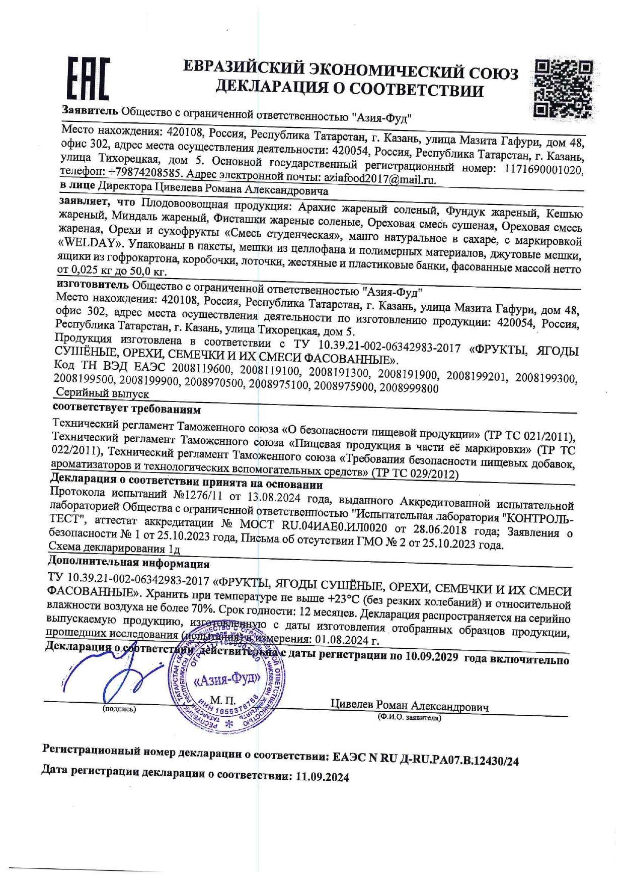 Арахис жареный соленый WELDAY (ВЭЛДЭЙ) 1 кг Код товара: 622468 481,25 ₽ Купить Производитель:WELDAY Орехи и сухофрукты являются богатым источником энергии для нашего организма, содержат много полезных питательных веществ и витаминов. Их можно использовать как полезный и вкусный перекус в течение рабочего дня. Обжаренный арахис сохраняет все содержащиеся в нем полезные вещества и легко усваивается организмом. В состав арахиса входят витамины группы В, Е, С, минералы магний, кальций, железо, натрий, цинк, антиоксиданты, ненасыщенные жирные кислоты, растительный белок и клетчатка. Благодаря обжарке в арахисе увеличивается количество важного антиоксиданта полифенола. Состав: арахис обжаренный, соль пищевая. Страна происхождения – Бразилия. Вес – 1 кг. Упаковка – прозрачный пакет из полипропилена. Условия хранения: при температуре не более +25°C и относительной влажности не более 75%. Срок годности – 12 месяцев.Производство: РоссияТип продукта: арахисВес нетто: 1000 гОсобенности: жареные, соленыеВкус: арахисТип упаковки: пакетСрок годности: 12 мес.Фирма-производитель: АЗИЯ-ФУДСрок годности: 12 месВес: 1,05 кгРазмер упаковки: 6.2 × 18.3 × 17.3 смОбъём: 0.0028 м3Промежуточная упаковка: 8 штТранспортная упаковка: 8 штШтрих-код: 4606224380346 Сертификат-1.jpg Сертификат-2.jpg Сертификат-3.jpg